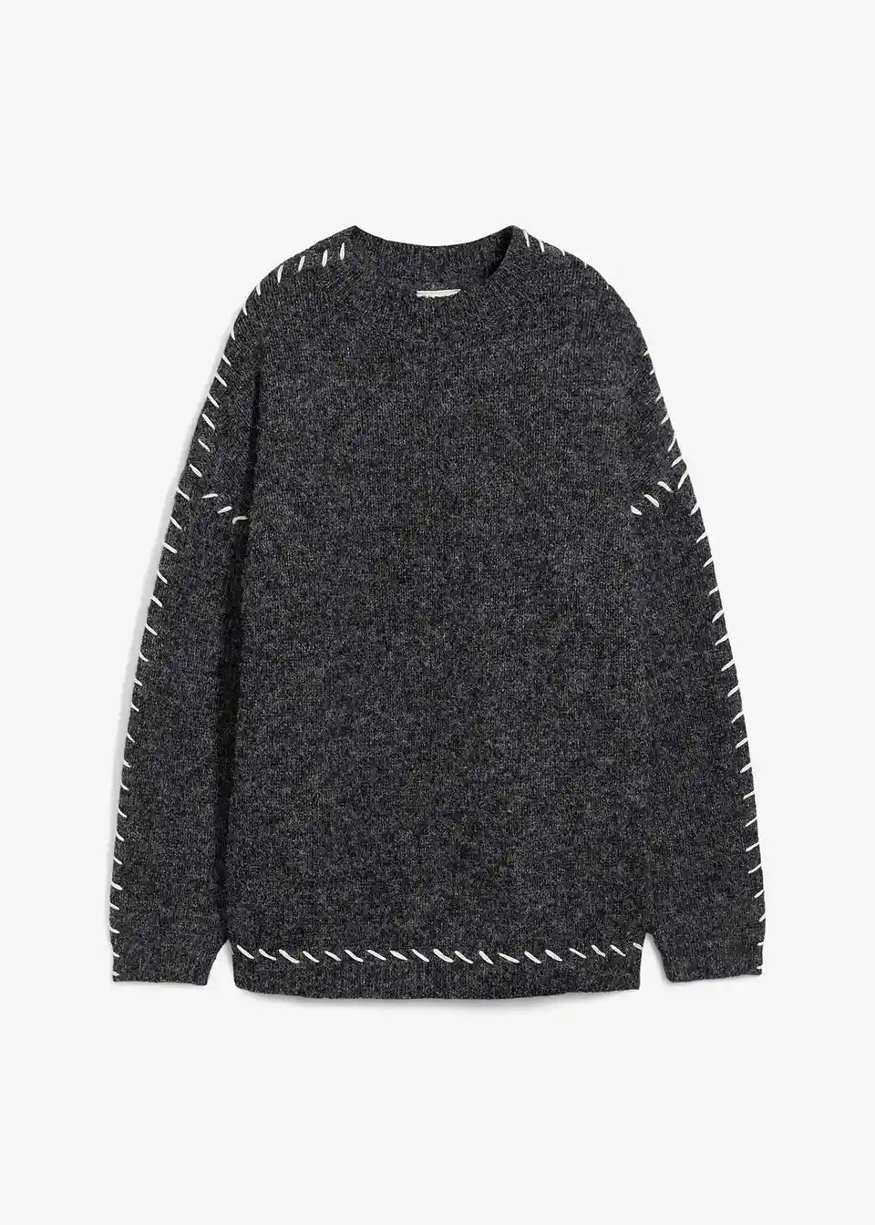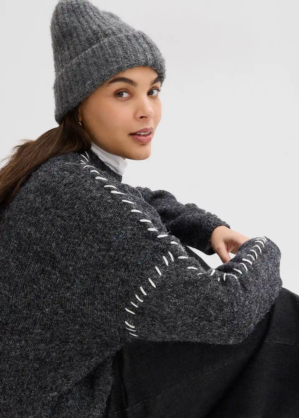 Pletena majica u dužini koja prekriva bokove. Model s okruglim izrezom, spuštenih ramena i detaljem kontrastnog šava.
