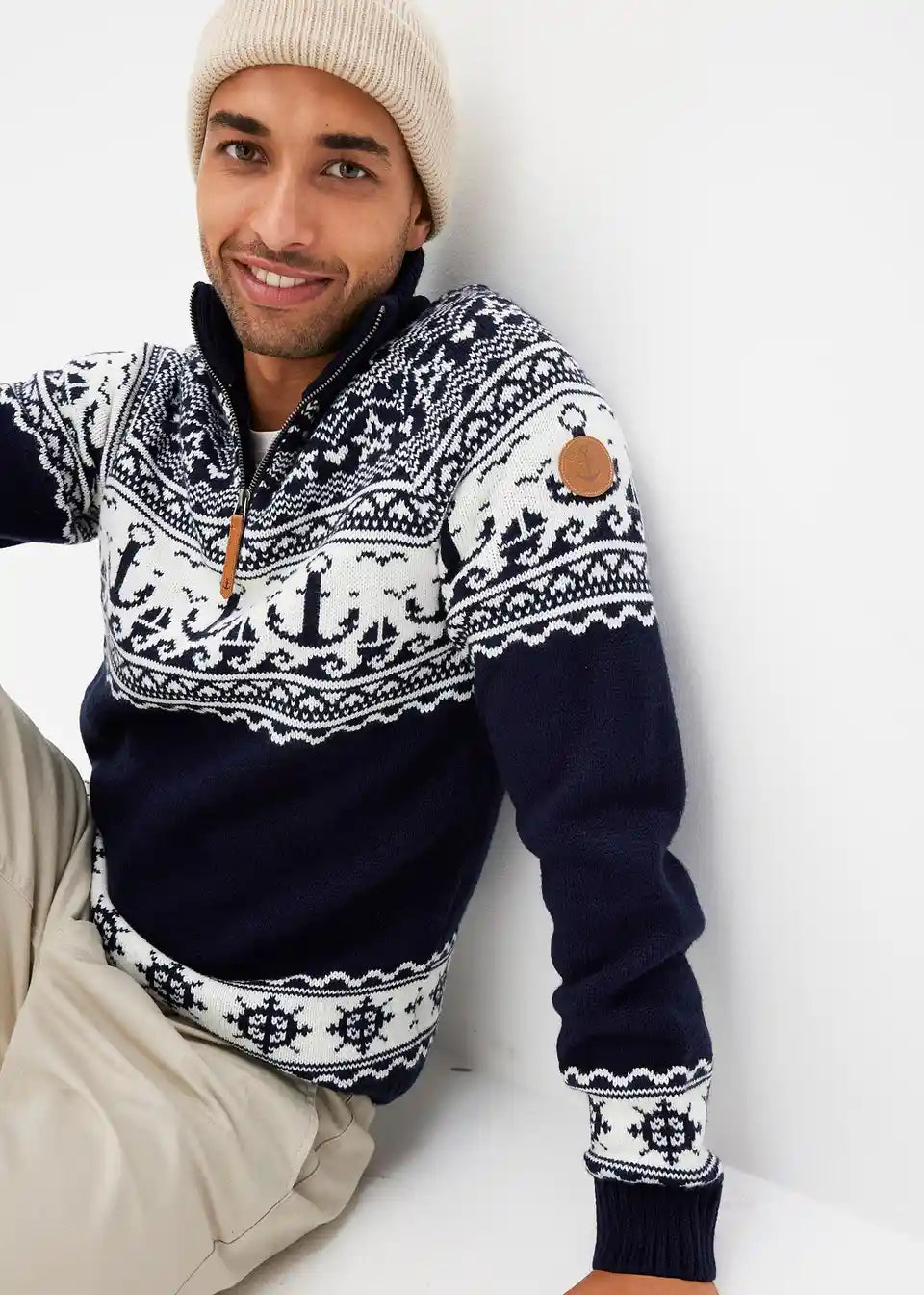 Nordijski pulover s mornarskim motivom i visokim ovratnikom s patentnim zatvaračem
