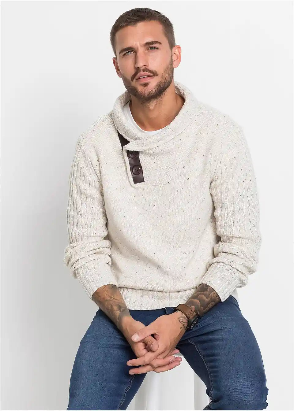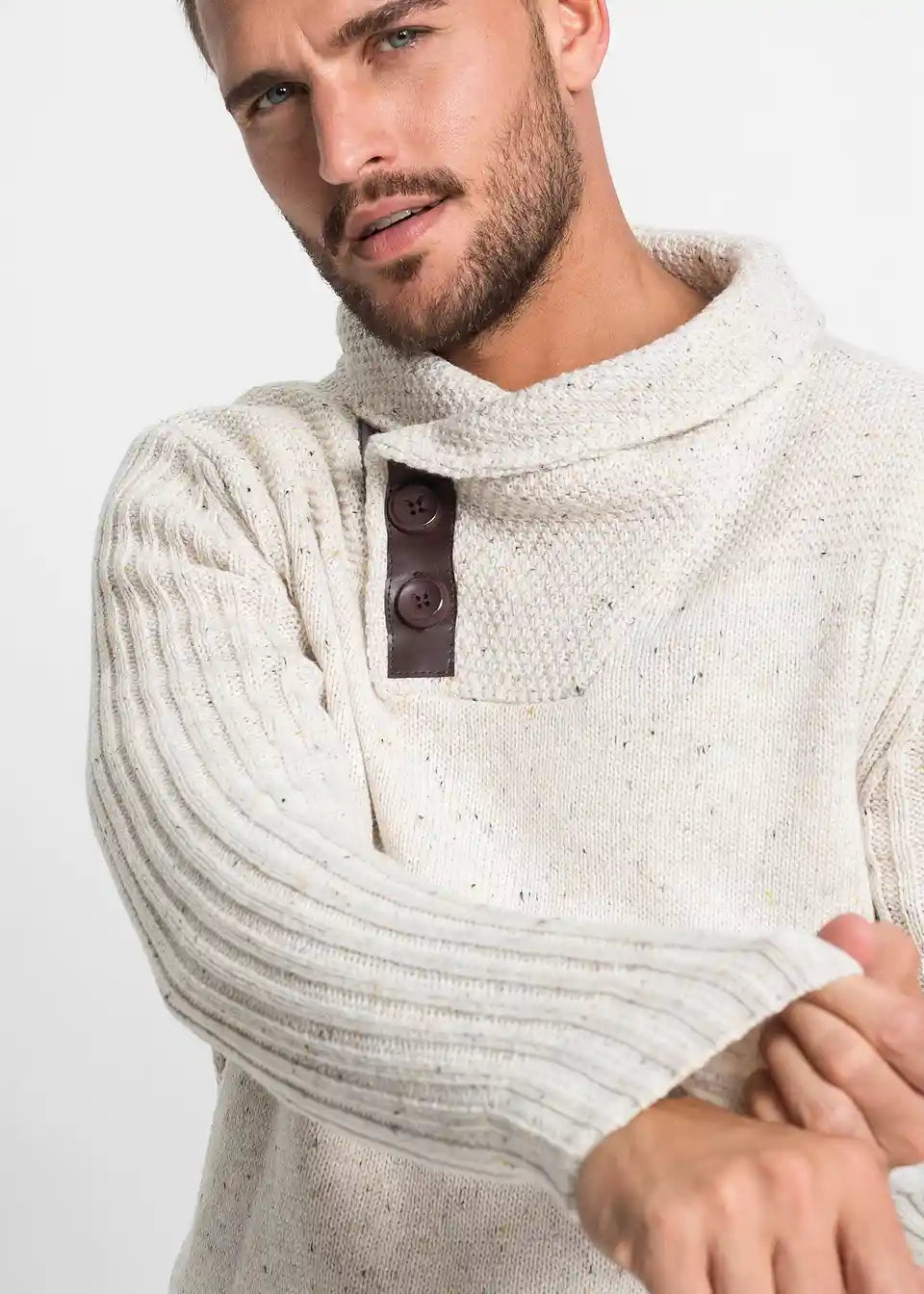 Izrađen od različitih struktura pletiva. S kopčanjem na gumb na ovratniku.