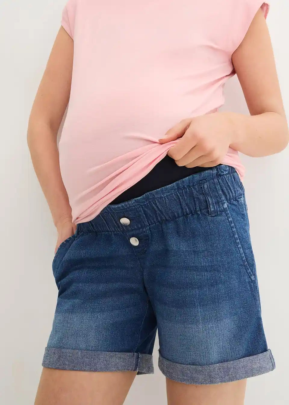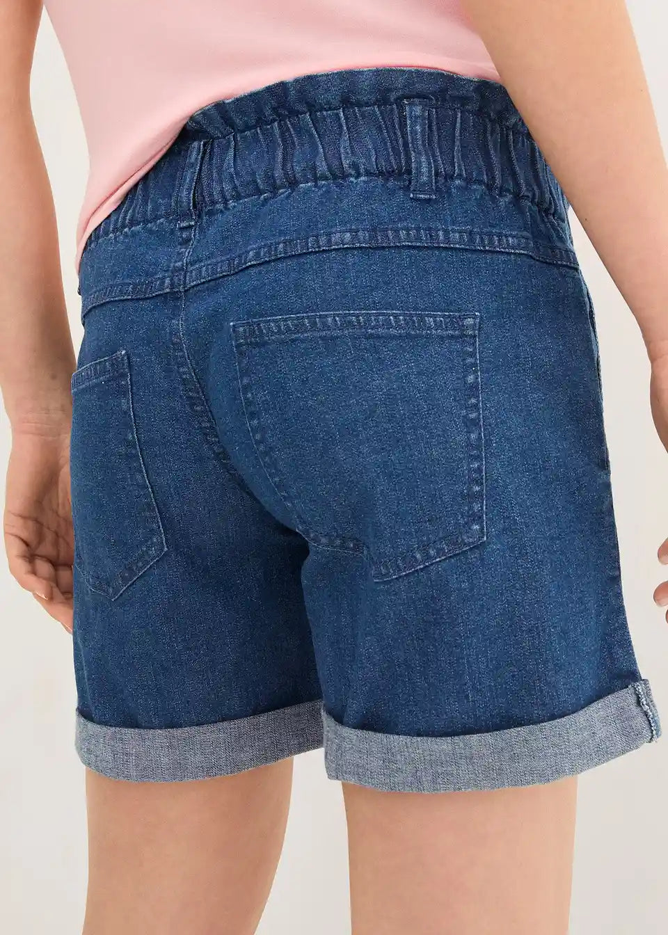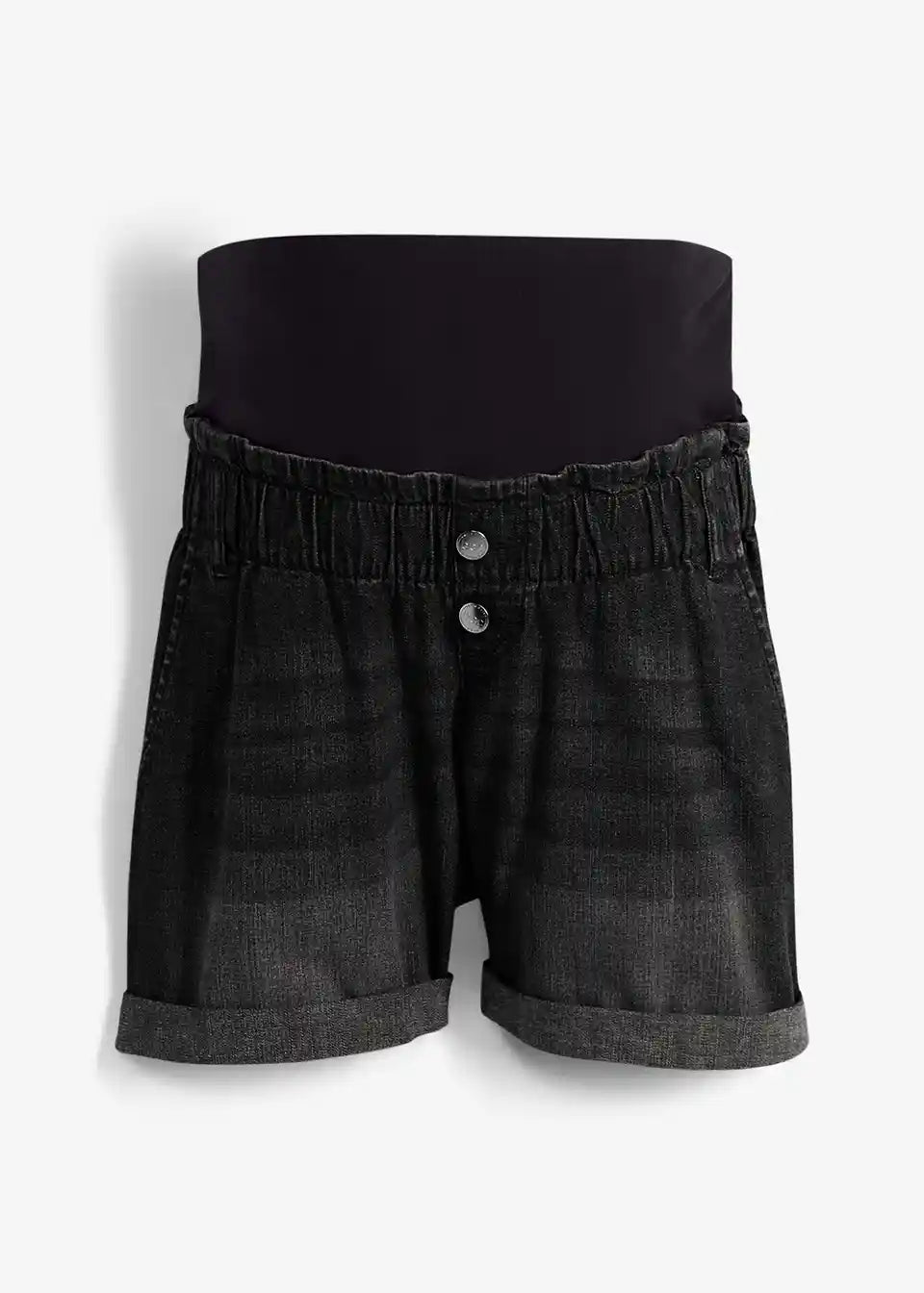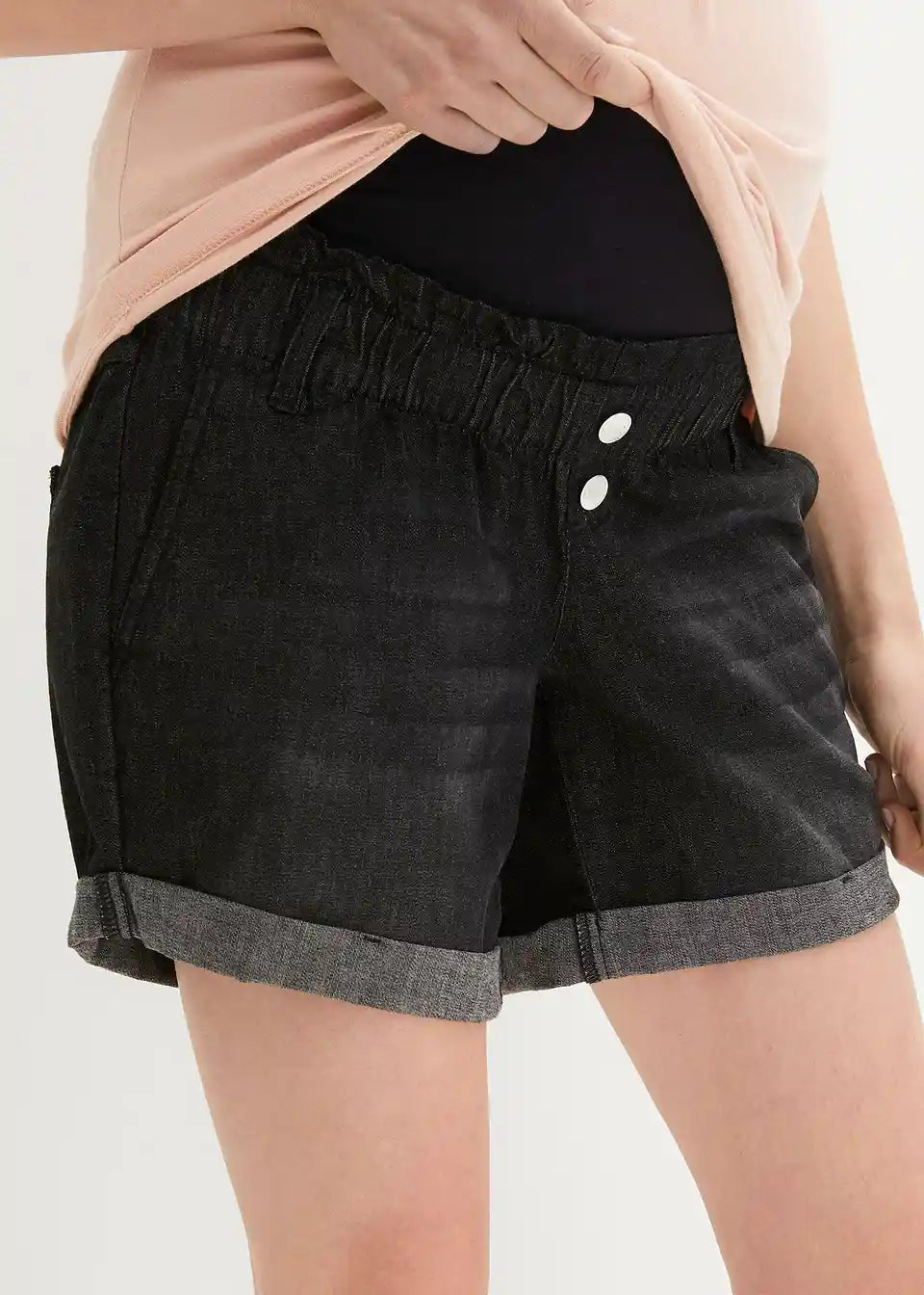 Zahvaljujući elastičnom materijalu i pojasu za trbuh, ove Paperbag traper kratke hlače prilagođavaju se rastućem trbuhu i mogu se nositi tijekom cijele trudnoće.