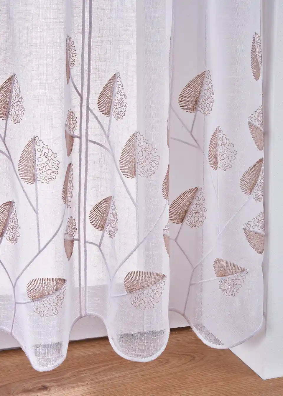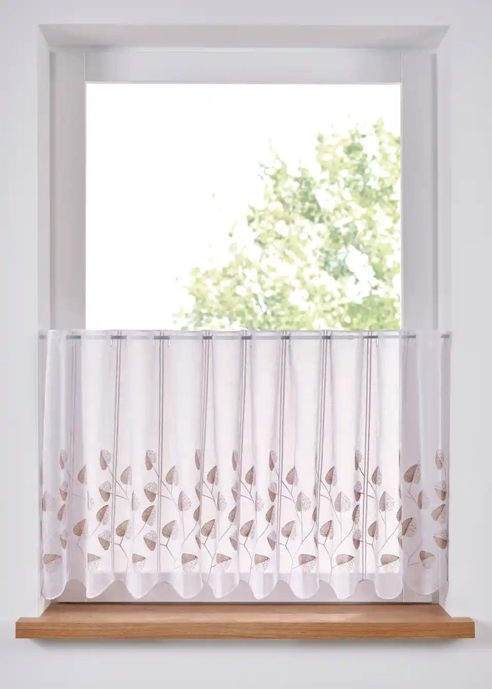Jednostavna kuhinjska zavjesa sa vezom diskretno ukrašava tvoj kuhinjski prozor.