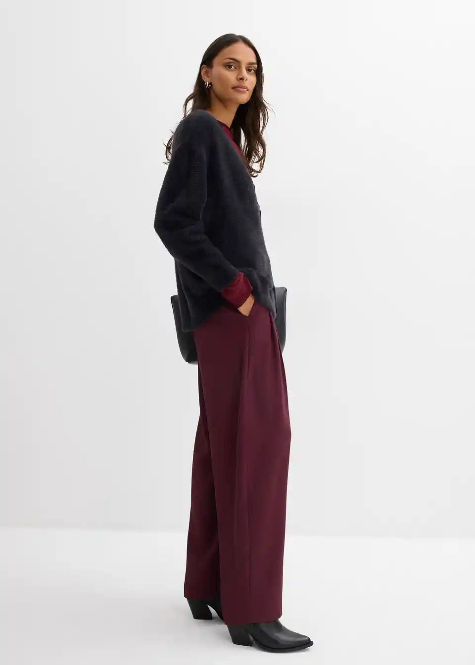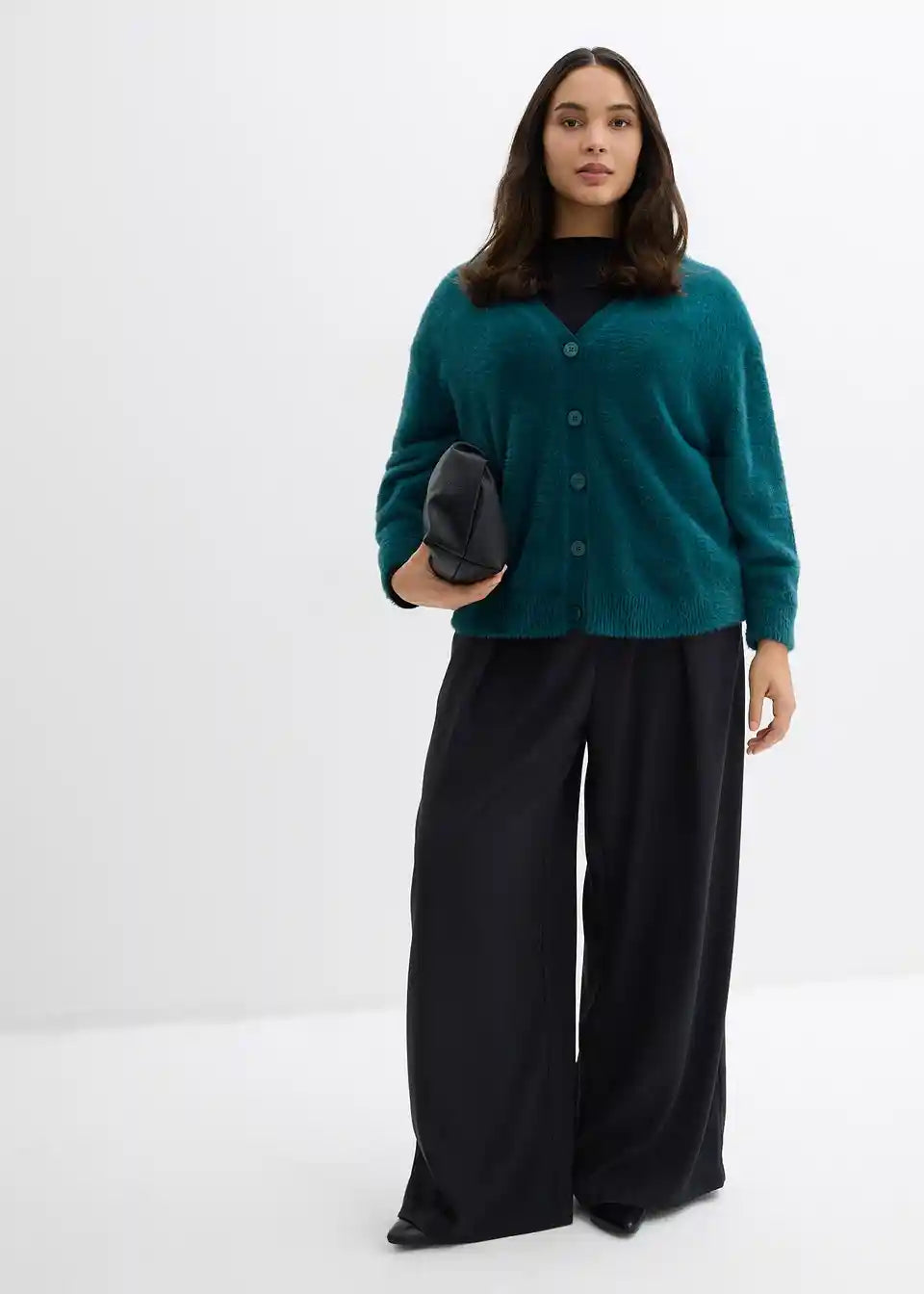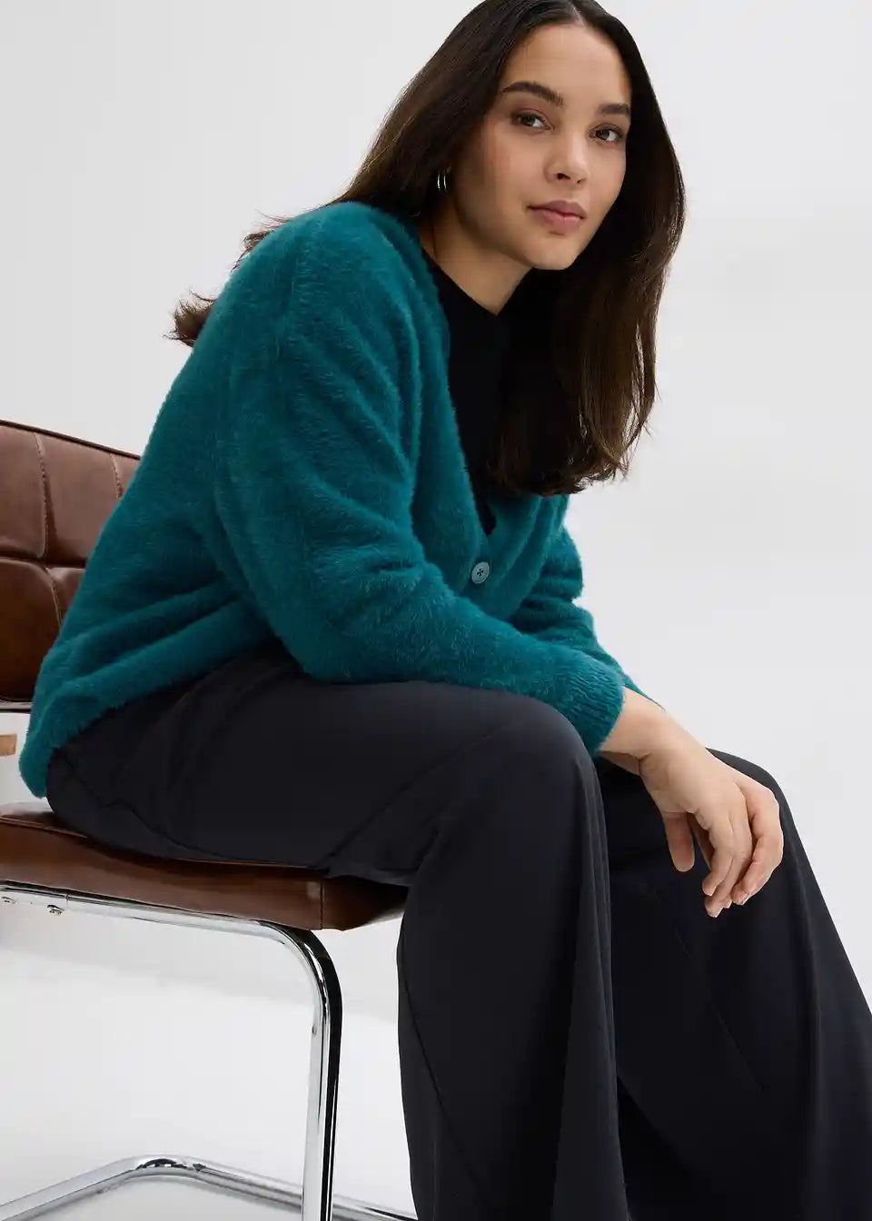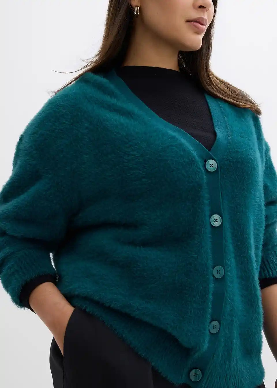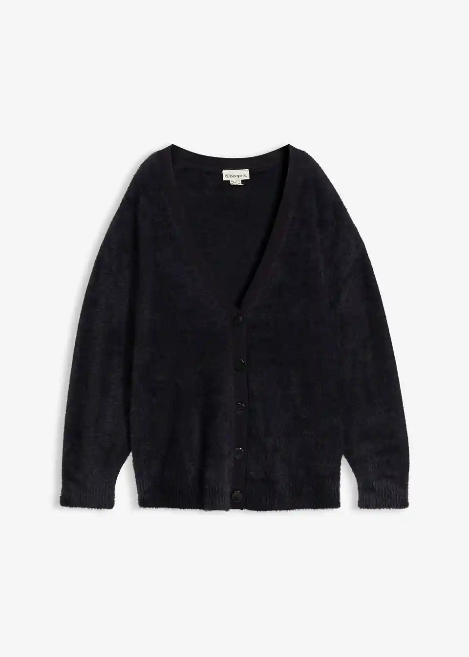 Dugi kardigan od perjastog prediva s dugim rukavima i prednjim kopčanjem na gumbe