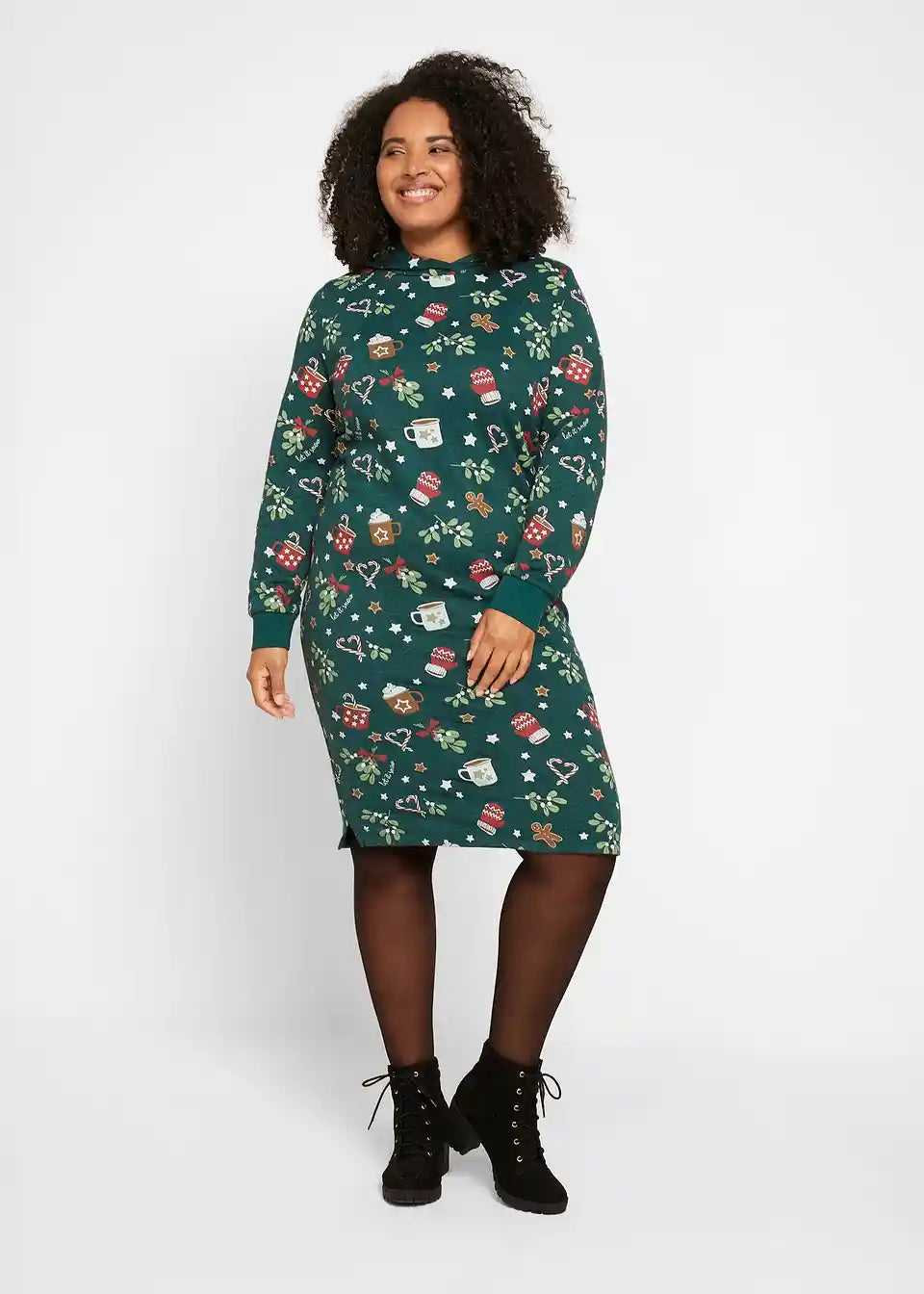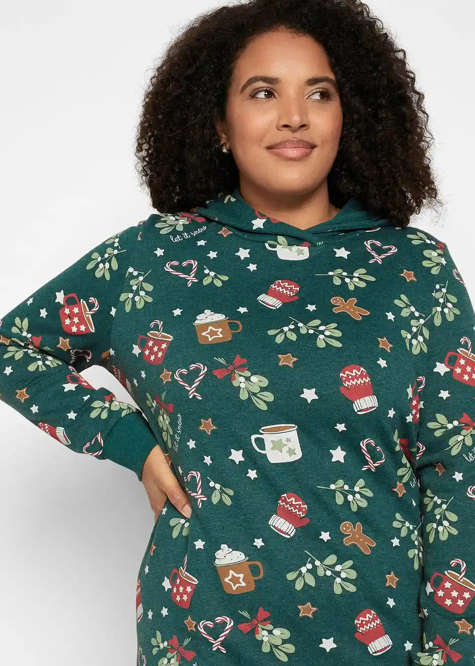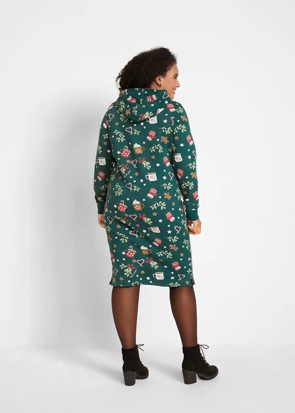 Božićno tiskana sweat haljina s kapuljačom i bočnim prorezima