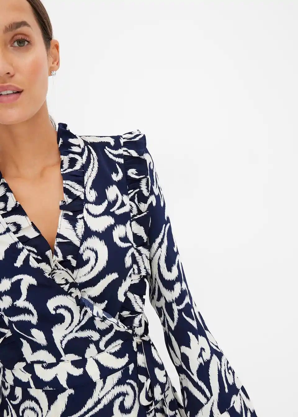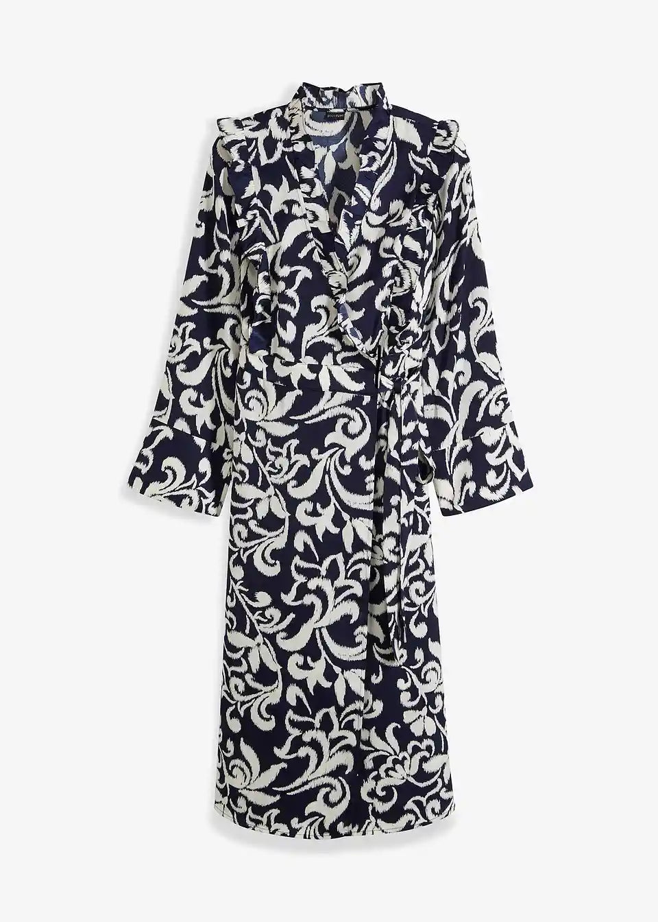 moderna satenska preklopna haljina s volanima na ramenima