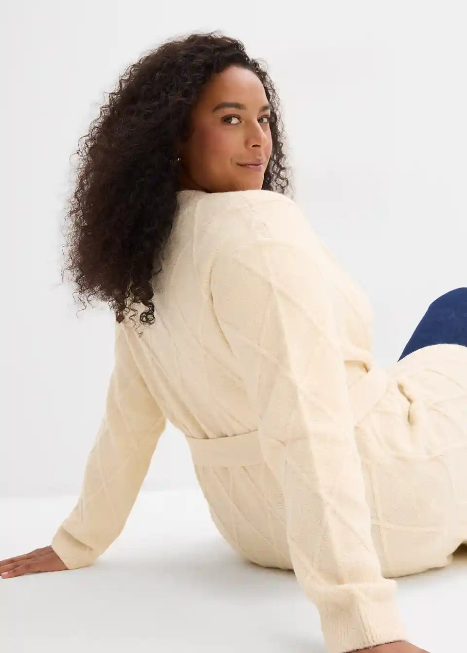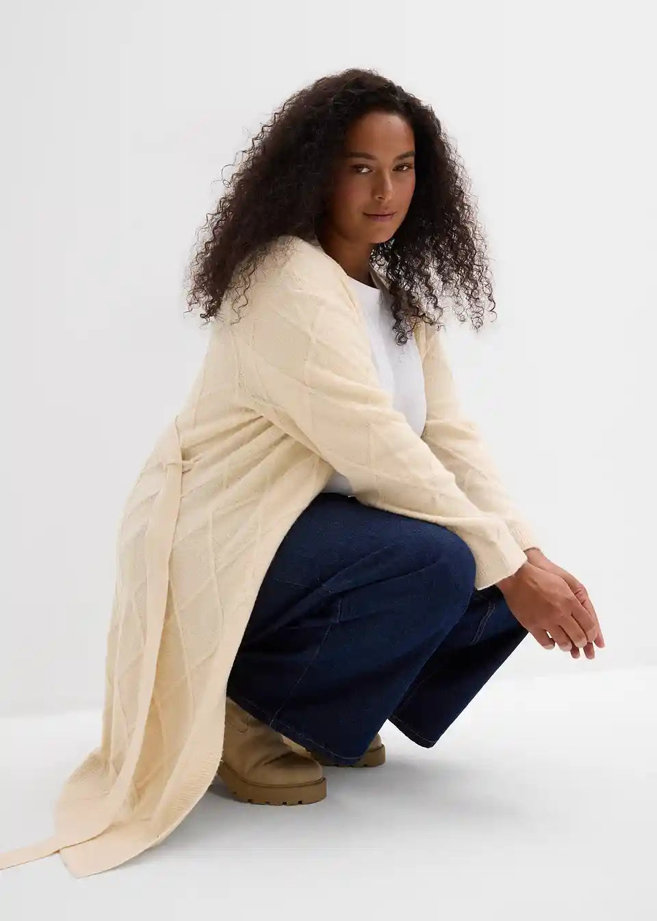 Duga pletena jakna od pletenice. Model s opuštenim ramenima i povezom za vezanje u struku.