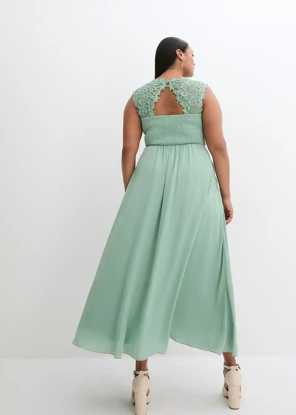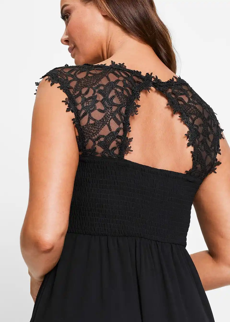 Elegantna večernja haljina s prekrasnom čipkom u gornjem dijelu, straga s elegantnim otvorom i elastikom na smock način