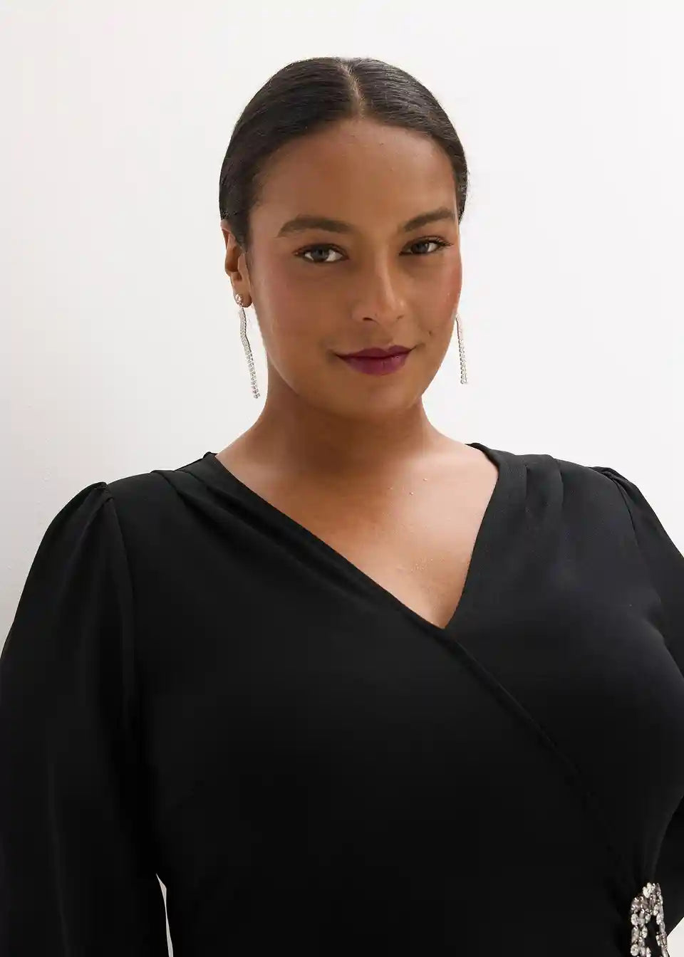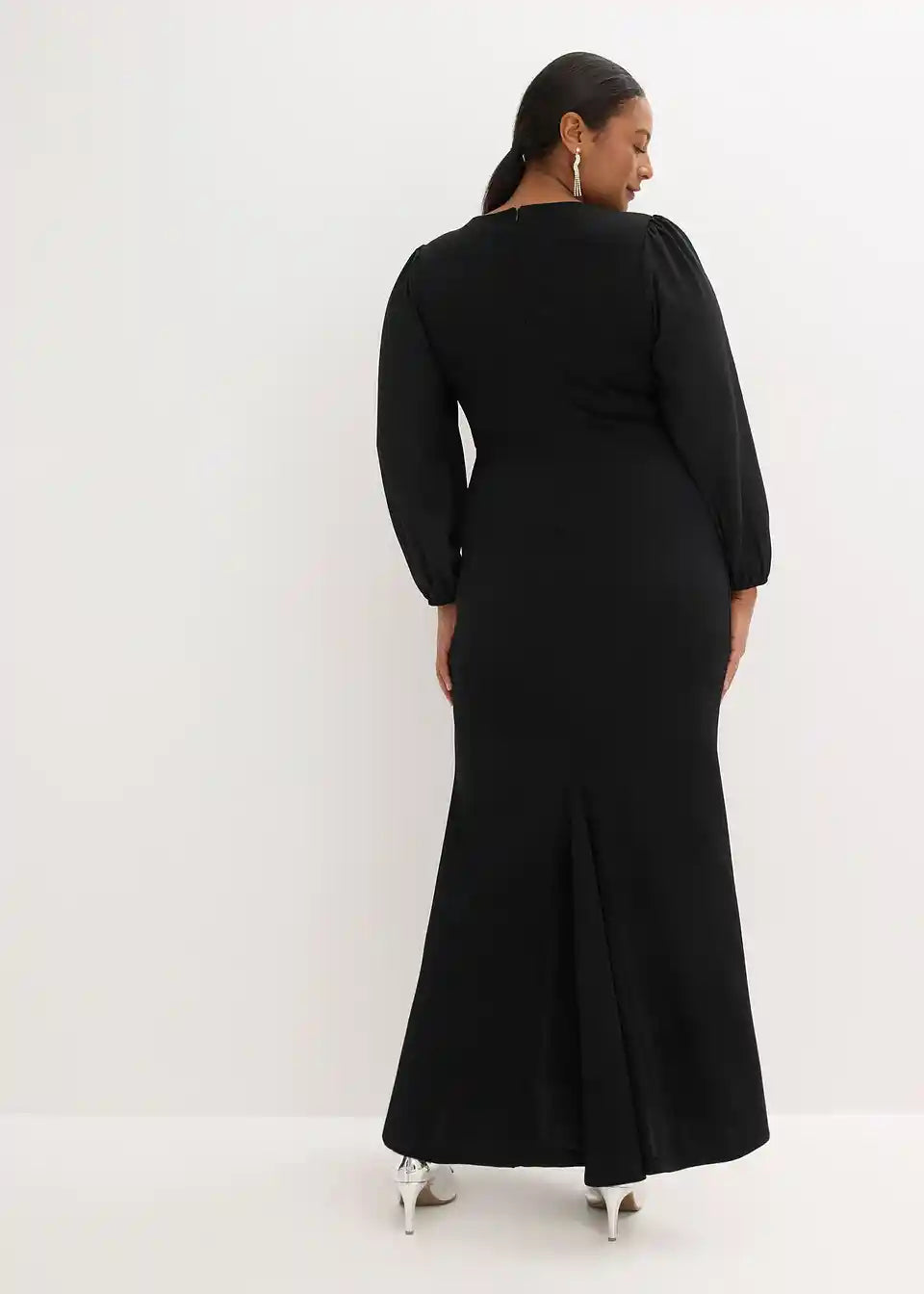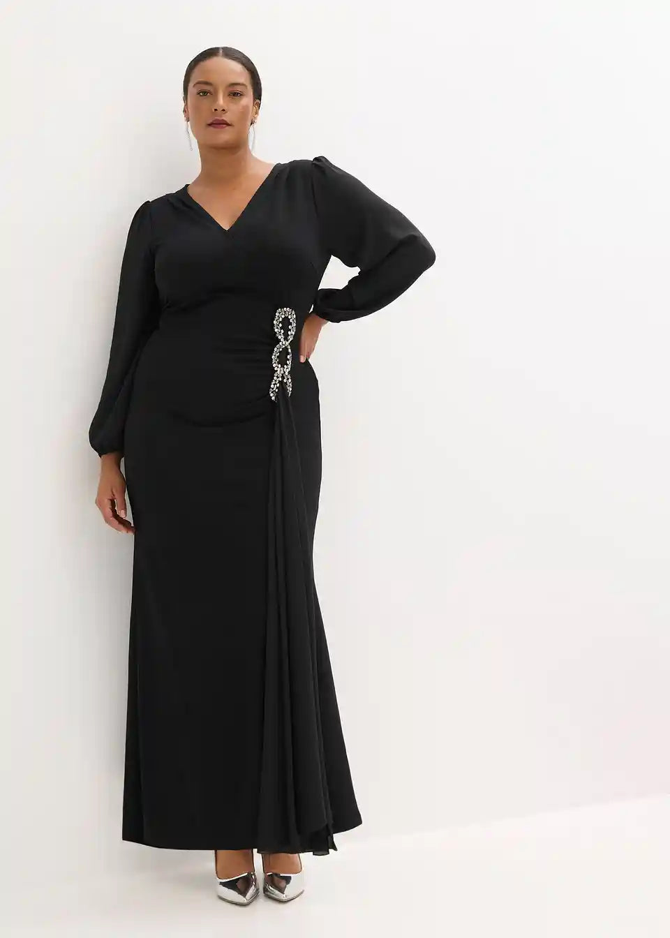 Moderna i ženstvena: večernja haljina s balon-rukavima i drapiranjem s aplikacijom od stras kamenčića