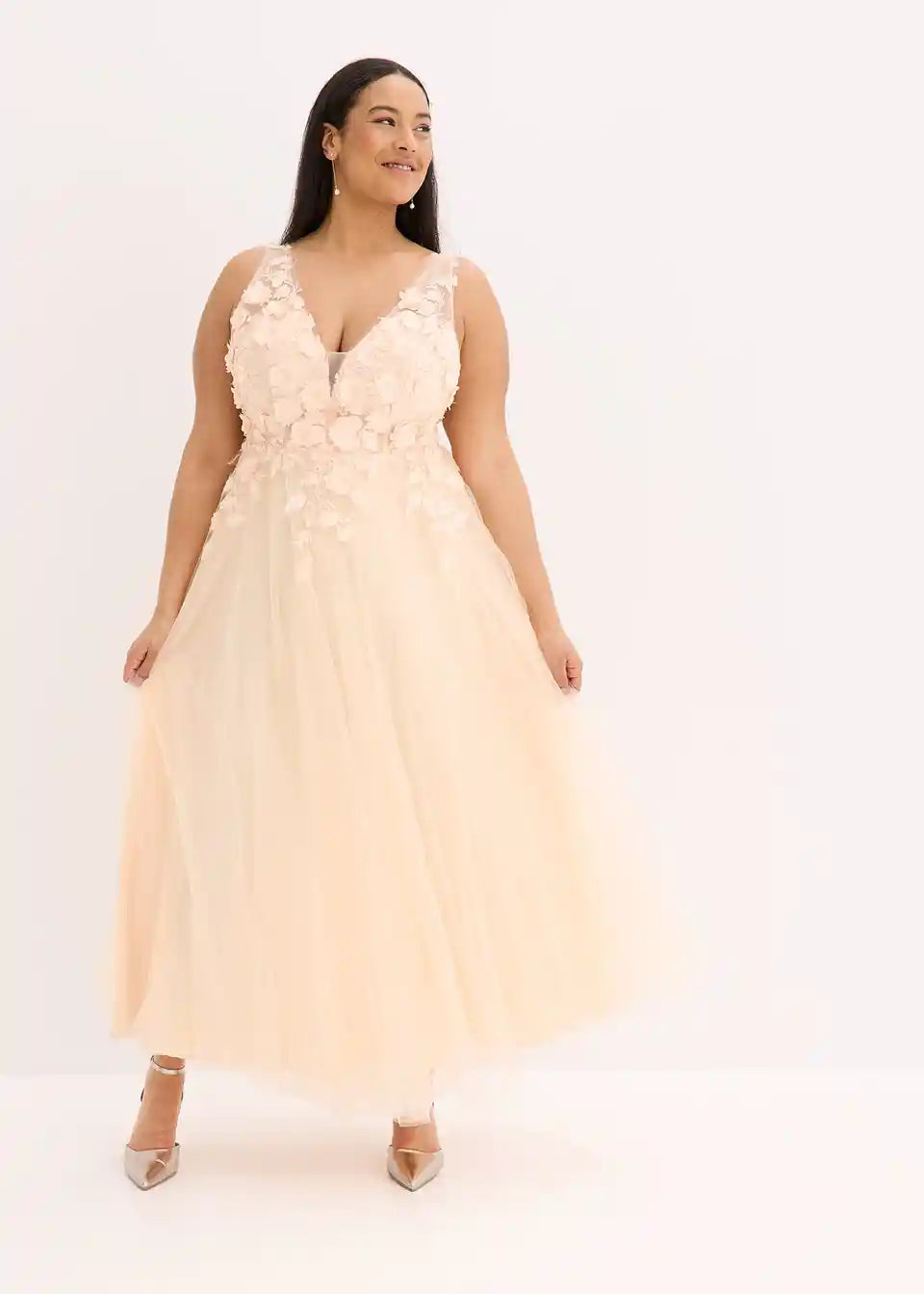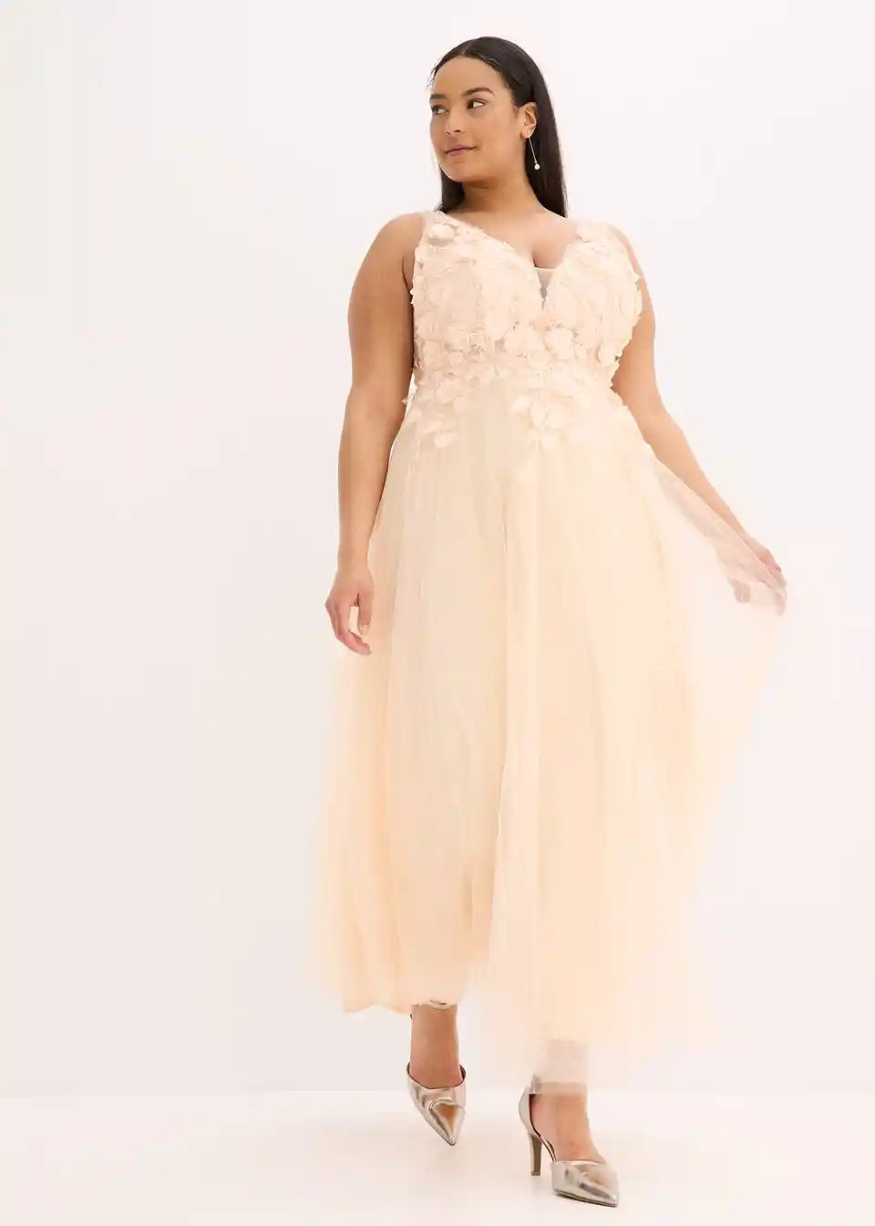 Romantična i ženstvena: Očaravajuća večernja haljina maksi dužine od nježnog tila s cvjetnim aplikacijama na gornjem dijelu