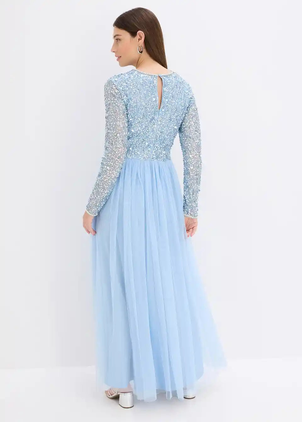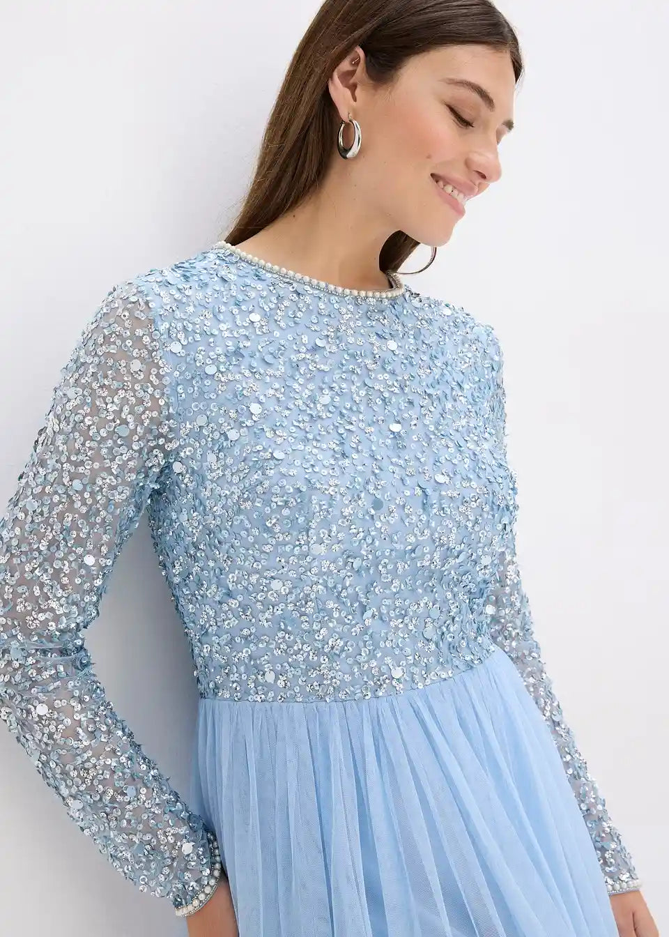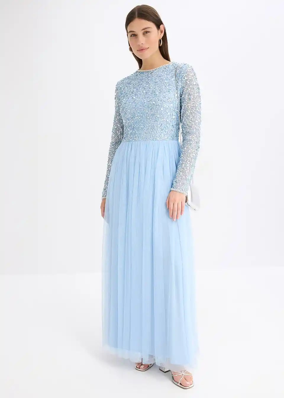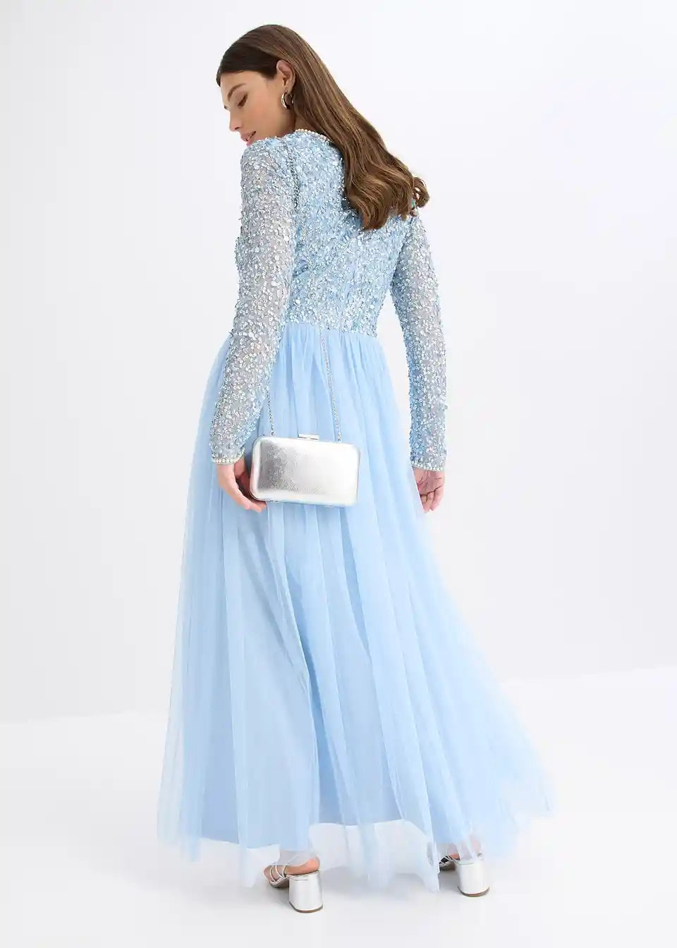 Moderna i ženstvena: večernja haljina s vezom od šljokica i ukrasom od perli na rukavima i izrezu.