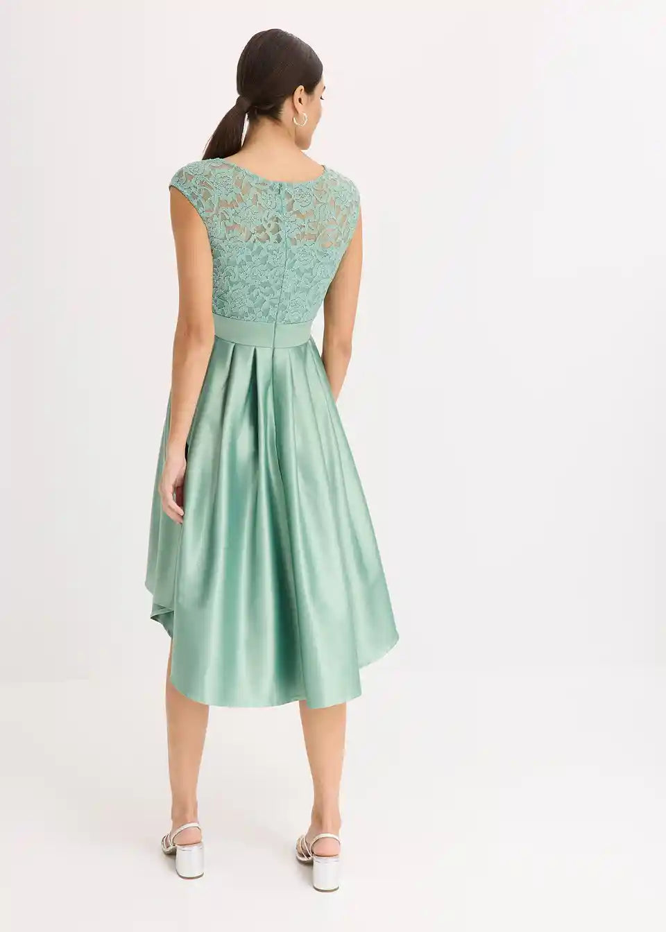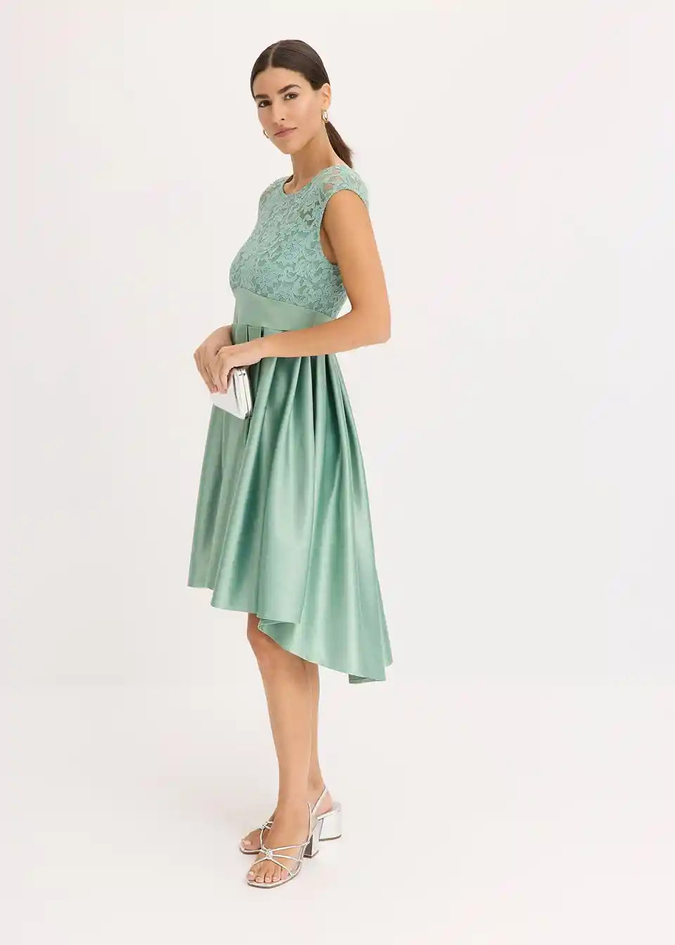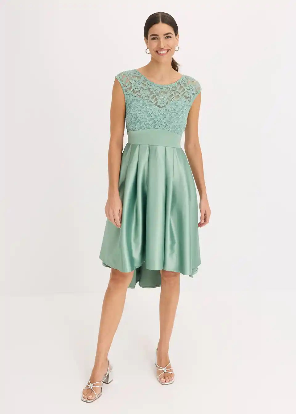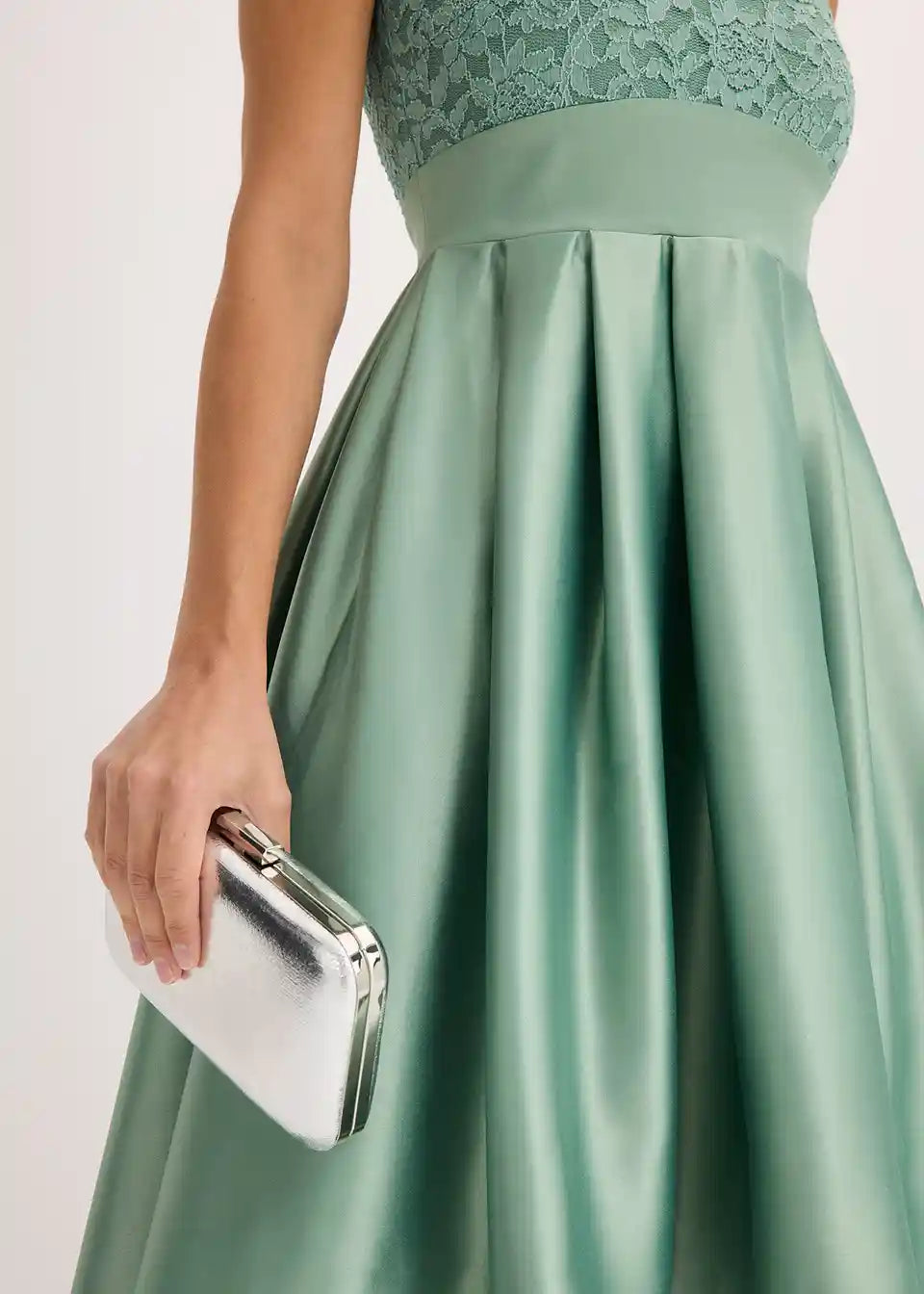 Očaravajuća koktel haljina od sjajnog satena s umetkom u struku i čipkom na gornjem dijelu