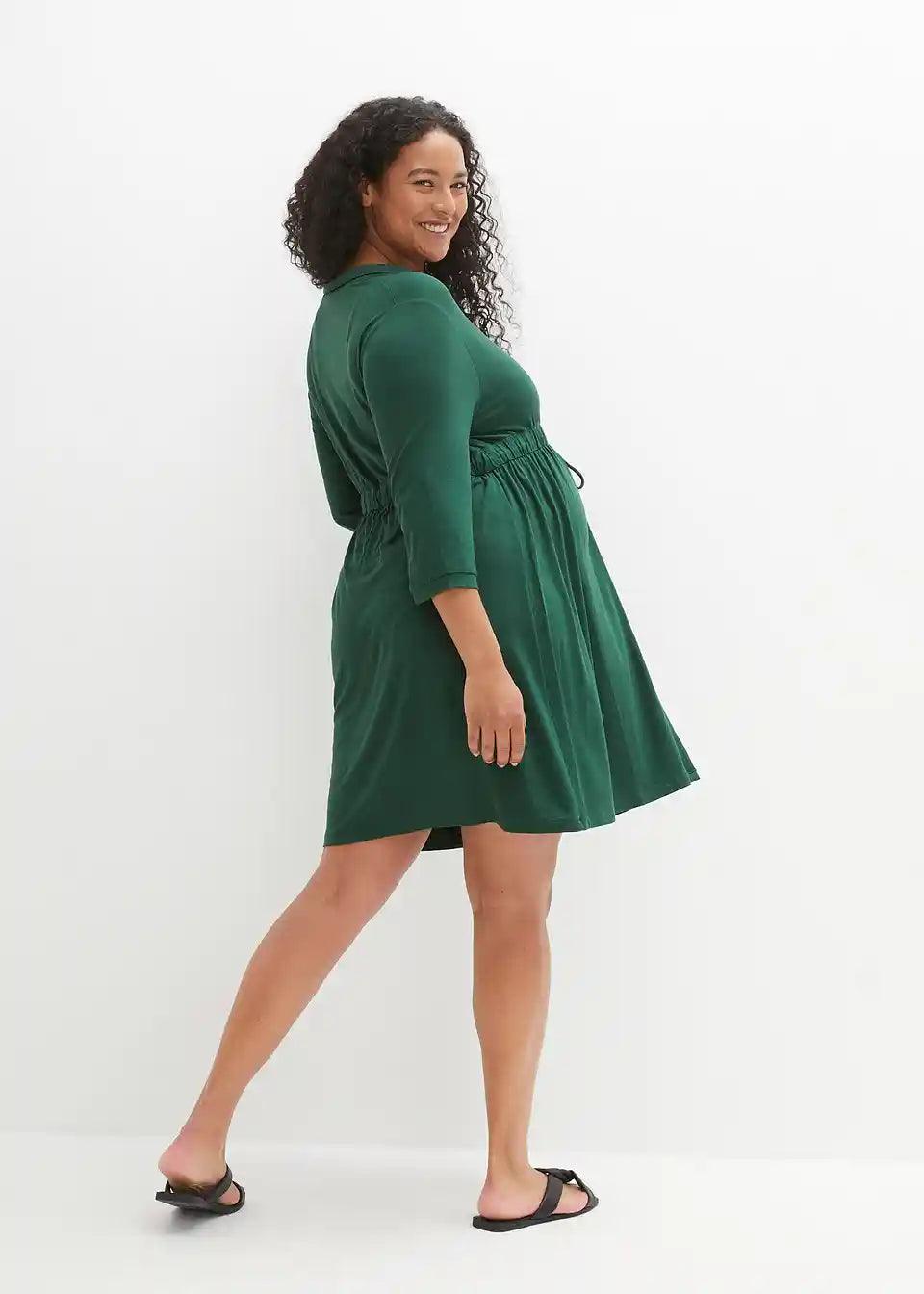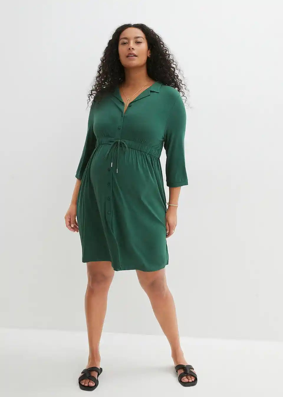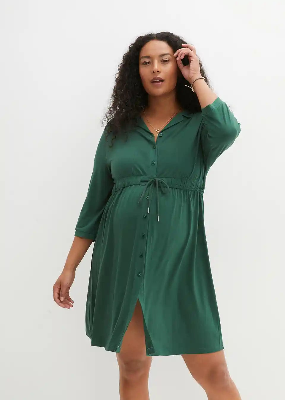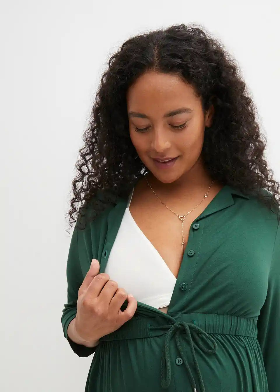 Košulja haljina od mekanog viskoznog dresa iz održive proizvodnje. S ovratnikom i rukavima 3/4 dužine. Potpuno zakopčavanje omogućuje lako dojenje i olakšava oblačenje i skidanje. S elastičnom vezicom ispod grudi.