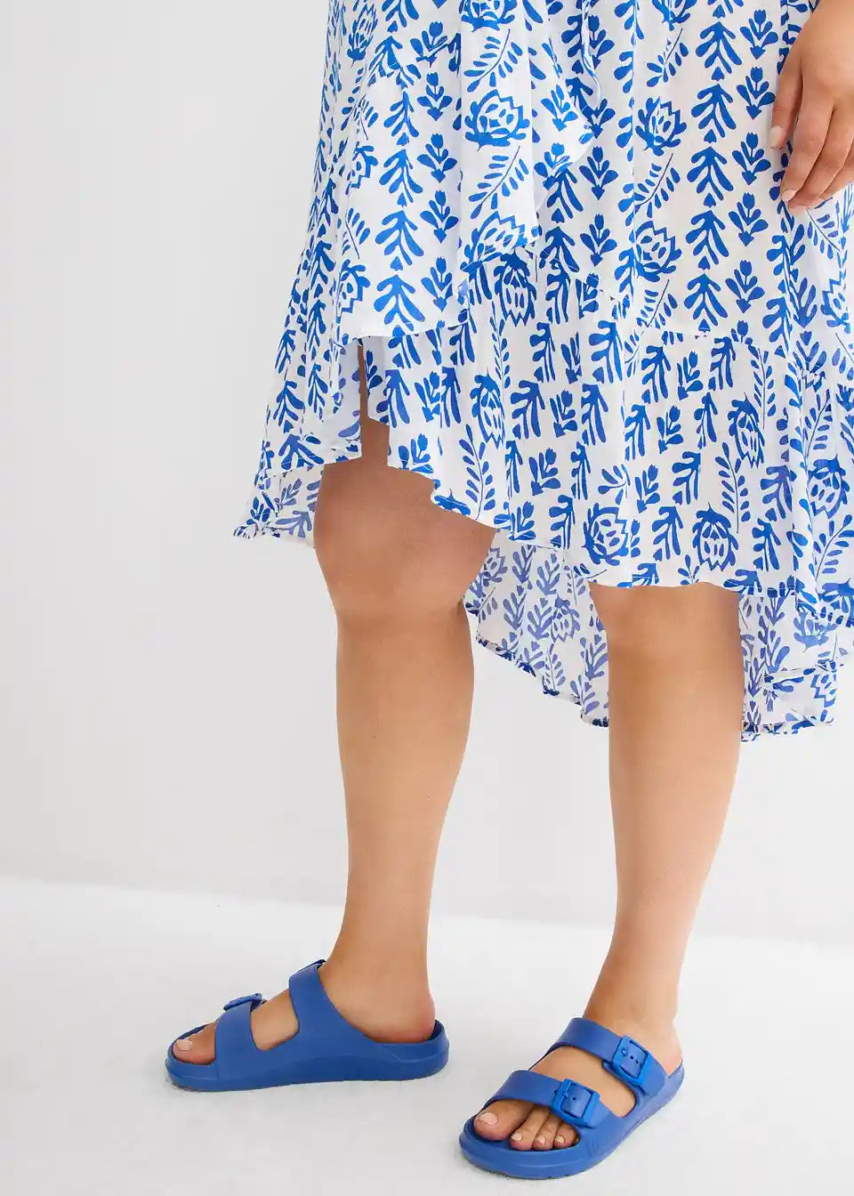 Haljina za trudnice do sredine listova izrađena od tkanine od viskoze s dubokim V-izrezom u preklopnom kroju. Izrez sadrži mali druker koji se može otvoriti za dojenje, a po potrebi se može i u potpunosti ukloniti. Ušivena gumica u šavu ispod prsa osigurava laskavu siluetu. Rub je s prednje strane kraći i obrubljen s volanima po cijelom obodu.