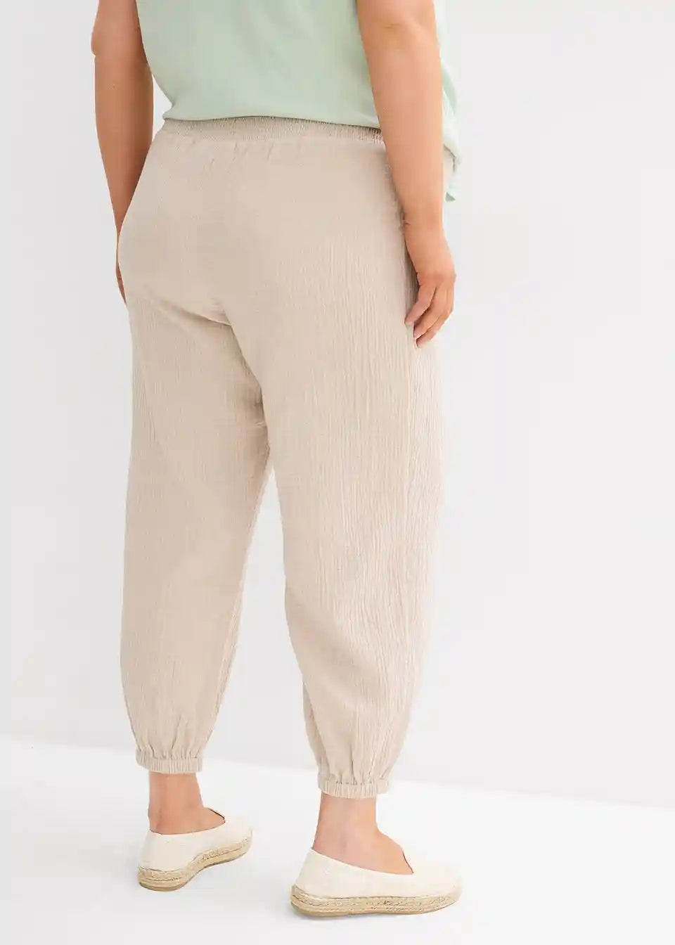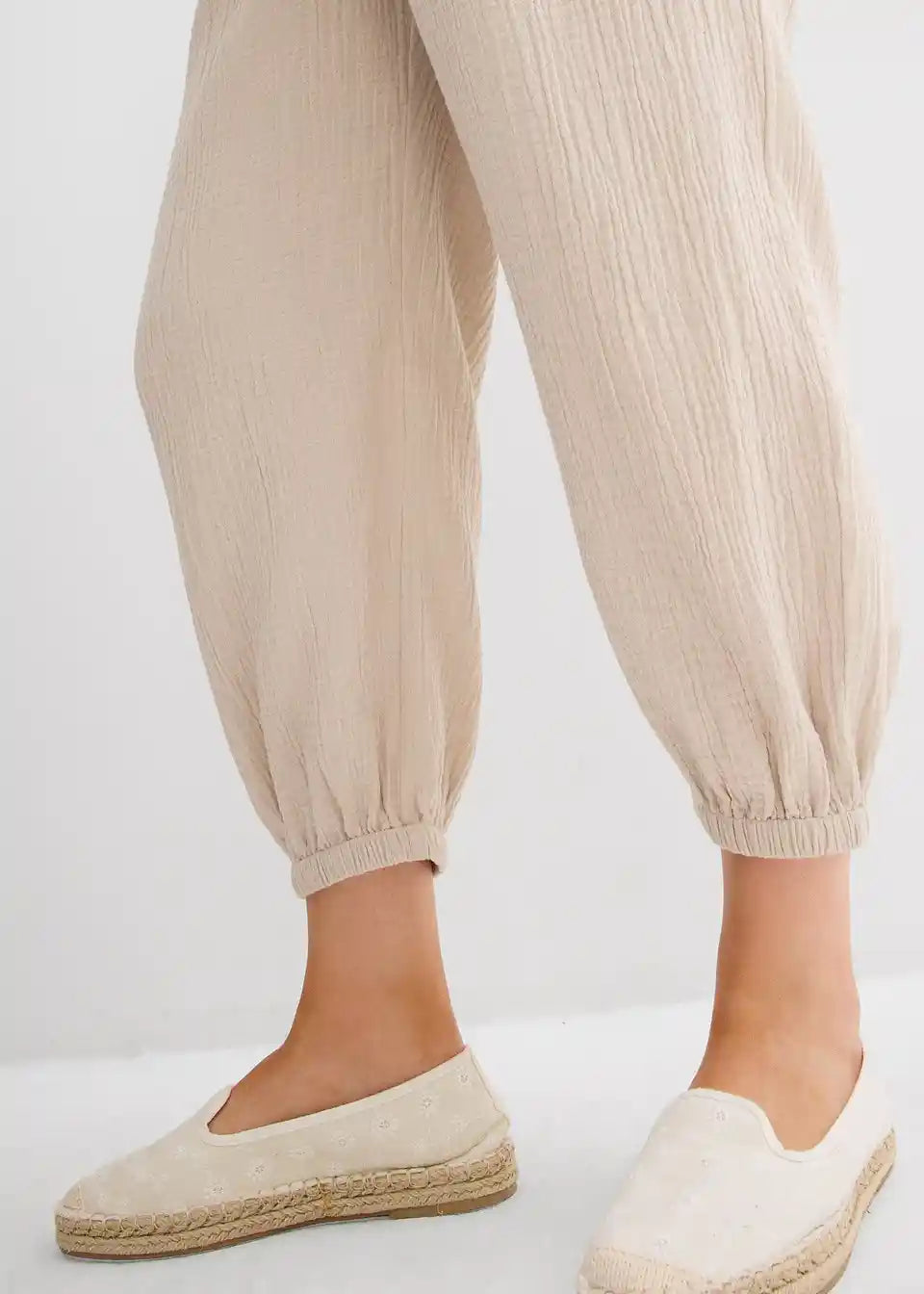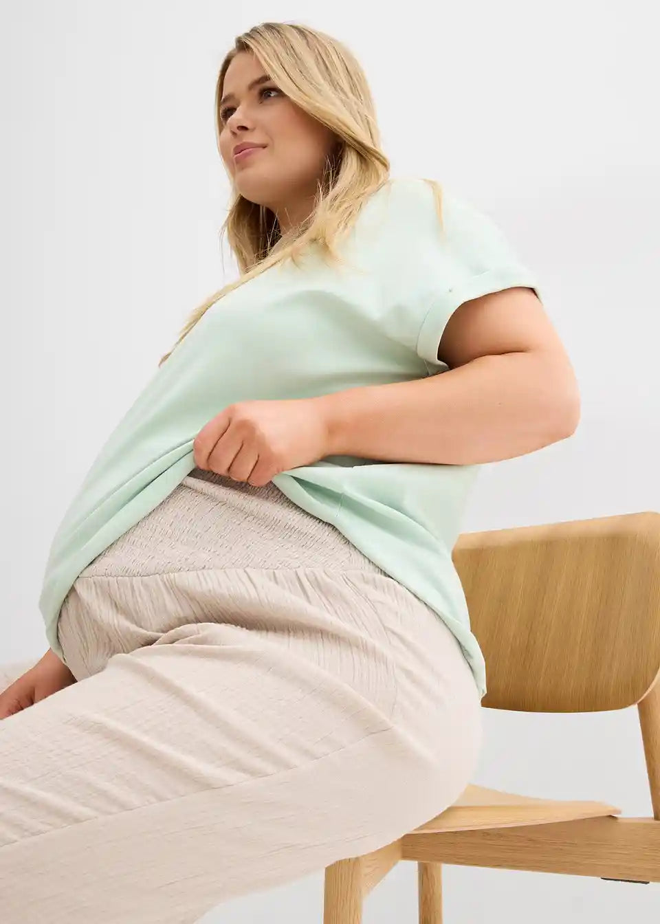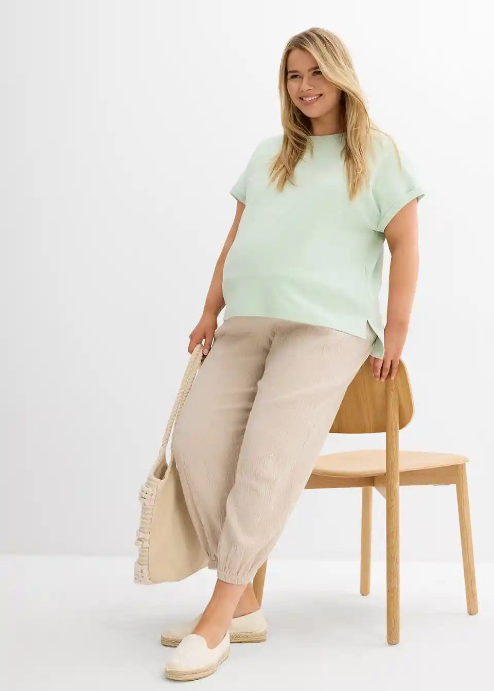 Hlače za trudnice do iznad gležnja s elastičnim smock pojasom. Ova obrada prilagođava se rastućem trudničkom trbuhu i istovremeno pruža fleksibilnost za razdoblje nakon poroda. Ljetne hlače od laganog, prozračnog pamučnog muslina opremljene su praktičnim džepovima i elastičnom trakom na rubu nogavica.