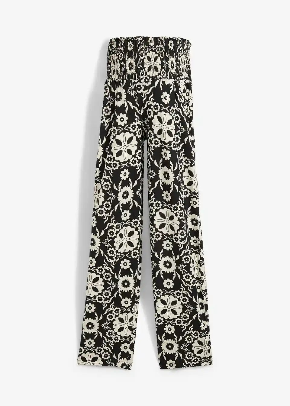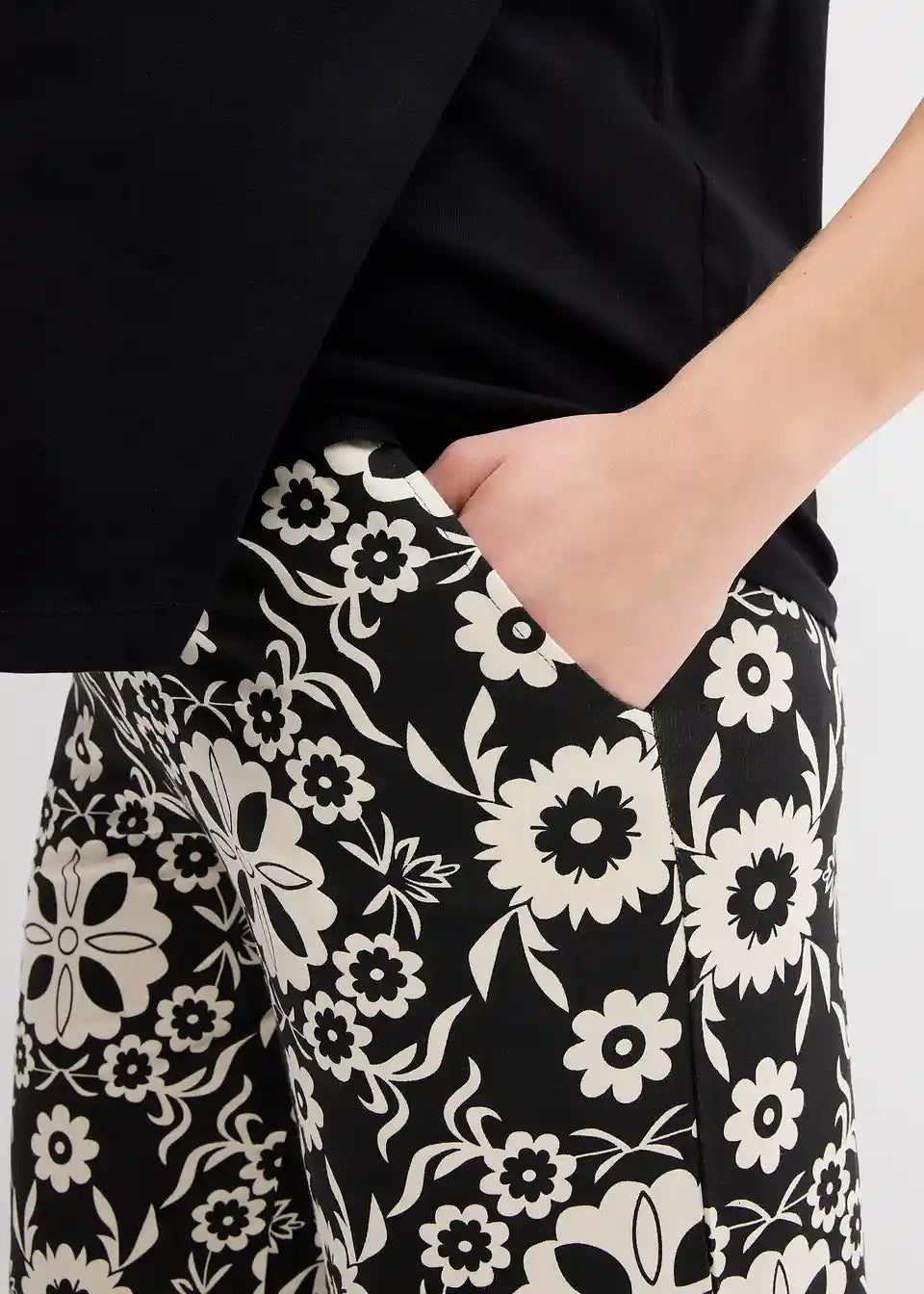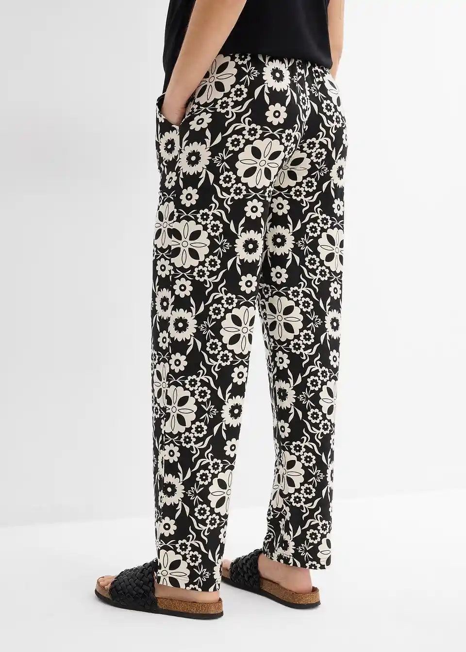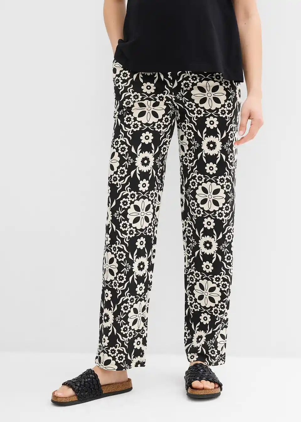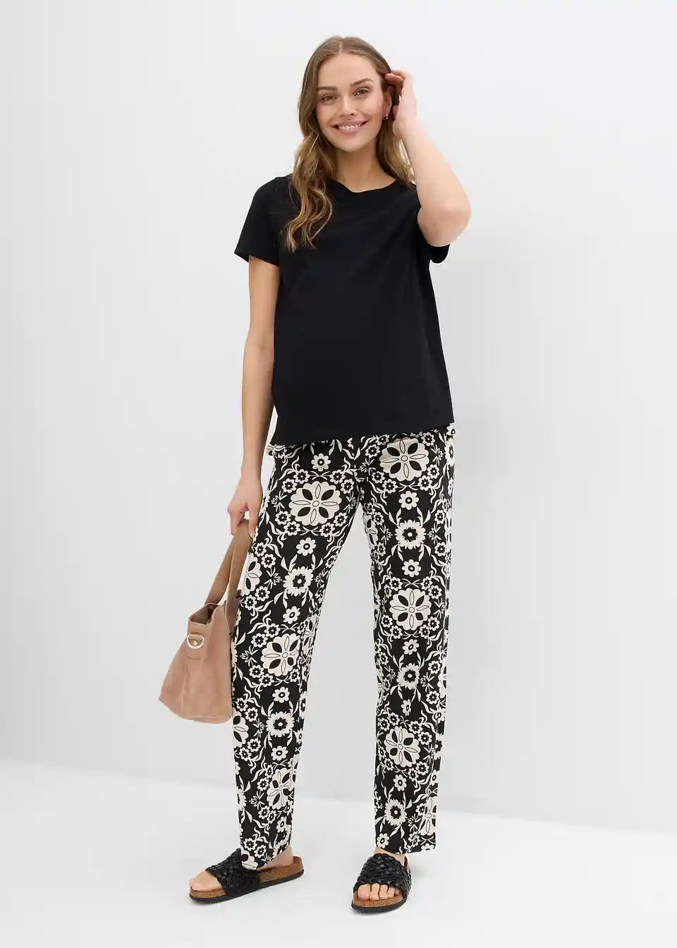 Tiskane trudničke hlače s mekanim poluvisokim pojasom, posebno elastične obrade. Ovaj smock pojas prilagođava se rastućem trudničkom trbuhu i savršen je i za razdoblje nakon poroda. Jerseypantalone su izrađene od mekane viskoze s malim udjelom rastezljivog materijala za visoku udobnost nošenja i imaju praktične džepove sprijeda. Trudničke hlače imaju udoban kroj s ravnim, dugim nogavicama.