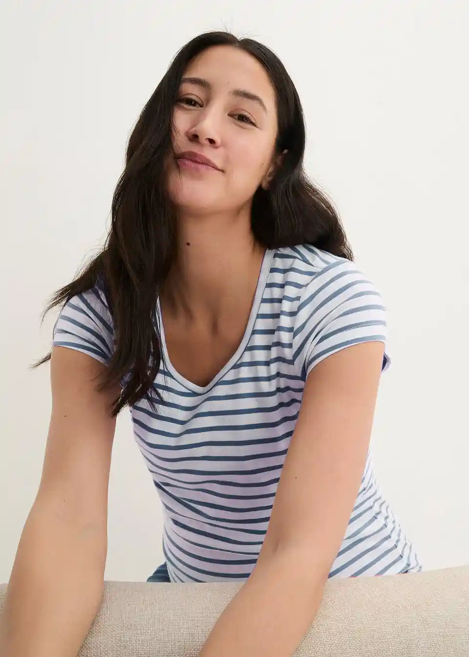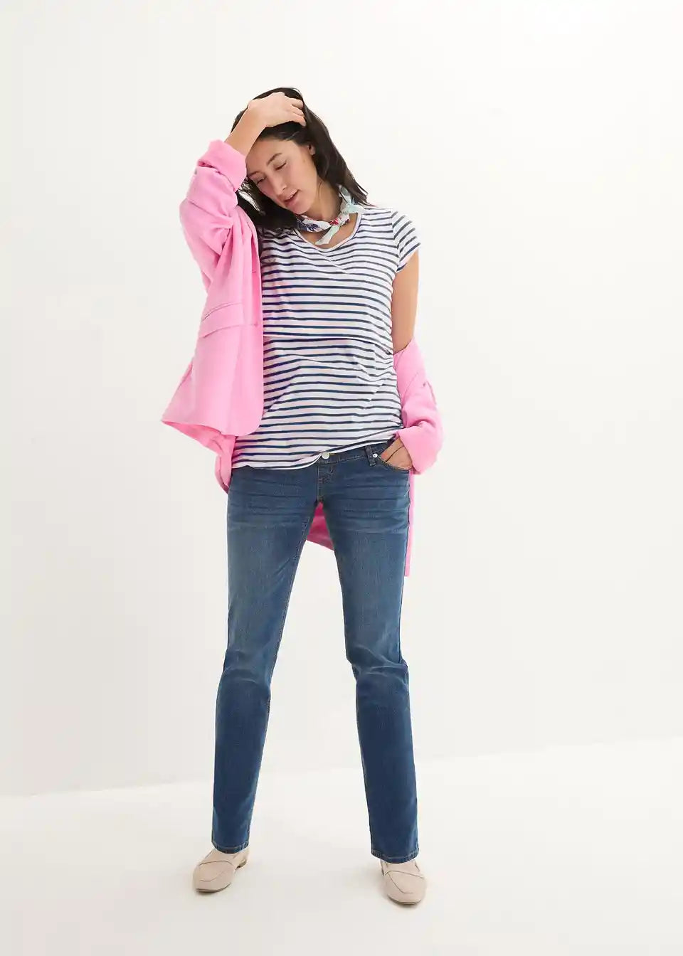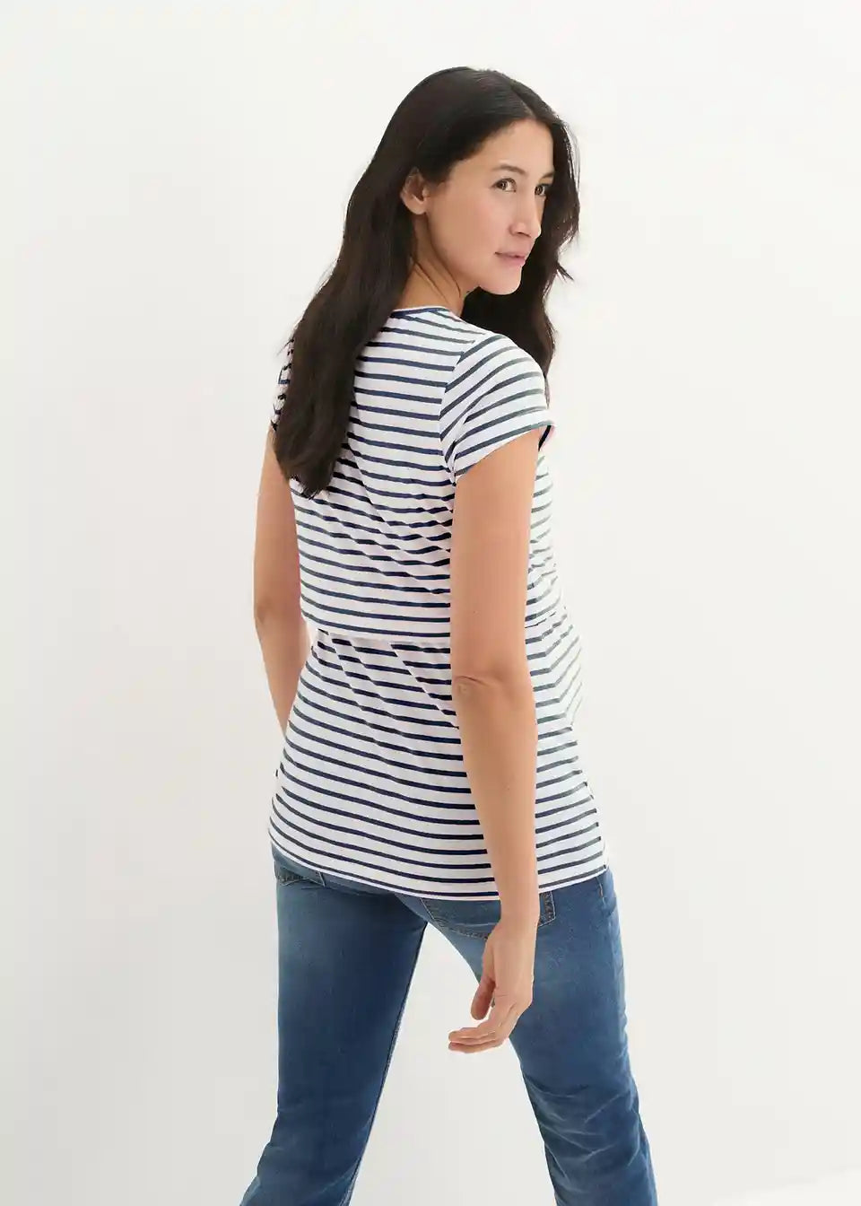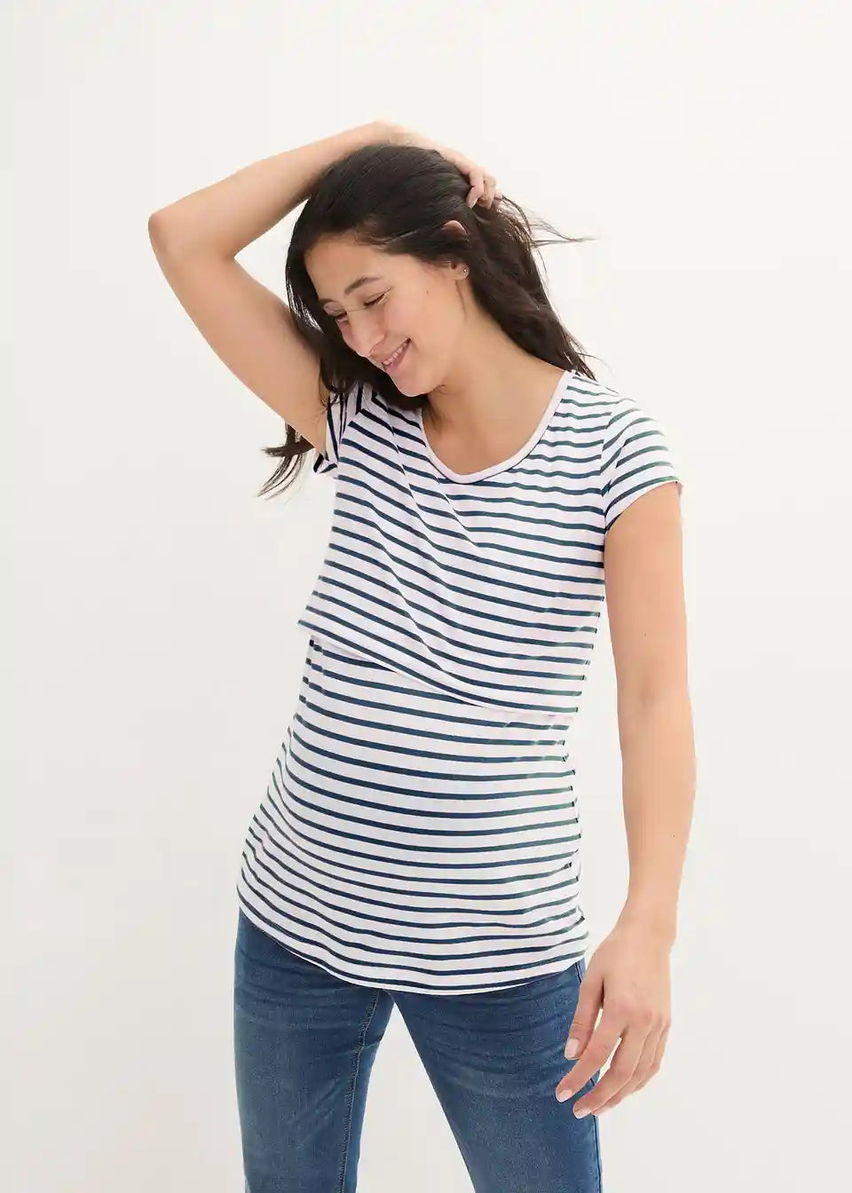 Mekana majica za trudnice od jerseya s praktičnom funkcijom dojenja na podizanje. Dizajn s dvostrukim slojevima pomaže izbjeći gubitak topline i omogućava ugodno dojenje za majku i dijete.