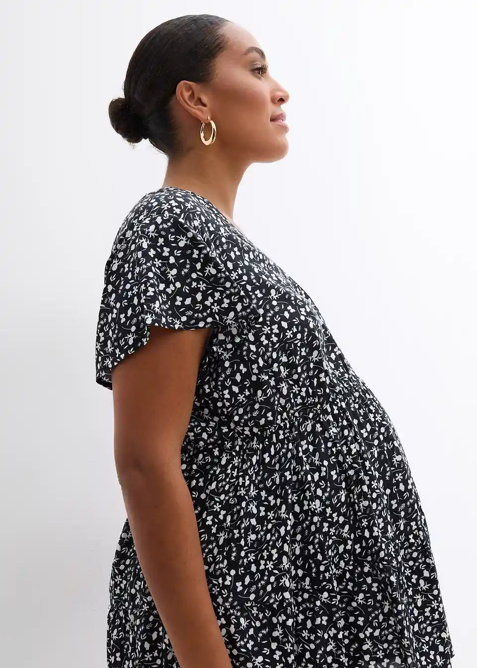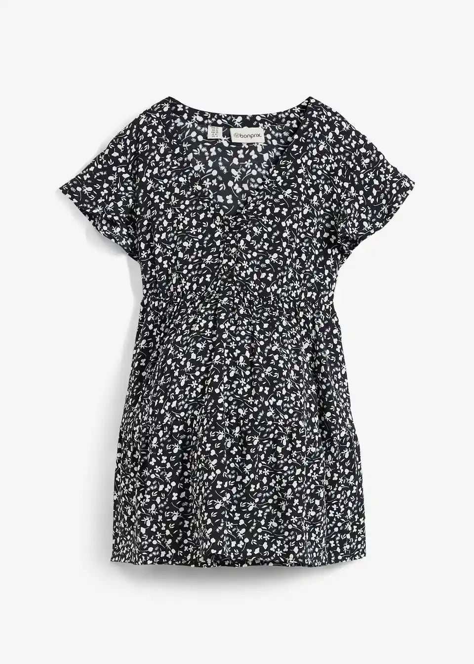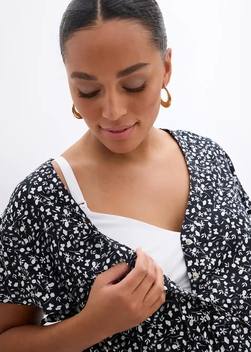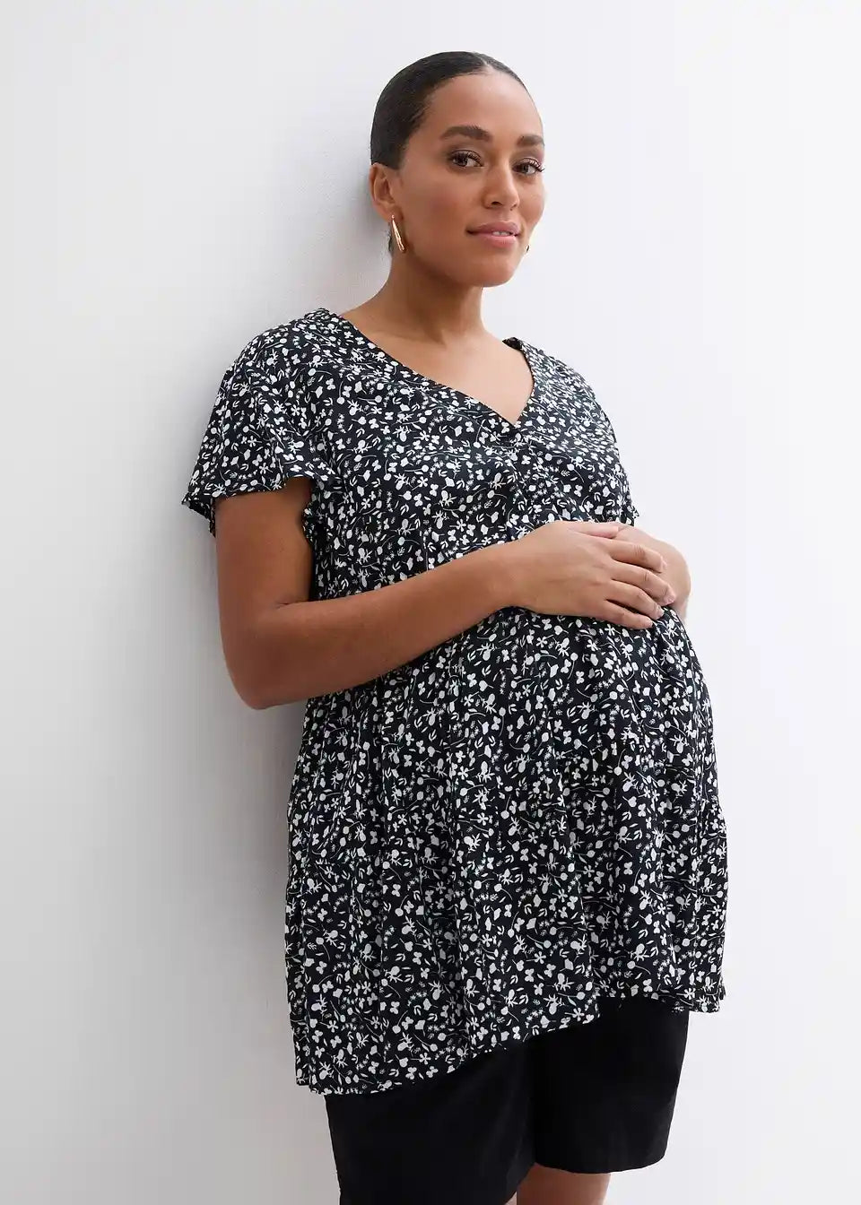 Trudnička bluza od tkane viskoze s V-izrezom i laskavim leptir rukavima. Šav ispod prsa s elastičnom trakom pruža udobno pristajanje, a A-kroj osigurava lijep pad i laskavi izgled. Nakon trudnoće, lako dojenje omogućeno je uz pomoć reda dugmadi.