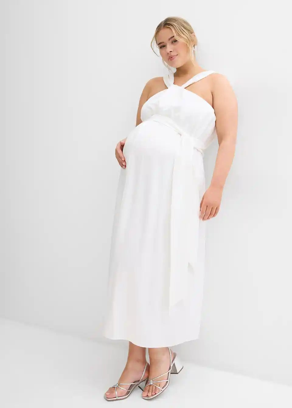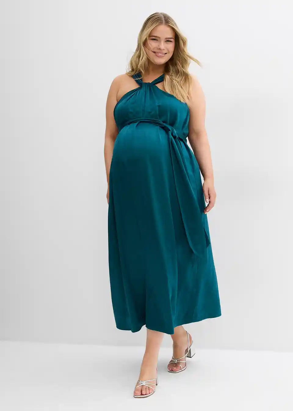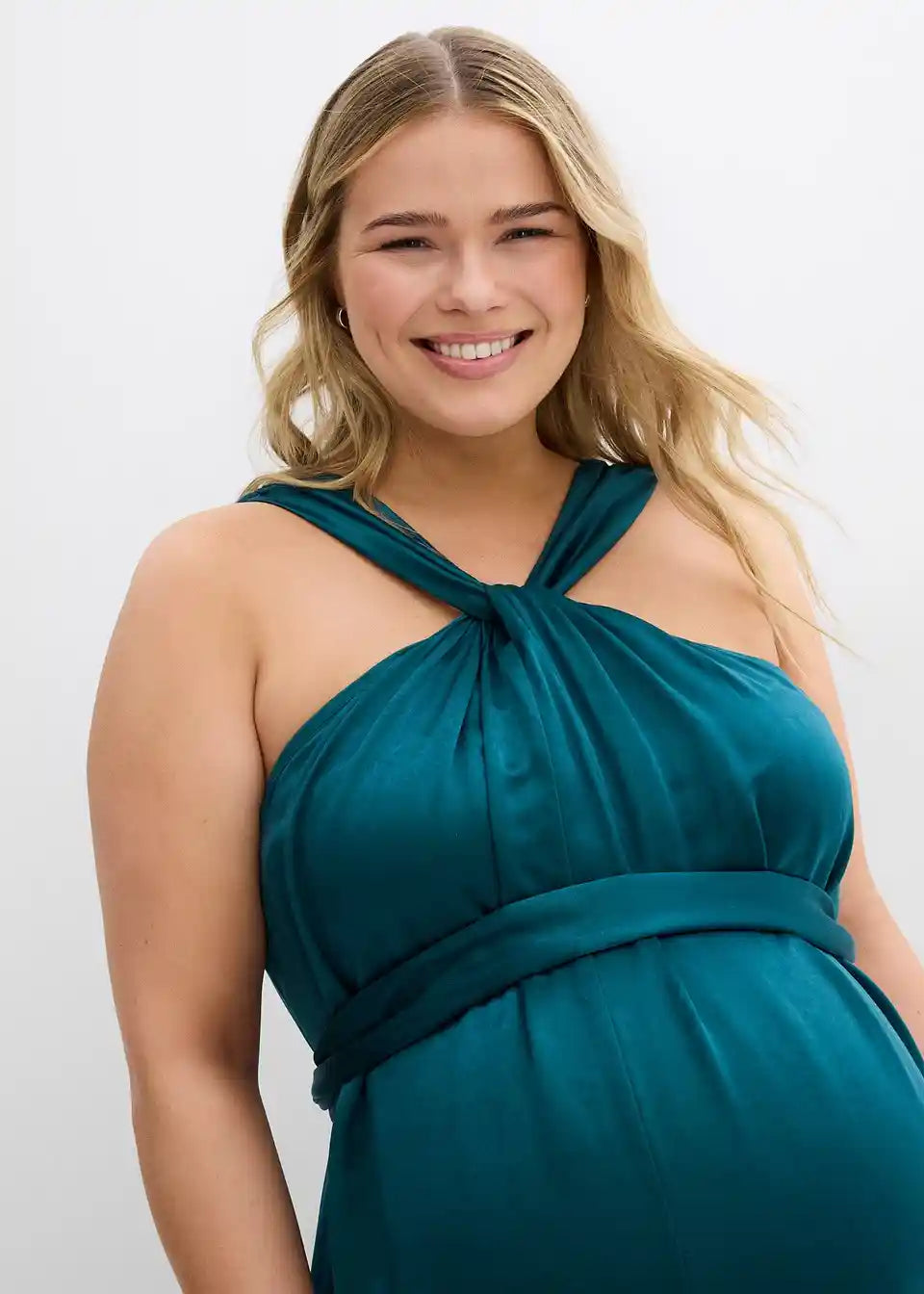 Ova dugacka, do gležnja 4-u-1 haljina za trudnice izrađena je od mekane, lepršave mješavine viskoze sa svilenkastim sjajem i nudi razne mogućnosti nošenja: može se nositi s čvor detaljem sprijeda na izrezu ili alternativno s V-izrezom. Silueta se može prilagoditi pomoću odvojivog pojasa, bilo naglašeno uz tijelo ili ležerno padajuće. Gornji dio je opremljen lagano potpornim umetkom od džerseja.