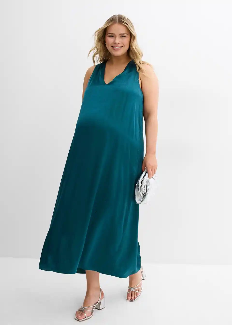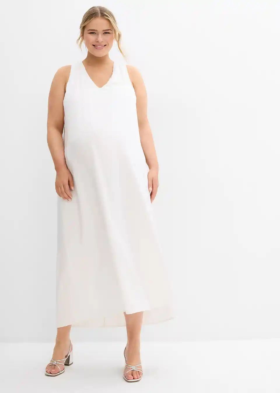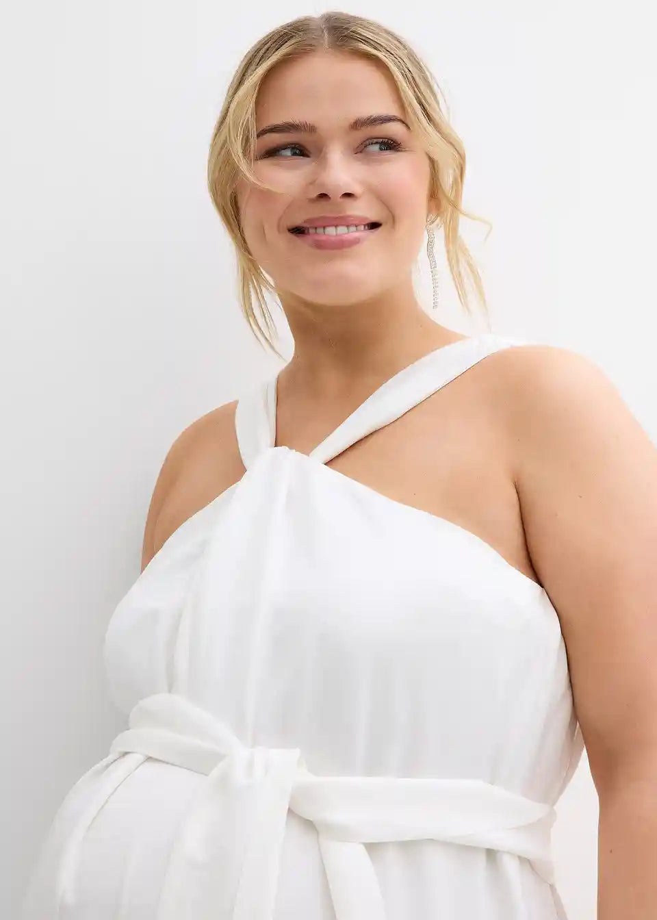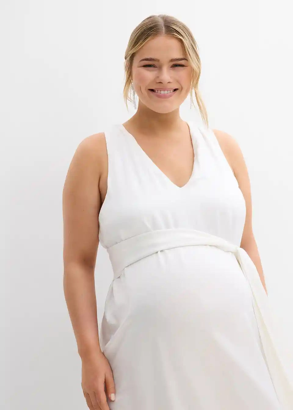 Ova dugacka, do gležnja 4-u-1 haljina za trudnice izrađena je od mekane, lepršave mješavine viskoze sa svilenkastim sjajem i nudi razne mogućnosti nošenja: može se nositi s čvor detaljem sprijeda na izrezu ili alternativno s V-izrezom. Silueta se može prilagoditi pomoću odvojivog pojasa, bilo naglašeno uz tijelo ili ležerno padajuće. Gornji dio je opremljen lagano potpornim umetkom od džerseja.