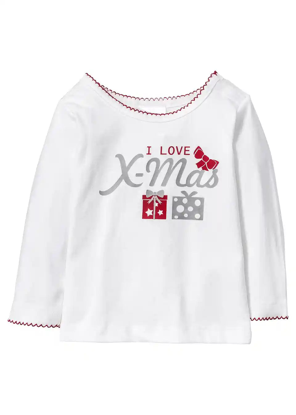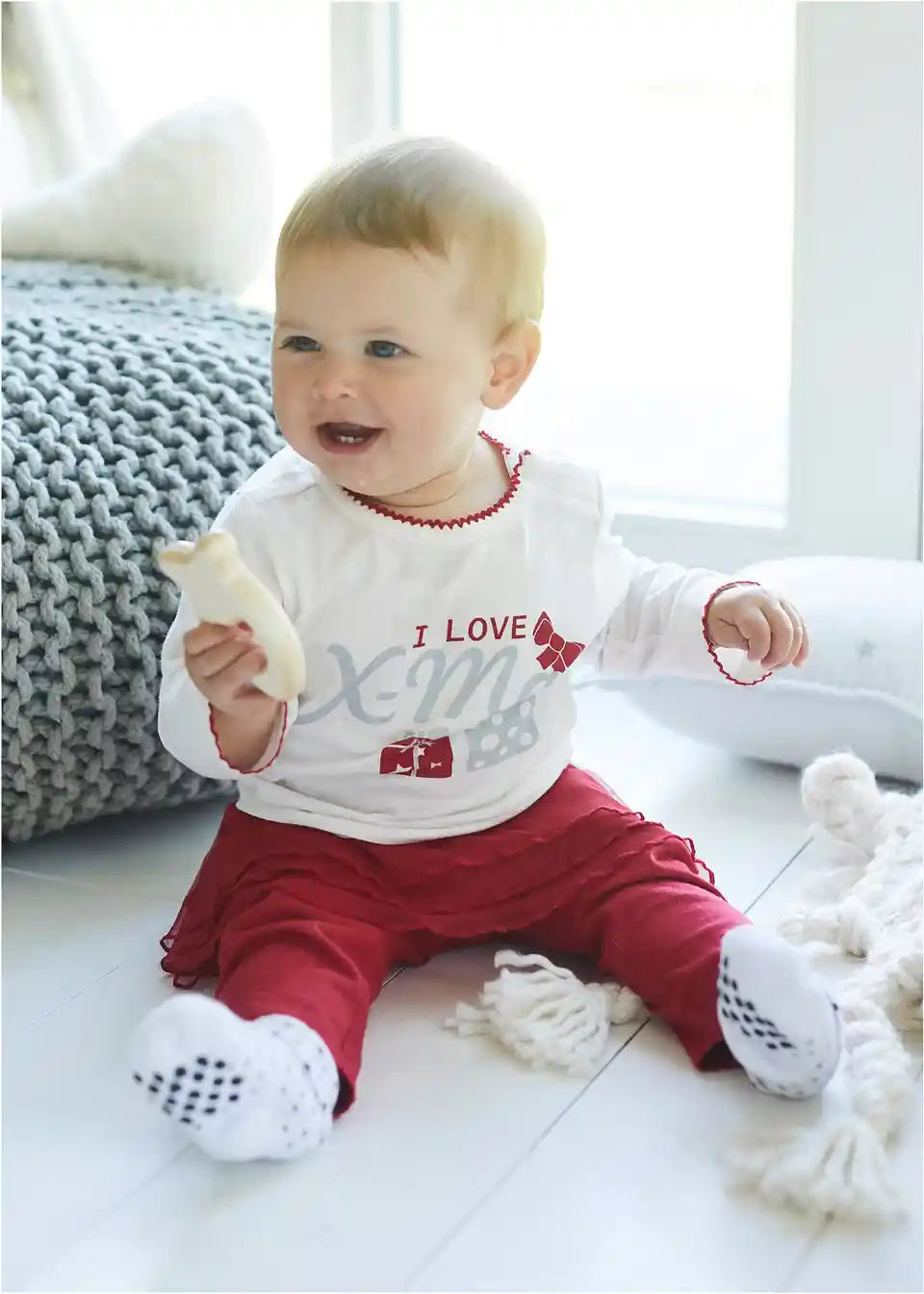 Ovaj prekrasan set savršen je za Božić. Za sve male bebe-djevojčice koje prvi put doživljavaju čaroliju božićnog doba, ovaj slatki dvodijelni baby set je savršen izbor. Majica dugih rukava s božićnim tiskom i kukičanim obrubom ima skriveno kopčanje na lijevom ramenu do veličine 80/86. Uz to dolaze udobne tajice s elastičnim pojasom i, kao poseban naglasak, prišiveni til-volani!