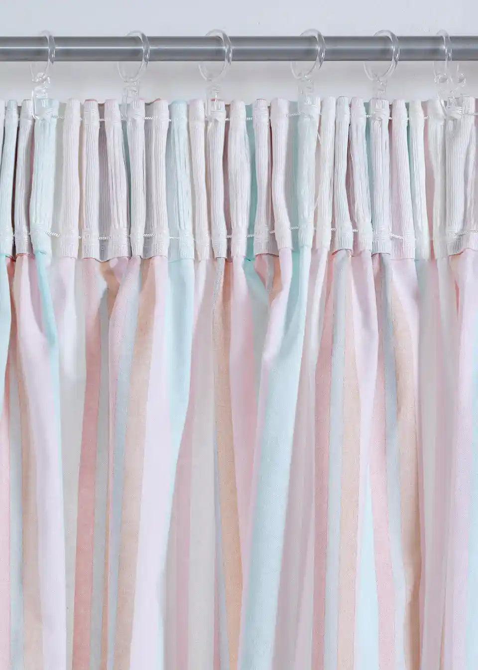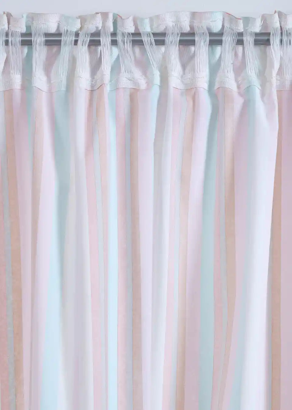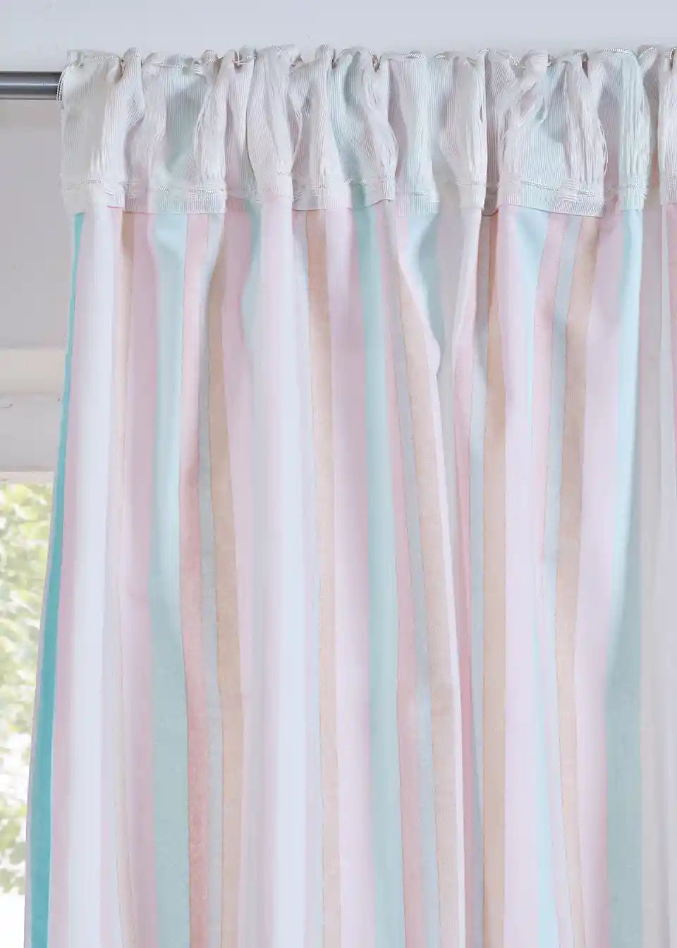 Zavjesa ima mekan dodir i izrađena je od visokokvalitetne bio pamuka. Fina pruga je otisnuta na prednjoj strani, dok je stražnja strana jednobojna bez uzorka.