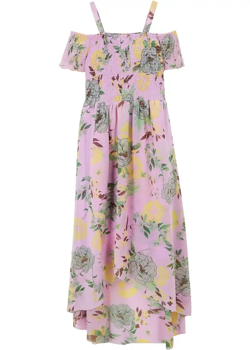 Ova prekrasna haljina oduševljava svojim cvjetnim dizajnom, otvorenim ramenima i dugim dijelom suknje. Ova haljina sa smockiranim gornjim dijelom je apsolutni hit za sve moderne djevojke!