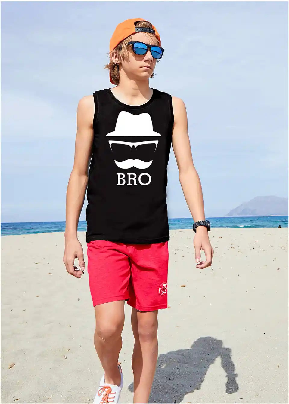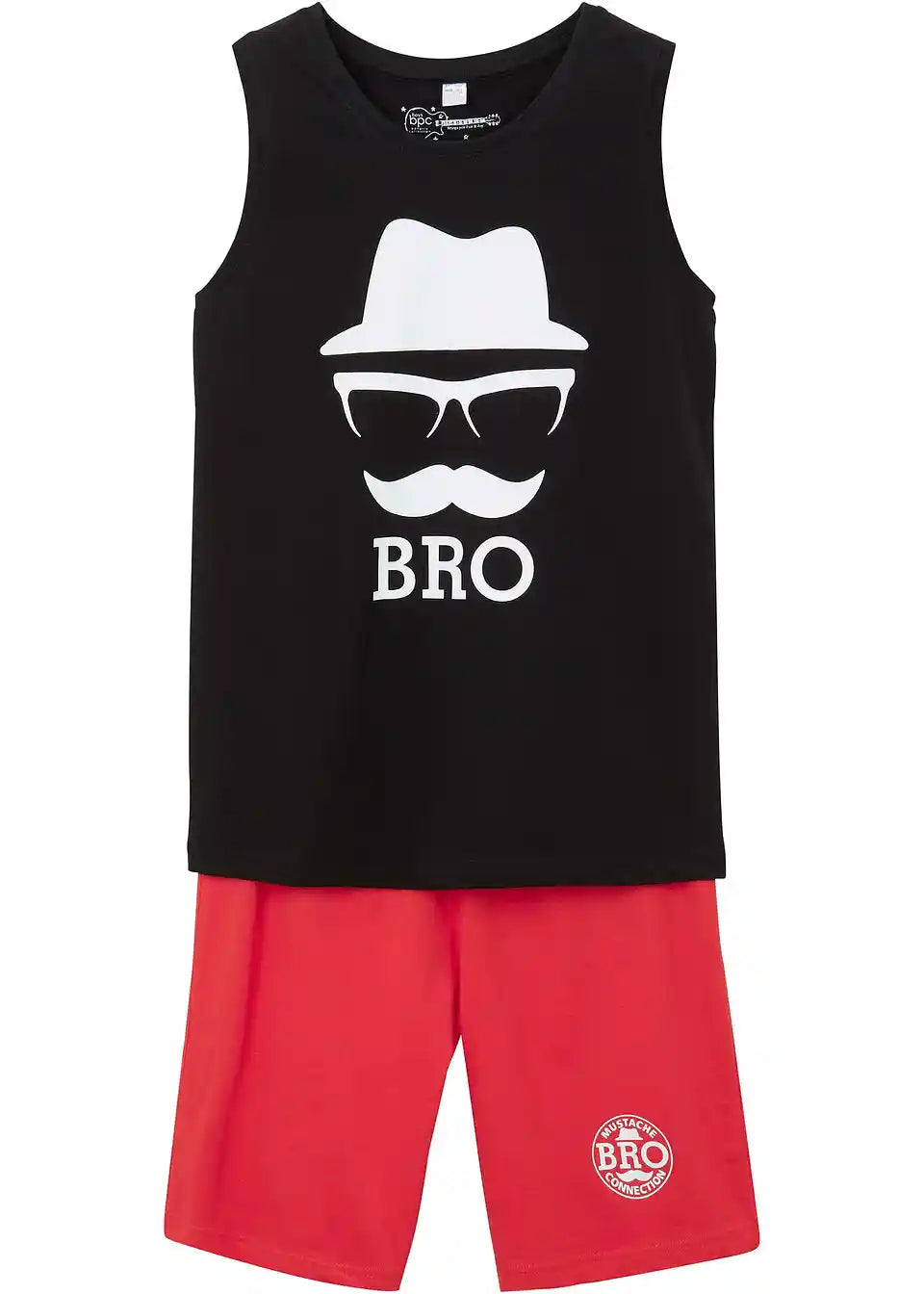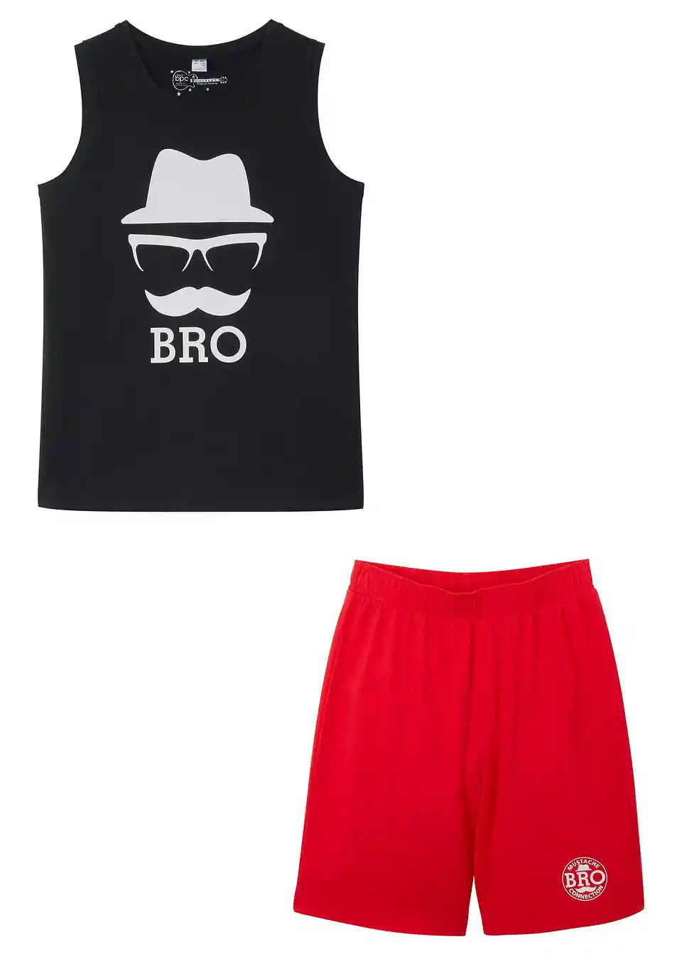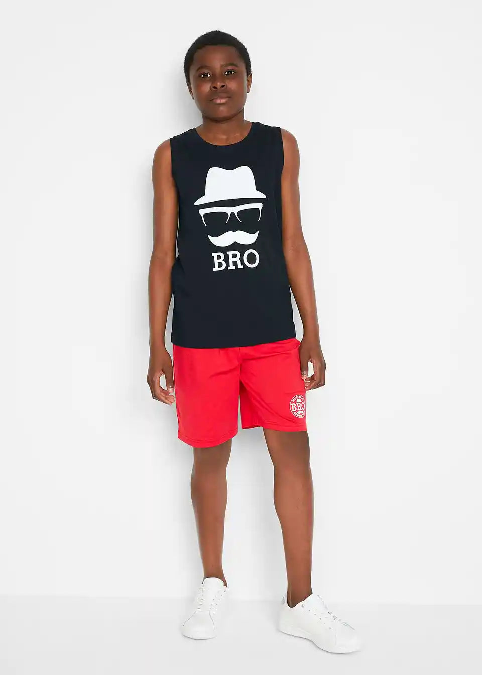 Ovaj sportski set sastoji se od majice bez rukava i bermuda hlača u kontrastnoj boji. BRO print na prednjoj strani savršeno se uklapa s mini printom na lijevoj nogavici, stvarajući cool dizajn. Ovaj set je namijenjen posebno cool klincima!