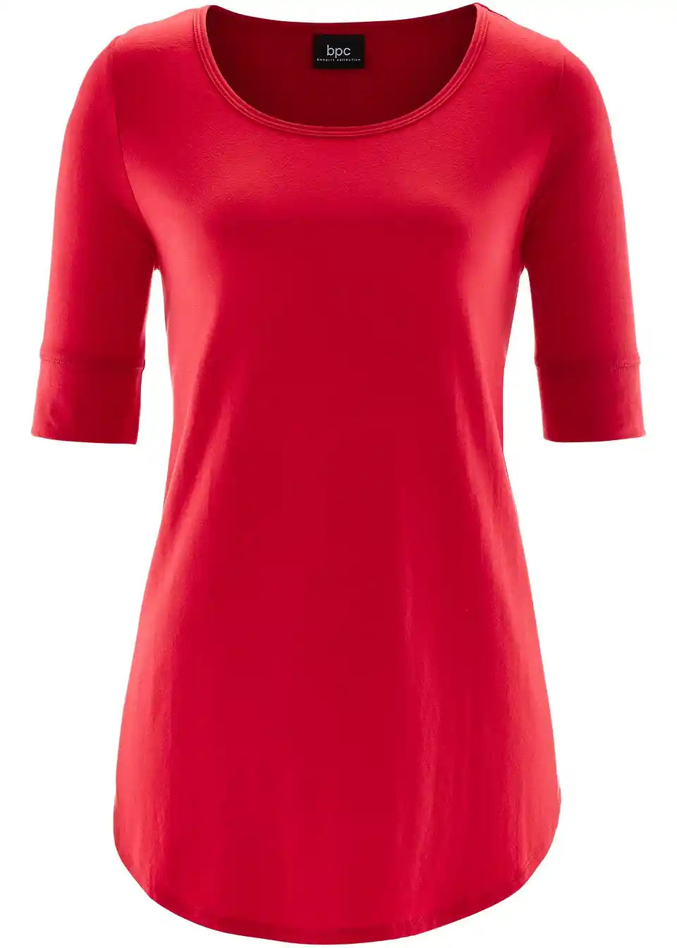Dugačka majica s poludugim rukavima iz bpc kolekcije nježno pada uz tijelo i završava zaobljenim rubom koji savršeno ističe ležeran izgled majice. Krajevi rukava su obrubljeni širokim manžetama, a široki okrugli izrez upotpunjuje dizajn ove lagane dugačke majice.Uz uske ili ravno krojene hlače savršeno će se uklopiti na tijelu pripijena majica.