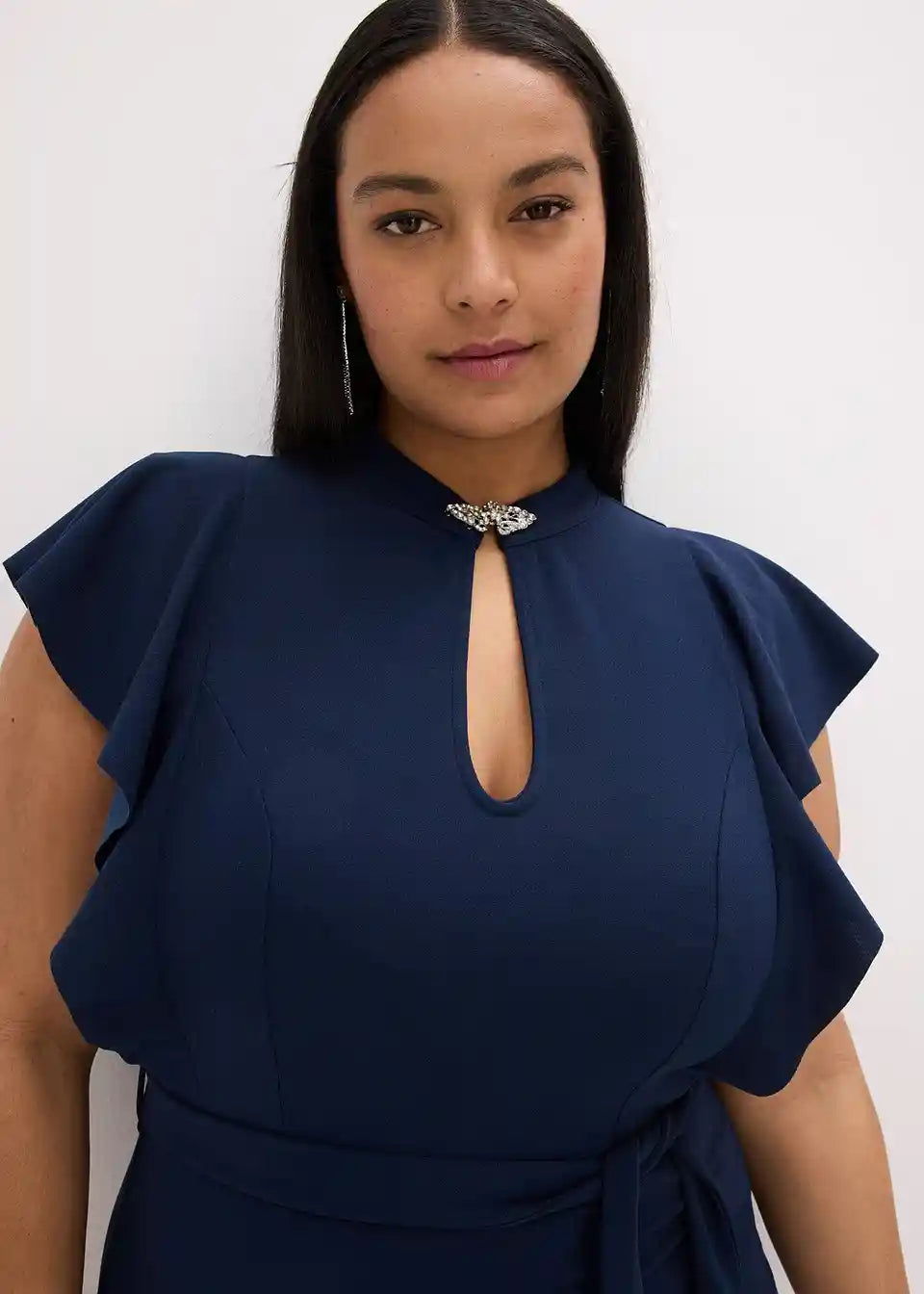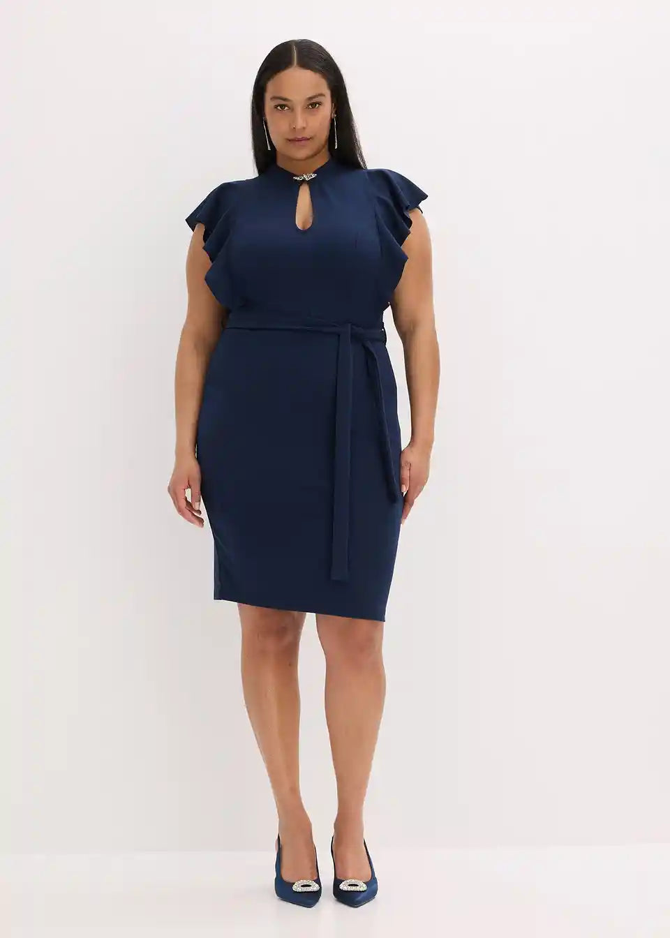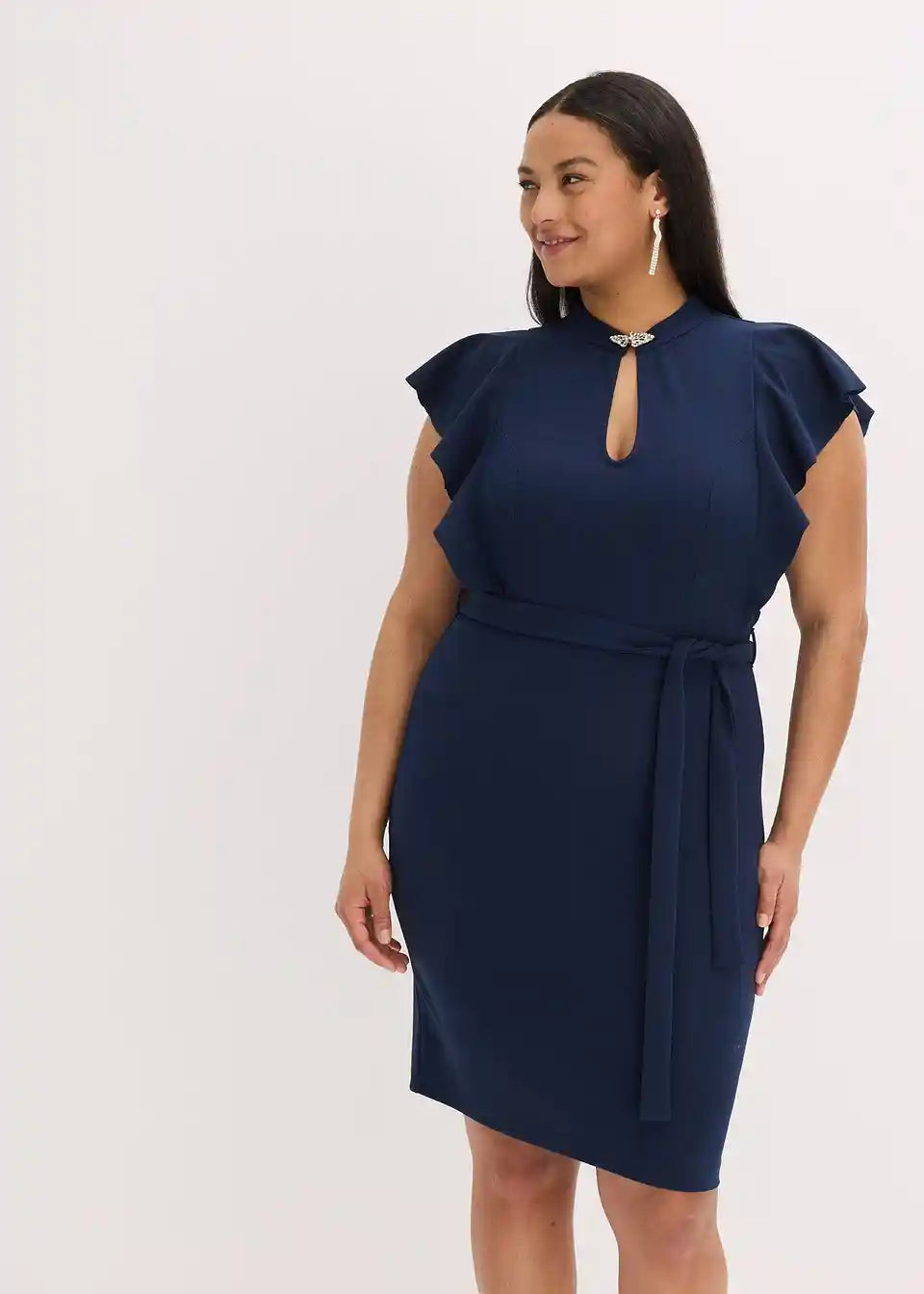 Moderno i ženstveno: Etuikleid s volan rukavima i uspravnim ovratnikom te ukrasnom kopčom na izrezu