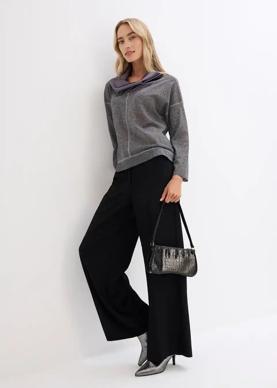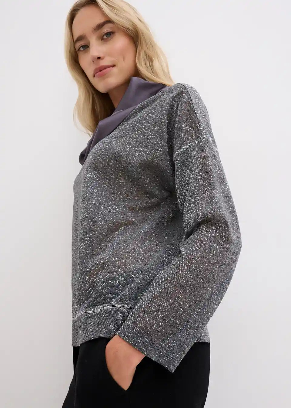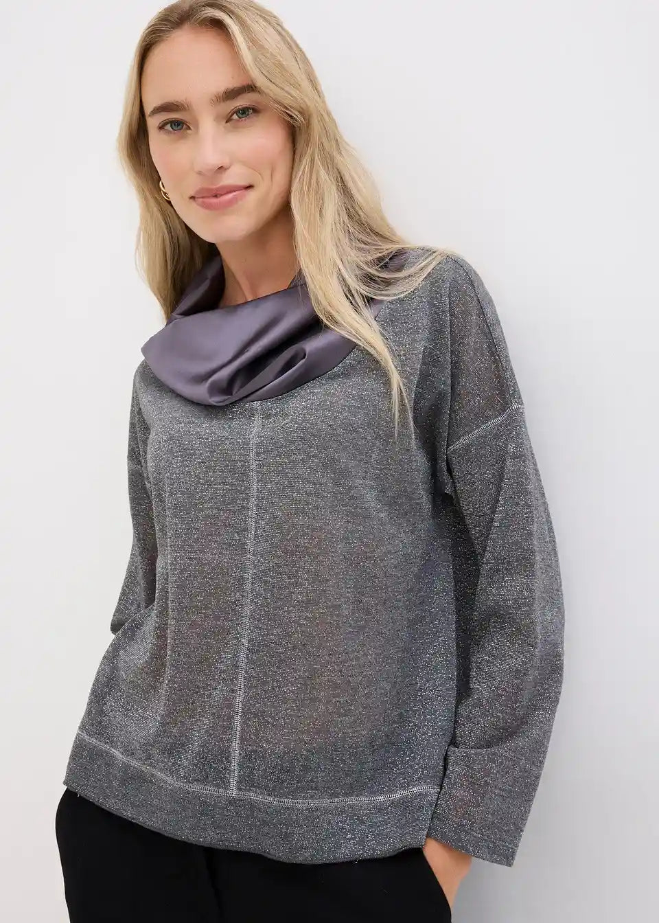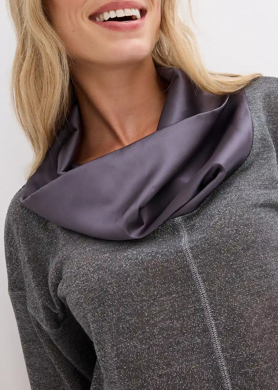 Udobno i Elegantno: Majica s dugim rukavima s nitima sjaja i elegantnim sjajnim ovratnikom od satena
