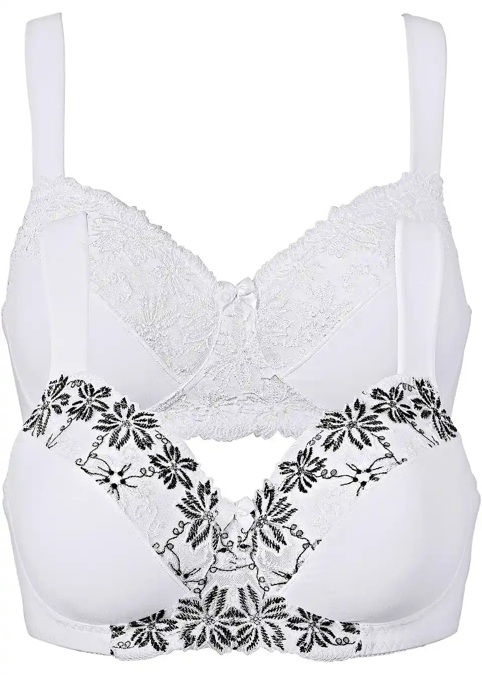 Ovaj privlačan grudnjak bez žice marke bpc selection ukrašen je umjetničkim vezom na gornjem rubu košarica. Široke, podstavljene naramenice olakšavaju ramena i ne urezuju se u kožu. Elastična traka ispod grudi osigurava ugodnu potporu i osjećaj sigurnosti. Grudnjak dolazi u praktičnom pakiranju od dva komada.