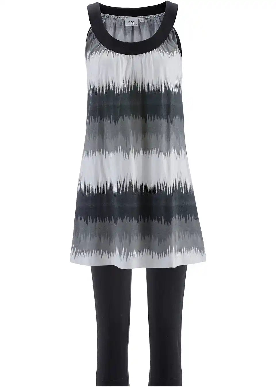 Sa svojim opuštenim krojem, bez rukava, haljina laska figuri. Privlači pažnju dubokim okruglim izrezom i batik izgledom. Svaka haljina je jedinstvena. Haljina je u kombinaciji s odgovarajućim tajicama u modernoj 3/4 dužini, koje upotpunjuju dvodijelni set iz bpc kolekcije. Sandale ili sandalete čine udobnu dnevnu kombinaciju kompletnom.