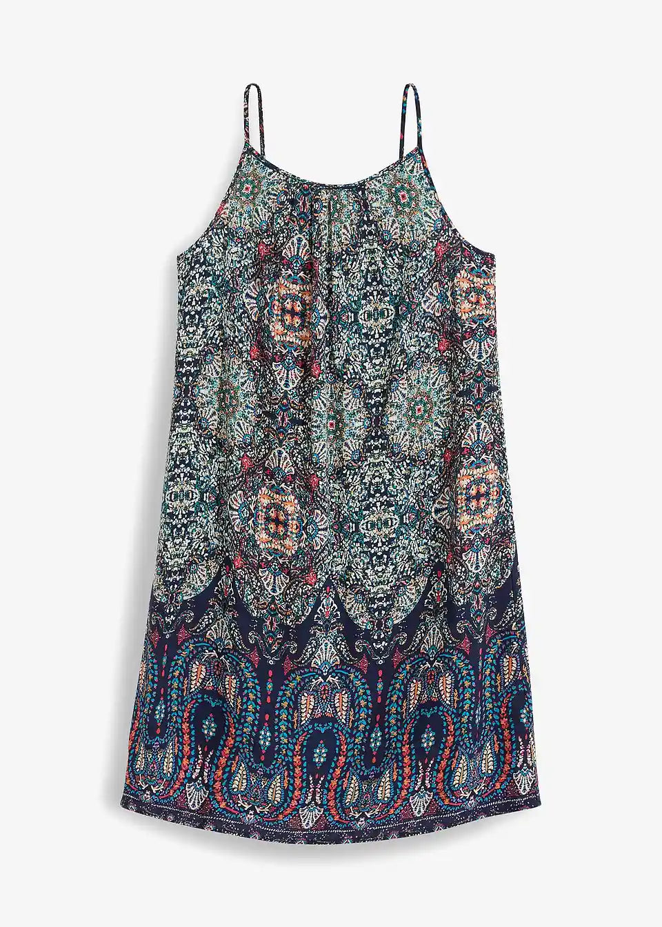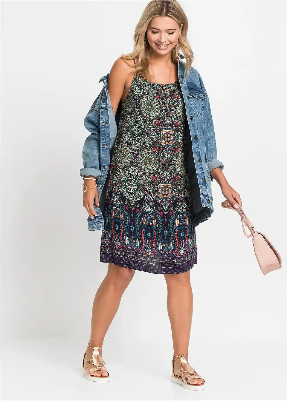 Ova lepršava haljina koja lagano obavija tijelo čini osnovu za mnoge modne kombinacije. Fini sandali s aplikacijama, višeslojni nakit i torba od rafije stvaraju moderan boho-stil. Model s okruglim izrezom i podesivim tankim naramenicama izgleda opušteno u kombinaciji s jaknom od trapera s otiscima. Za rokerski dojam kombinirajte je s jaknom od imitacije kože i čizmama.