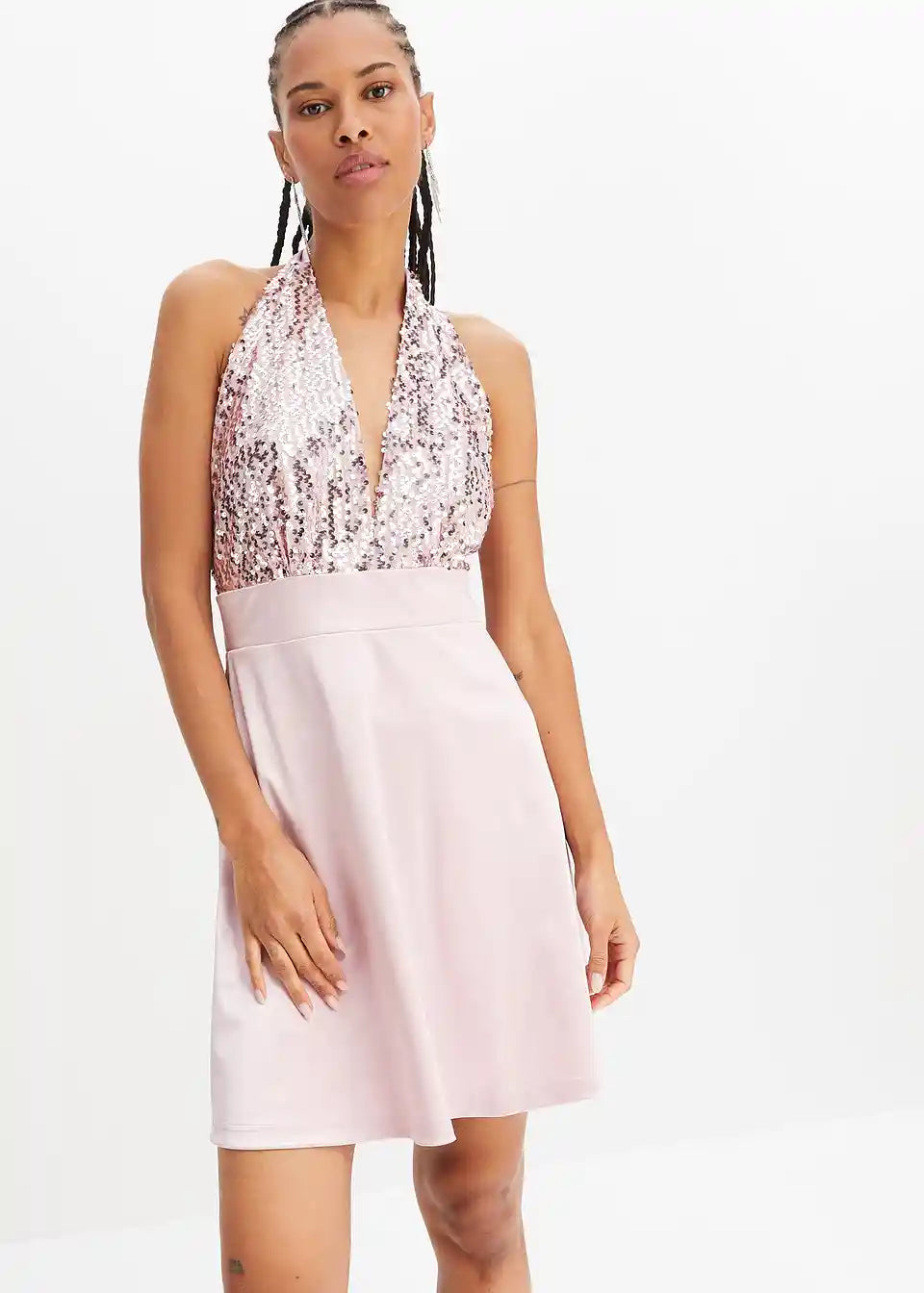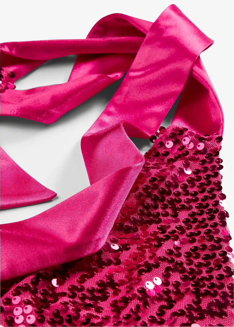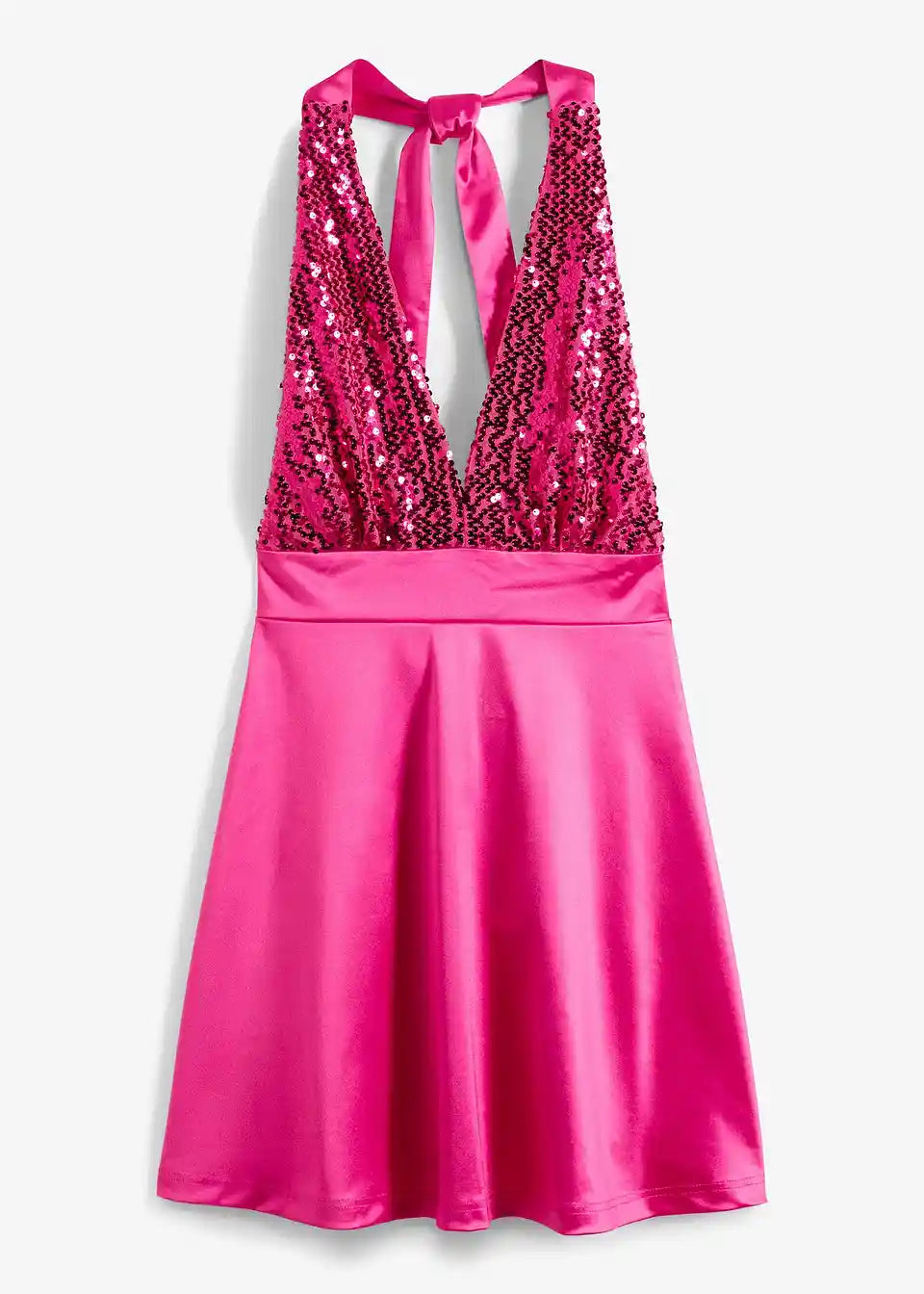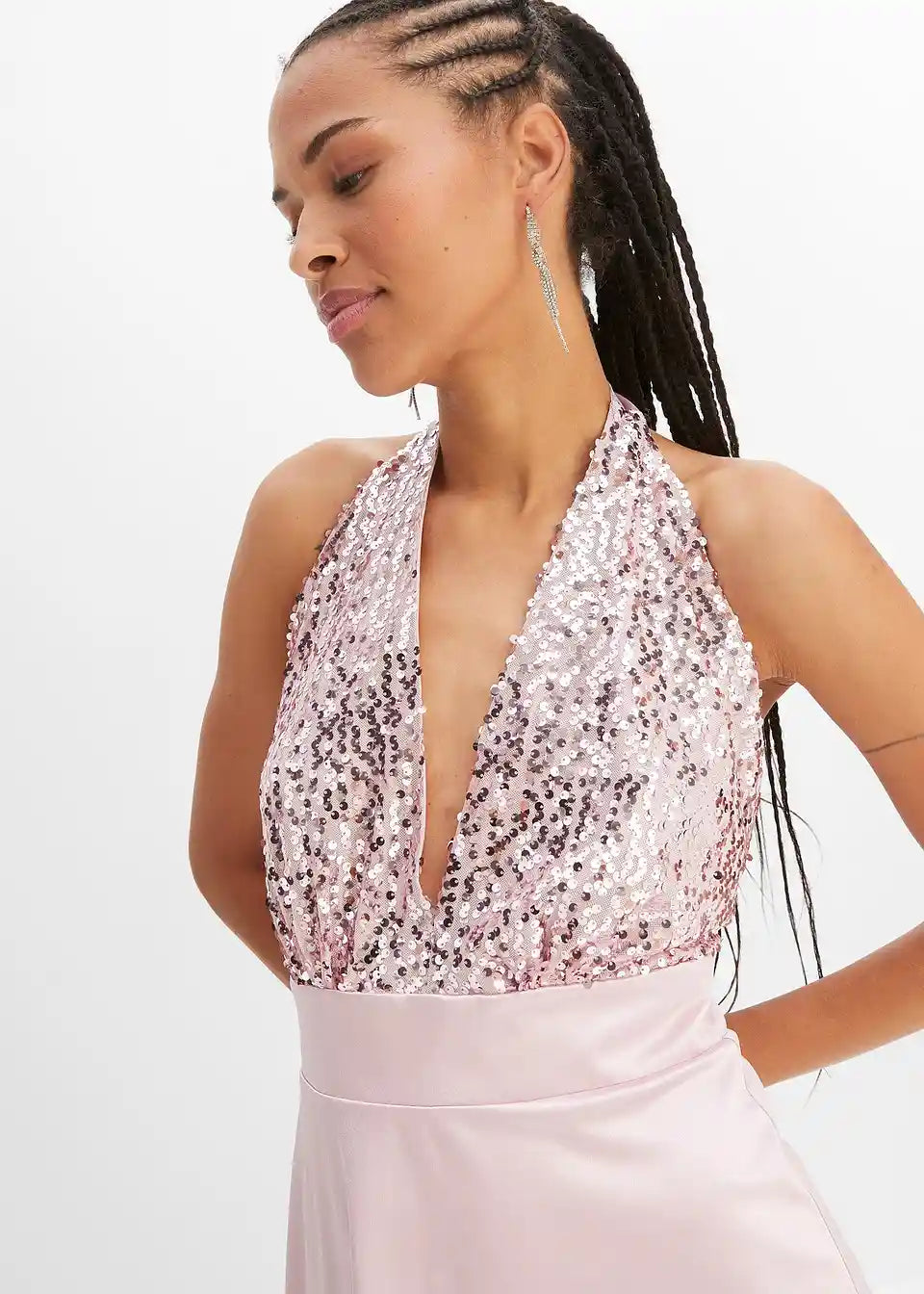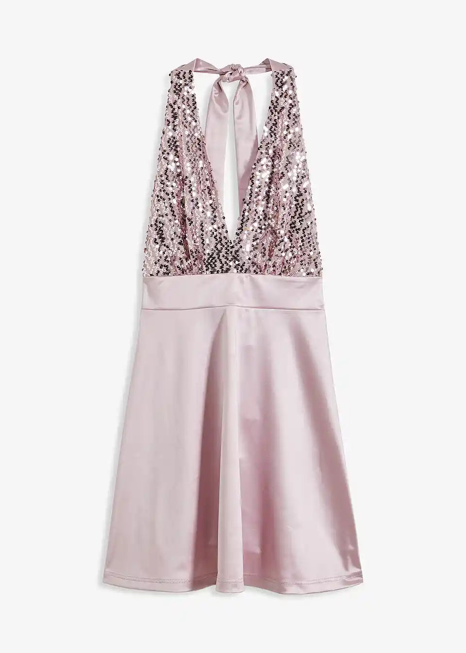 Moderno i ženstveno: Party haljina s šljokicama u gornjem dijelu i satenskom suknjom, s dubokim izrezom i detaljem oko vrata, čini ovu haljinu pravim privlačiteljem pogleda.
