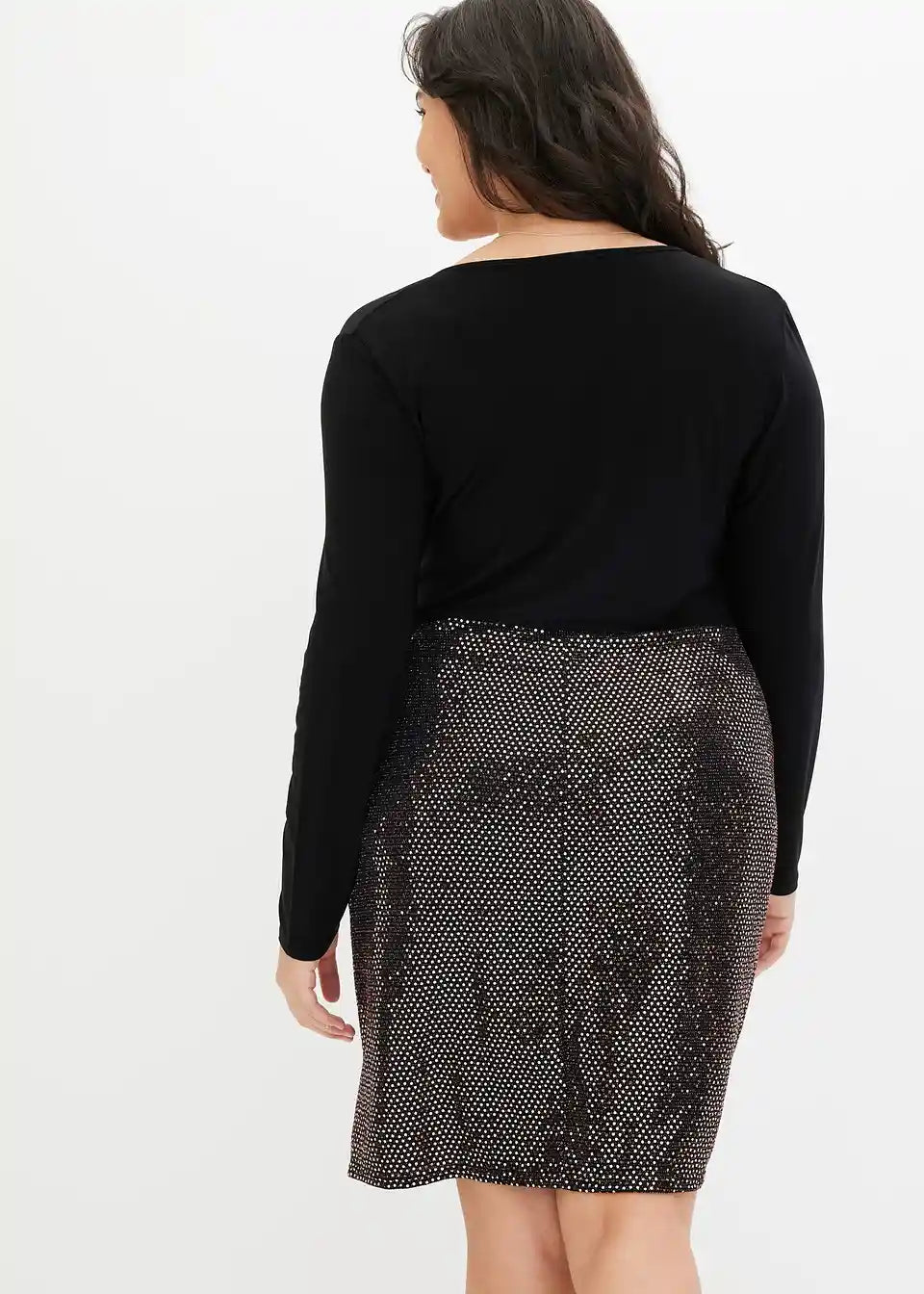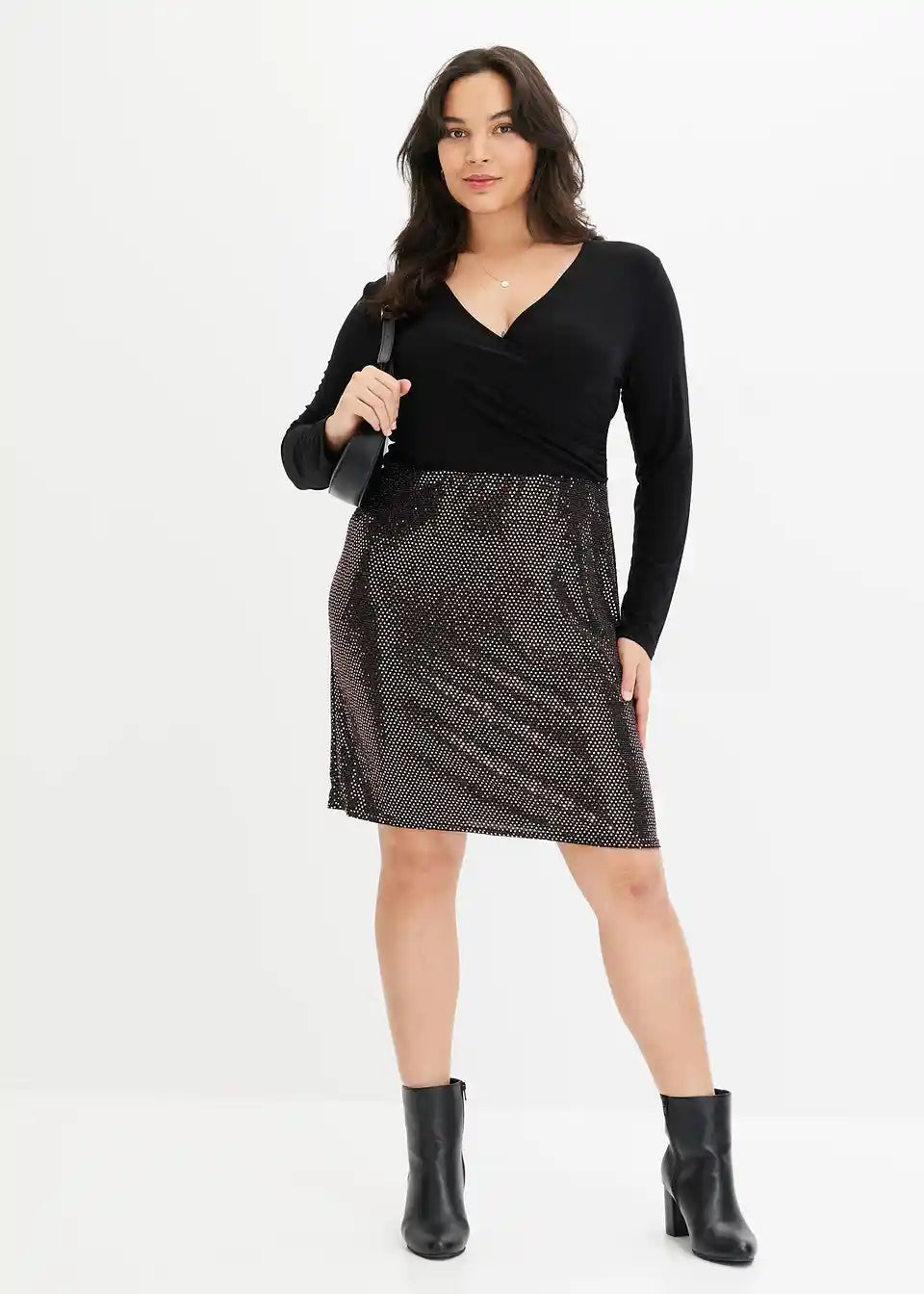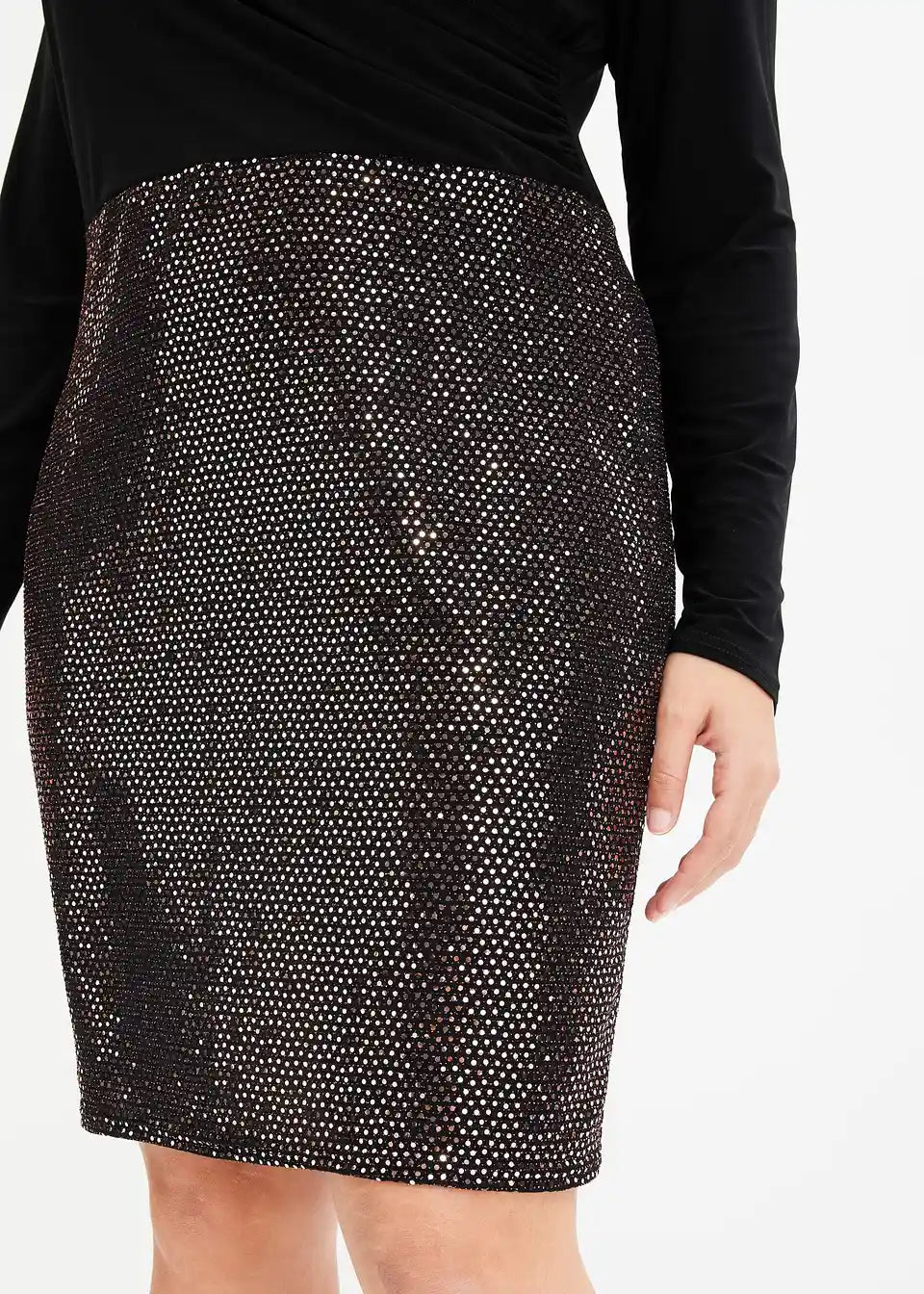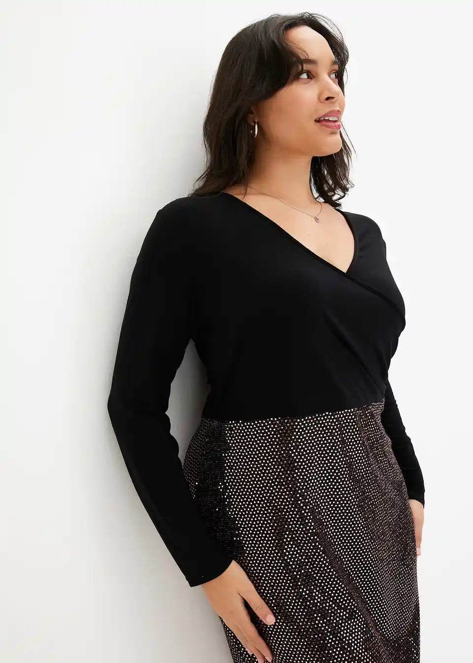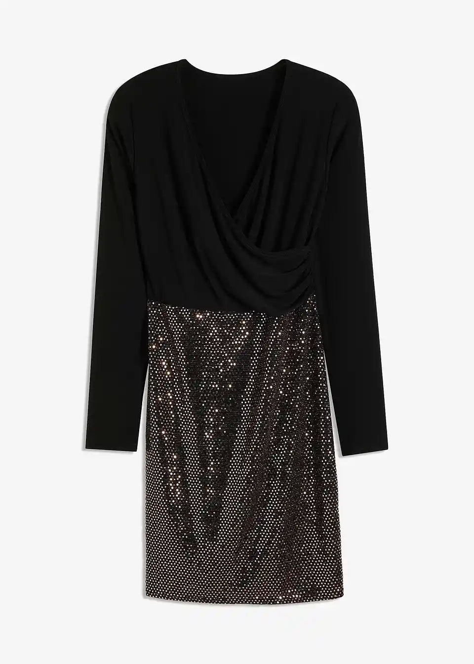 moderna haljina s pajetama na suknji i dubokim V-izrezom sprijeda