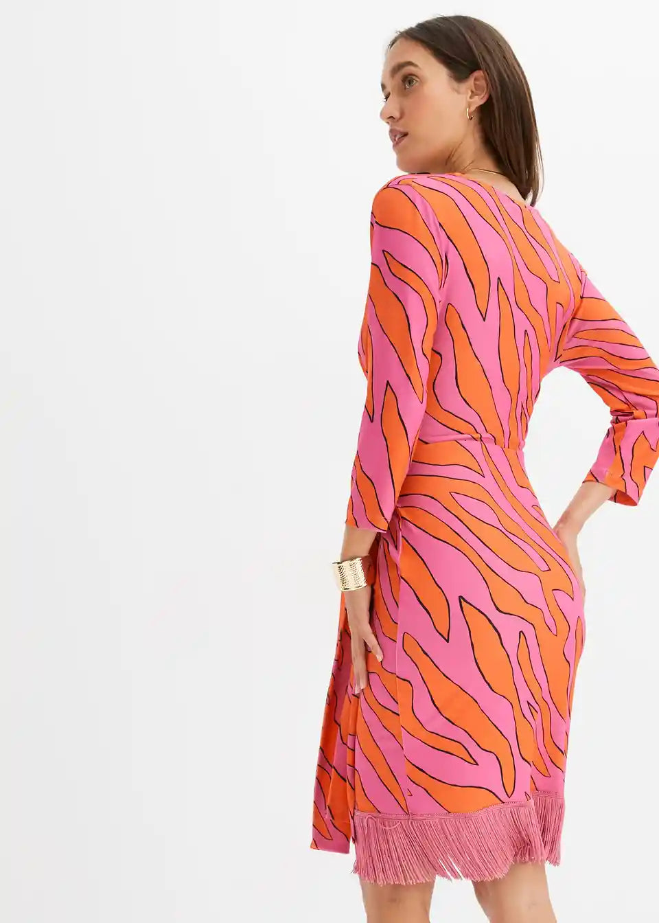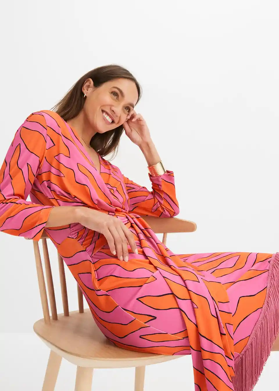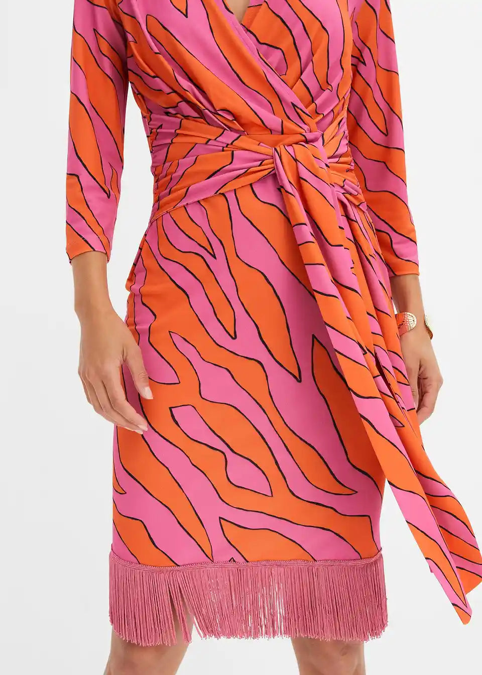 Jersey haljina u wrap izgledu s vezanjem u struku i resicama na suknji.