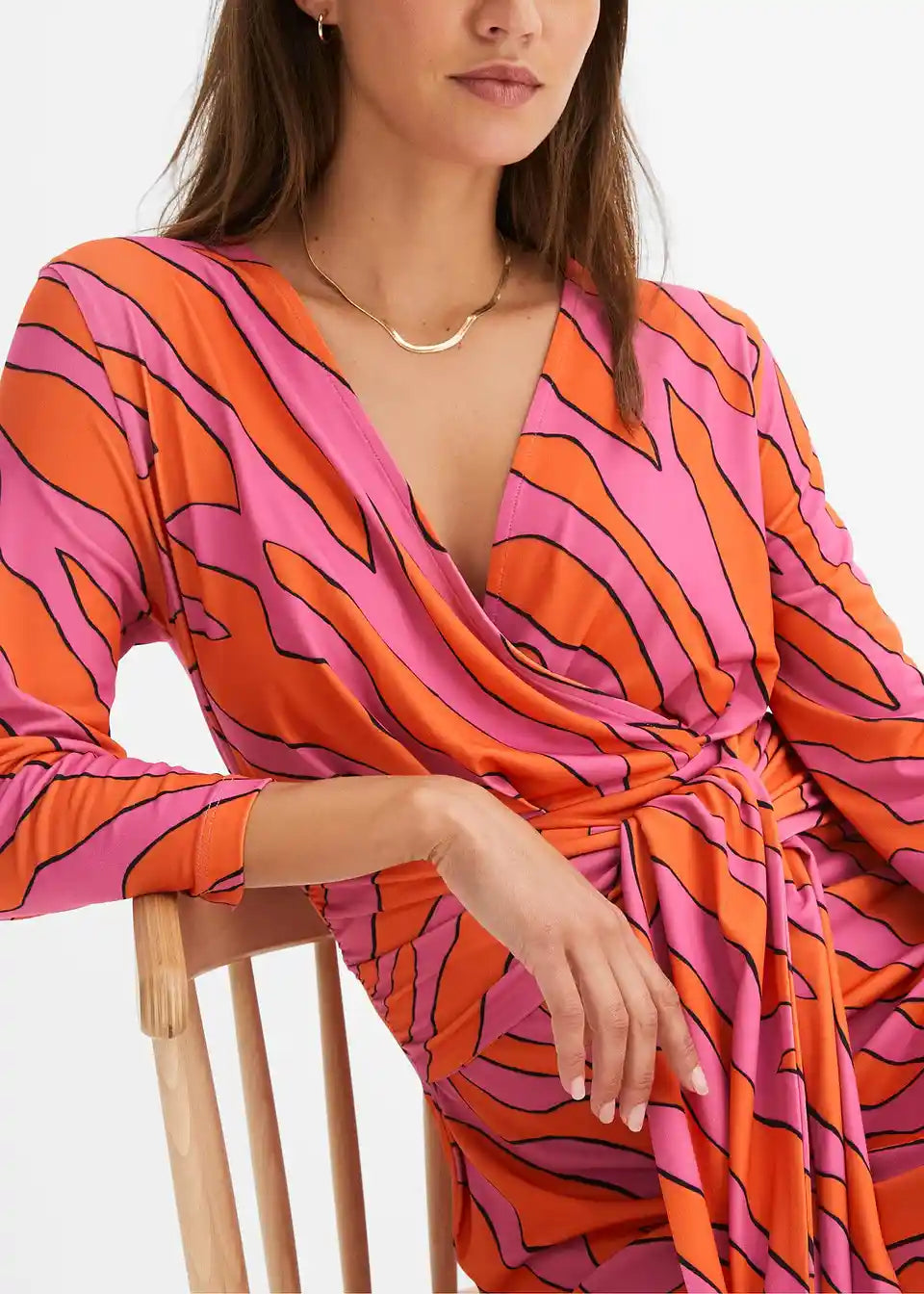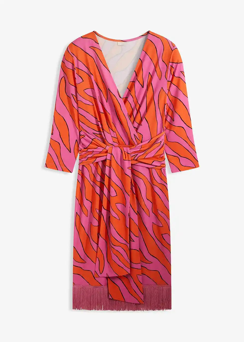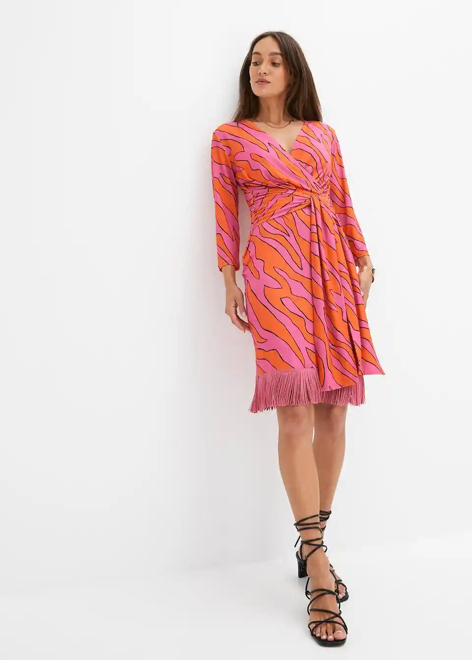 Jersey haljina u wrap izgledu s vezanjem u struku i resicama na suknji.
