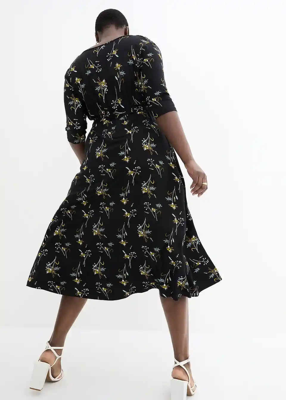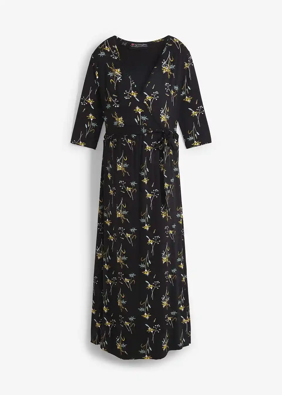 Haljina do listova izrađena od mekog viskoznog pletiva s 3/4 rukavima i odvojivim pojasom za vezanje ispod grudi. Preklopni izrez omogućava jednostavno dojenje.