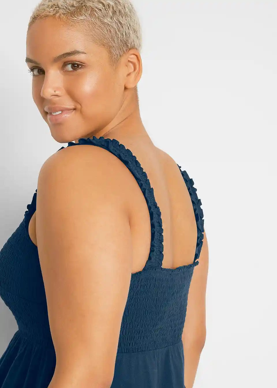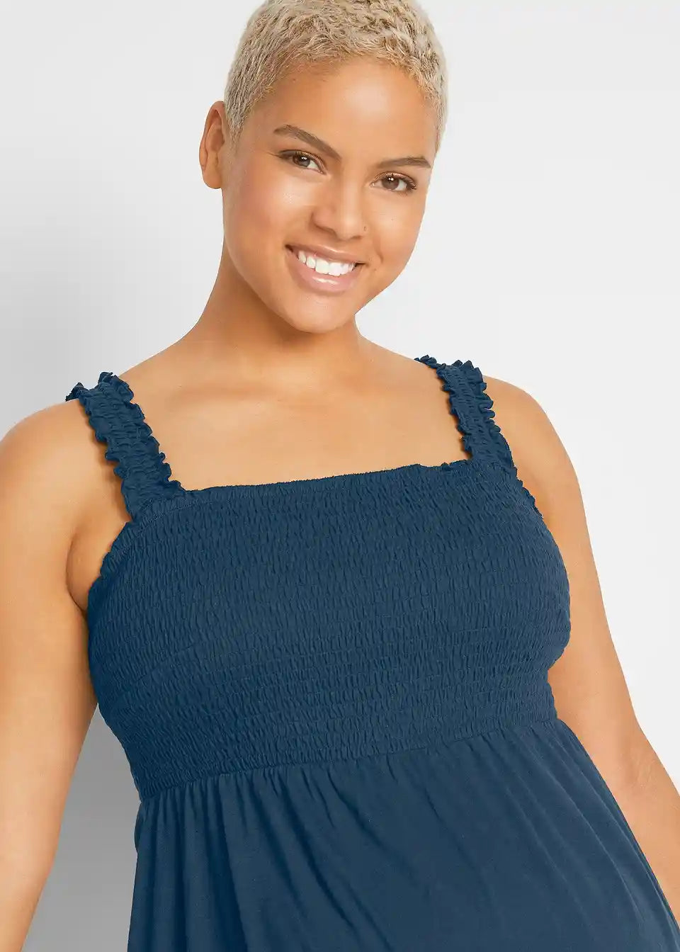 Kratka haljina za trudnice s naboranim naramenicama i predjelom grudi. Naborani dijelovi daju dodatnu elastičnost, a kroj pod prsima pruža dovoljno prostora za rast trbuha.