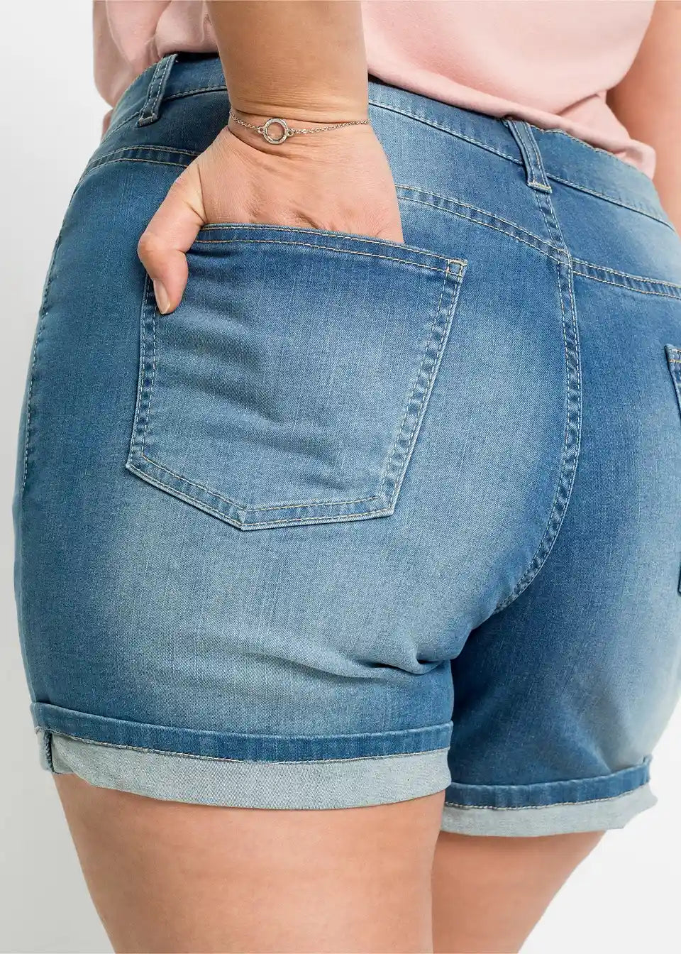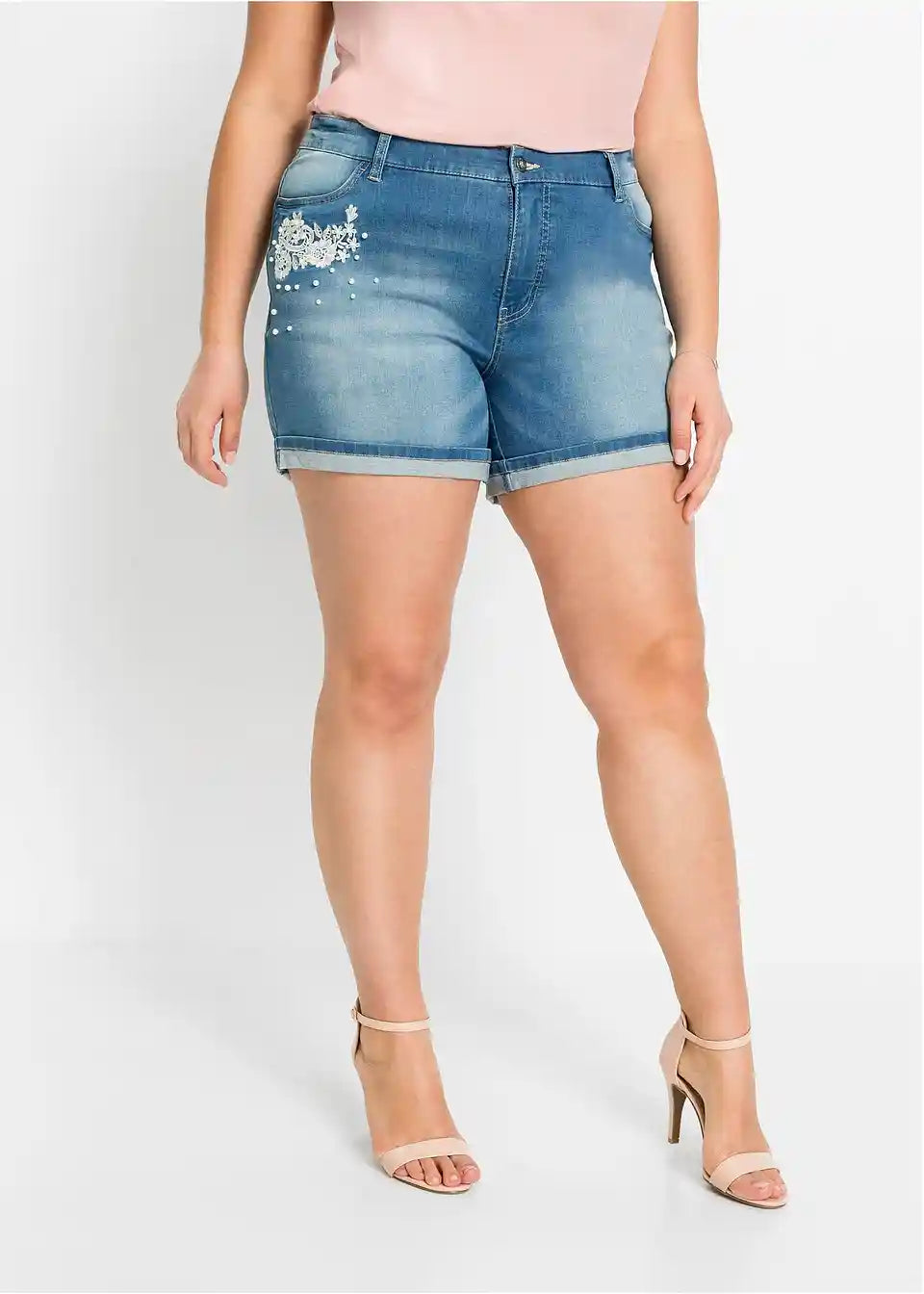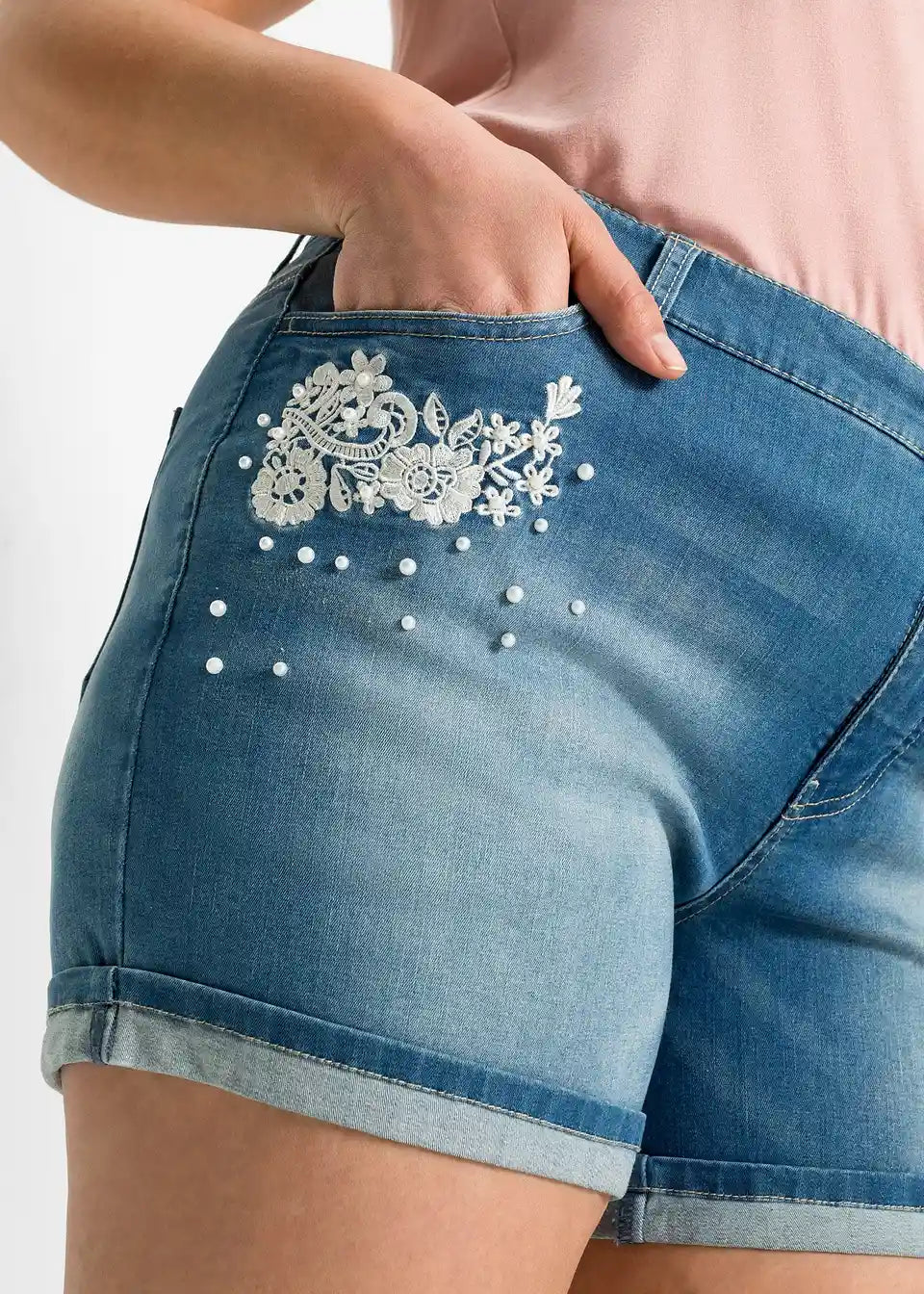 Ljetne traper kratke hlače sa stiliziranim čipkastim umetkom i ukrasima od perlica.