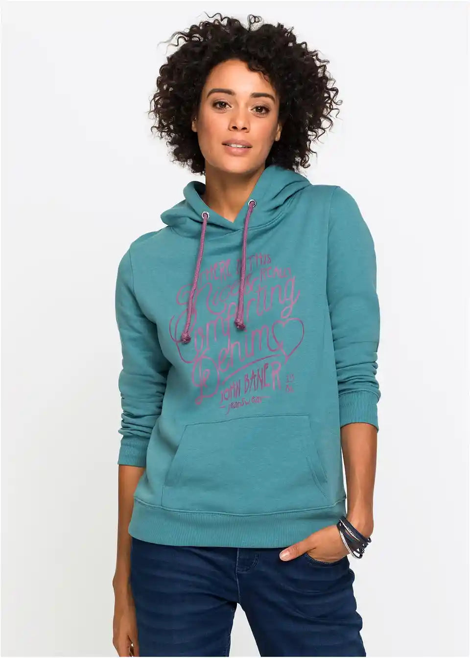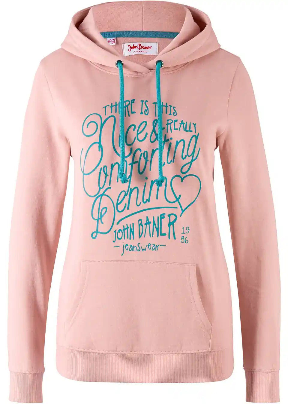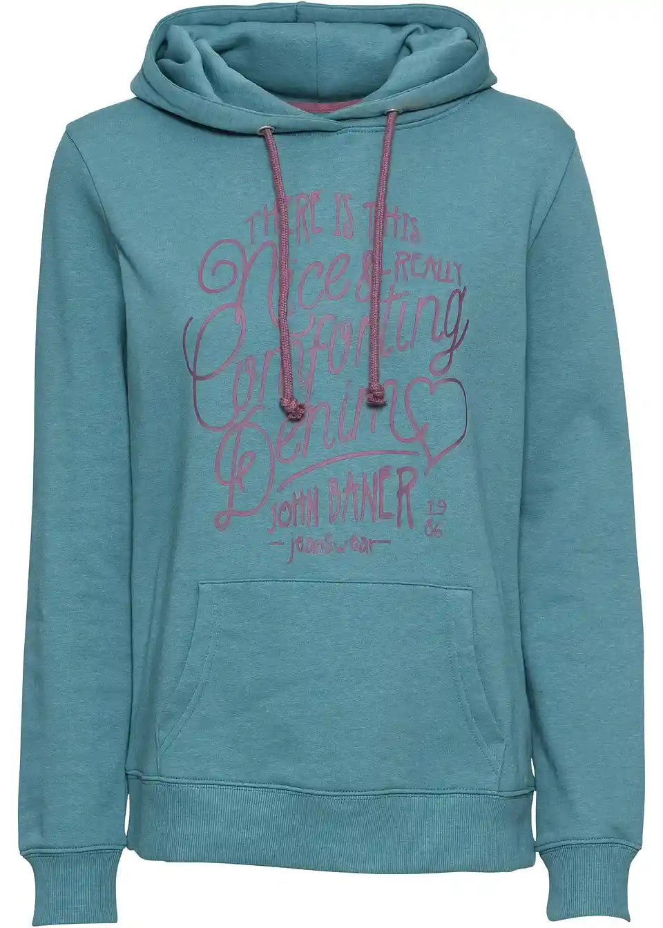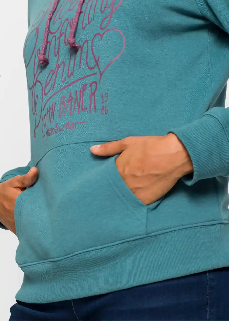 Omiljeni komad za žene koje vole sportski stil – ovaj duks s kapuljačom s printom. Upadljiv natpis u kontrastnoj boji i veliki klokan džep sprijeda daju majici Johna Banera opušten izgled. Kapuljača se može prilagoditi u širini pomoću vezice.
