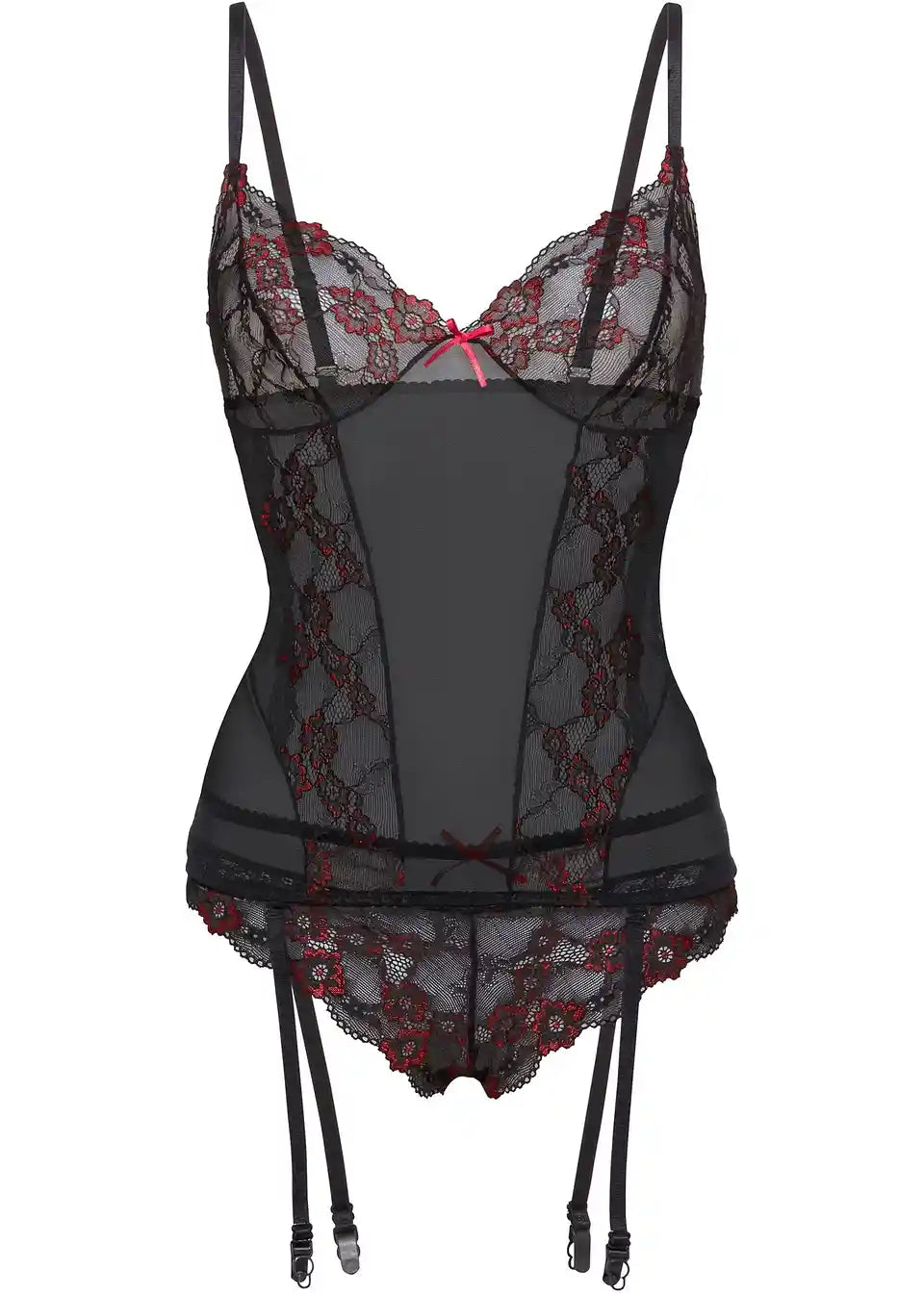 Pravi čarobni privlačitelj pogleda! Korzetić se nježno prilagođava vašim oblinama i ukrašava vaš dekolte finom čipkom. Dvobojna kombinacija daje stilu moderan naglasak. Pripadajuće tange upotpunjuju outfit. Kombiniran s crnim čarapama s podvezicama i visokim petama, outfit postaje savršen. Stil je dostupan i u većim veličinama.