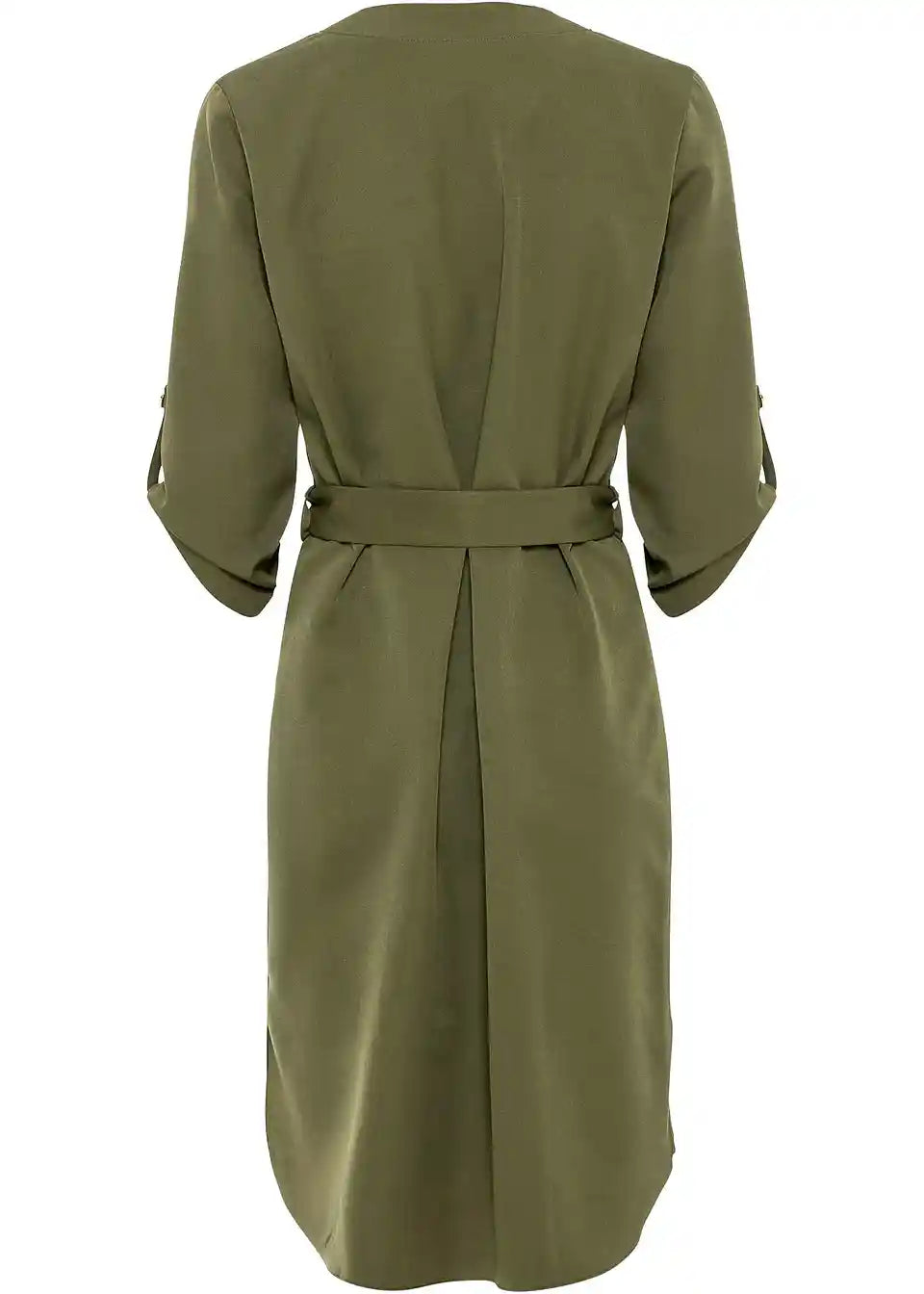 Sa svim detaljima košuljaste haljine: džepovima na grudima, stojećom kragnom, polu-dugmadima, pojasom za vezanje u struku. Podesivi rukavi koji se mogu zavrnuti. Duljina u veličini 42 cca 106 cm.