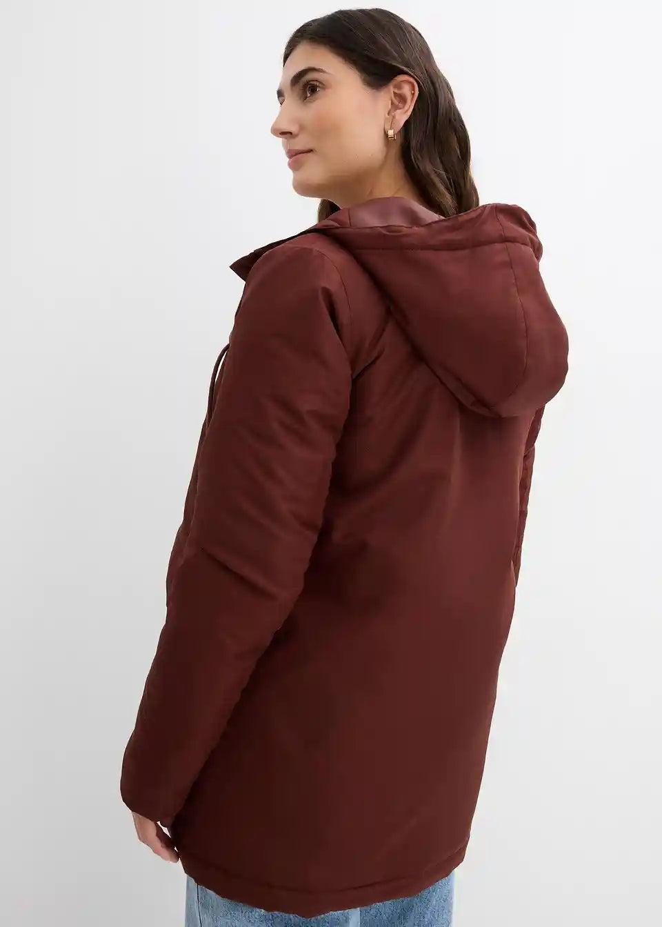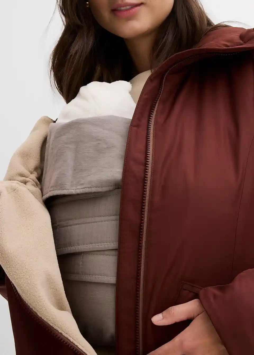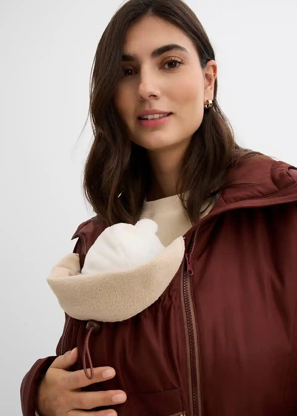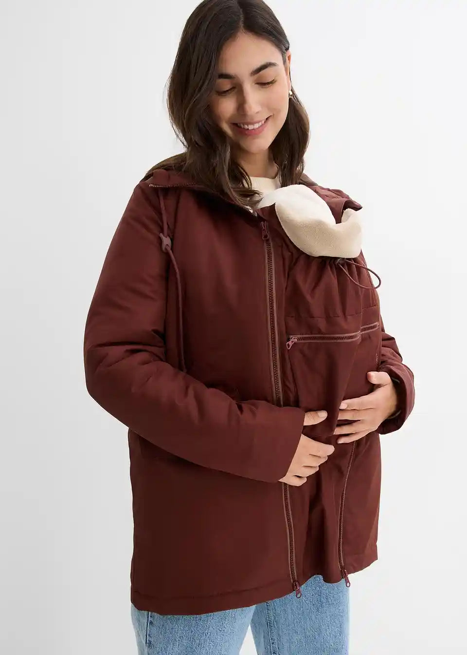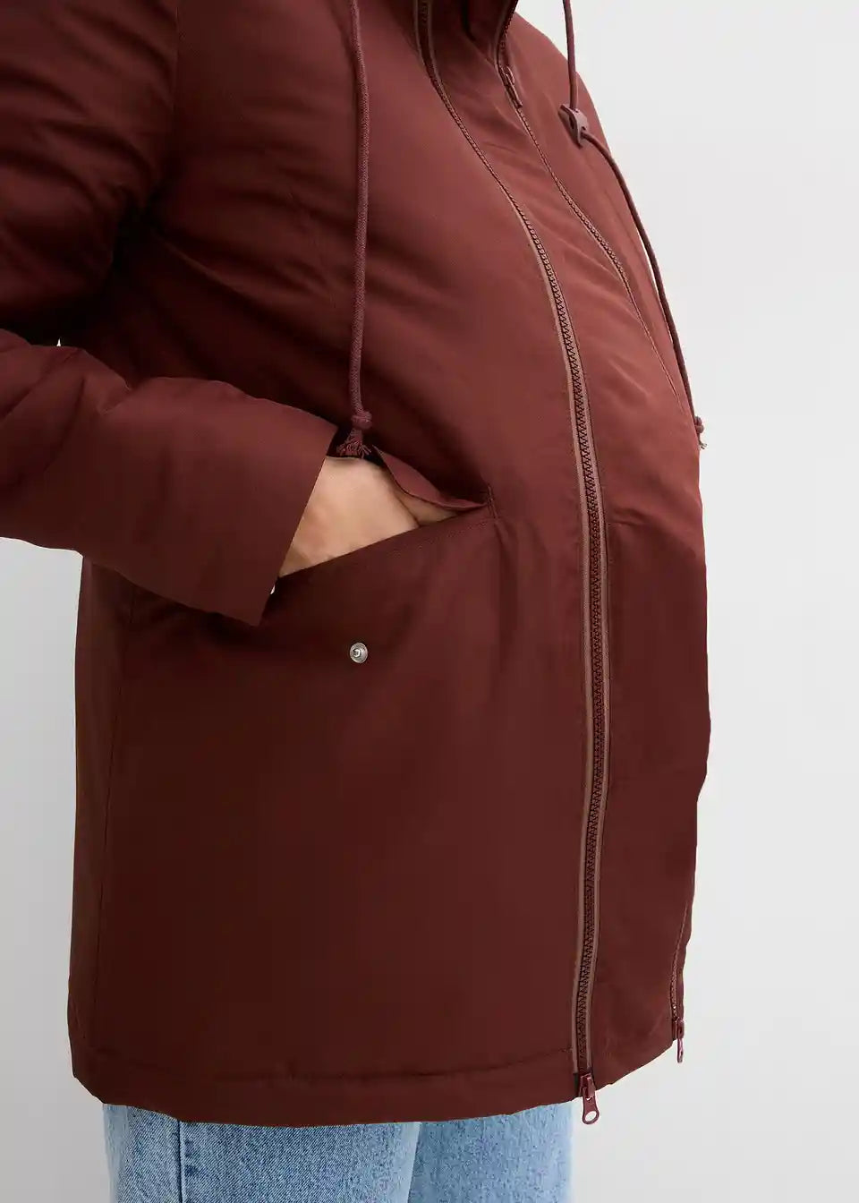 Lagana funkcionalna jakna otporna na kišu i vjetar s dva umetka: umetkom za proširenje tijekom trudnoće i umetkom za nošenje bebe. Umetak za nošenje podstavljen je mekanim Teddy flisom i ima praktičan džep za dječju opremu. Velika kapuljača opremljena je uzicama i štitnikom od kiše. S dva velika džepa s preklopom sprijeda.