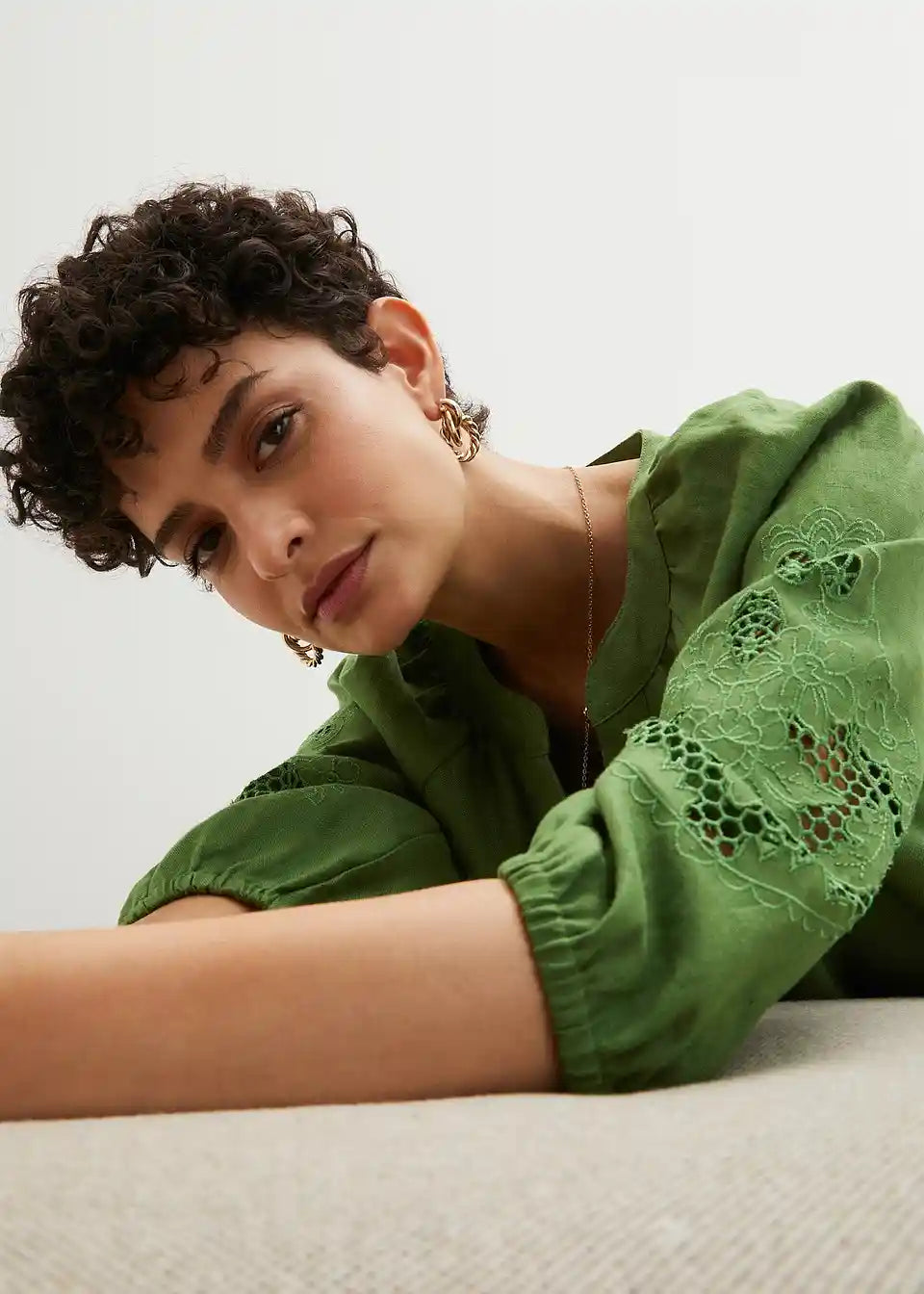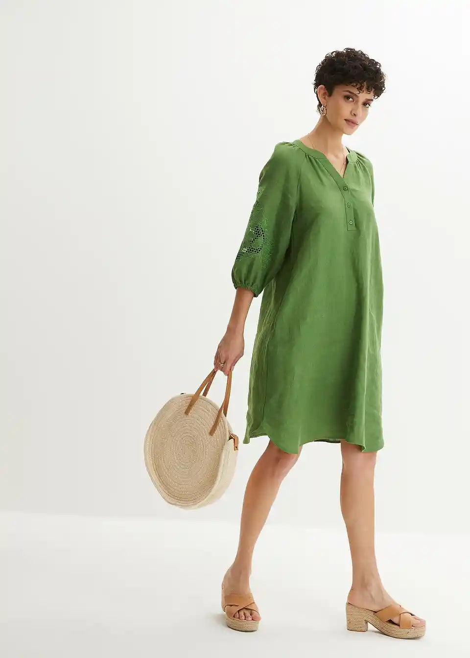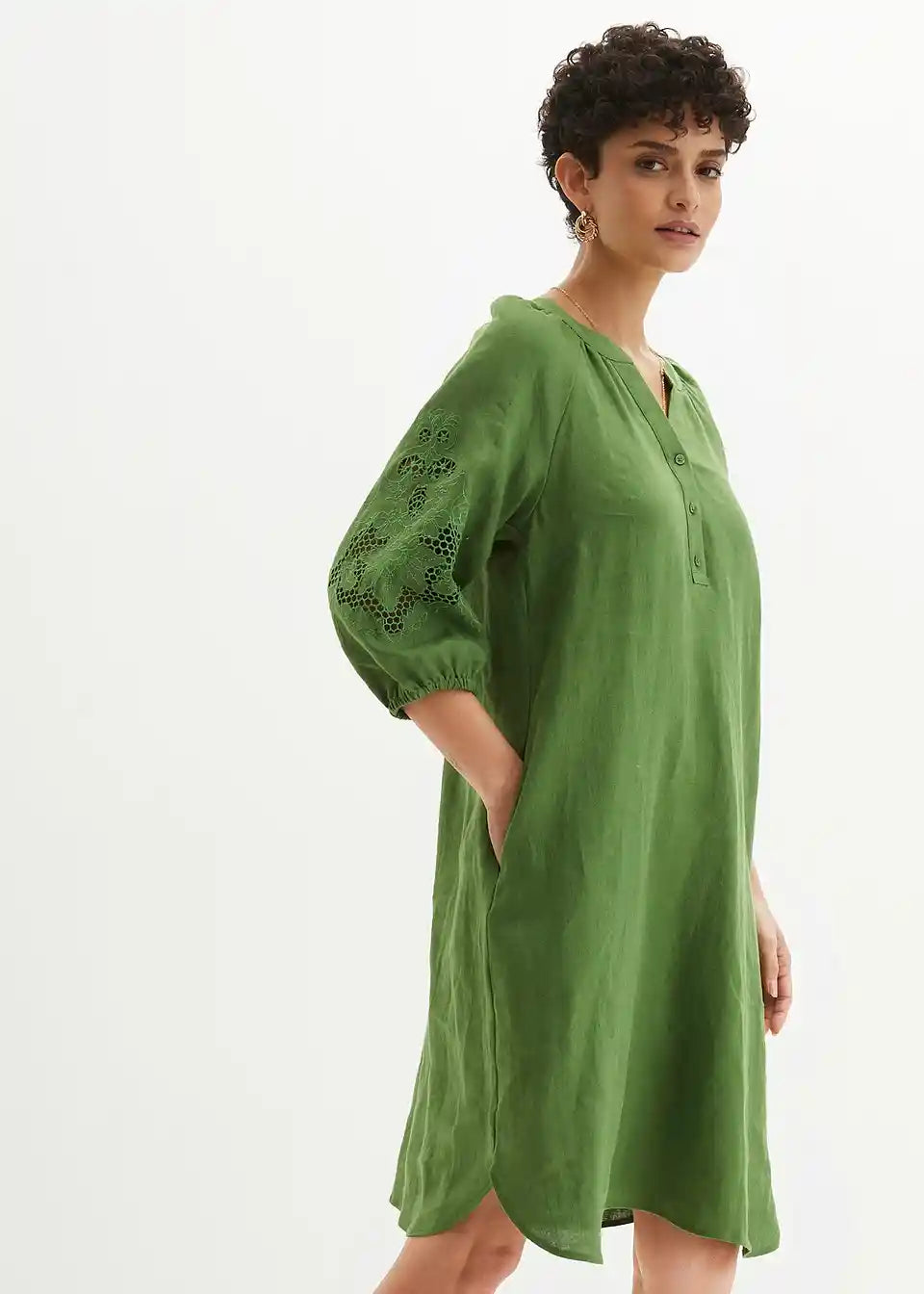 Ljetna lanena haljina s rupičastim vezom na rukavima