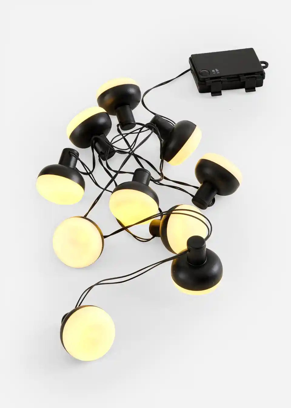Ovaj moderan svjetlosni lanac donosi svjež, suvremen izgled u svaki prostor. Kombinacija crnih i bijelih sjenila za lampe stvara zanimljiv kontrast i živahnu atmosferu. Idealno za svečane prigode ili opuštajuće večeri, stvara ugodan ambijent i postavlja kreativne naglaske u unutarnjim i vanjskim prostorima. Fleksibilna upotreba svjetlosnog lanca omogućava kreiranje individualnih svjetlosnih koncepata i elegantno osvjetljavanje različitih područja.