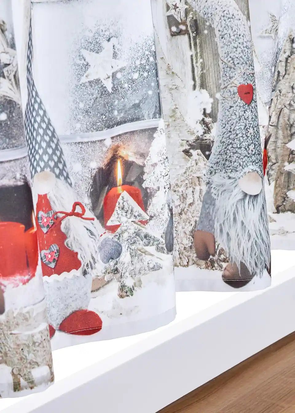 Neprozirna zavjesa za staklene površine s LED svjetlima i zimskim printom te simpatičnim Baka Mrazovima na prednjoj strani. Broj LED svjetala ovisi o naručenoj veličini (maks. 6 svjetala). Stražnja strana je bez printa, ali je opremljena LED svjetlima (odvojiva za pranje), potrebnim kabelom i džepićem za baterije. Potrebne su vam dvije standardne Micro AAA baterije (nisu uključene u isporuku).