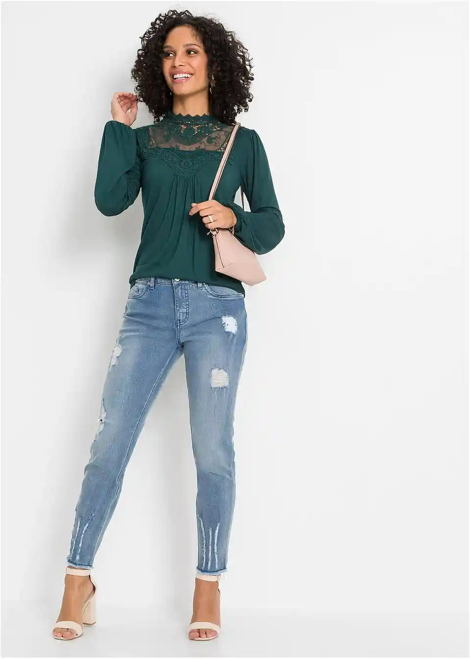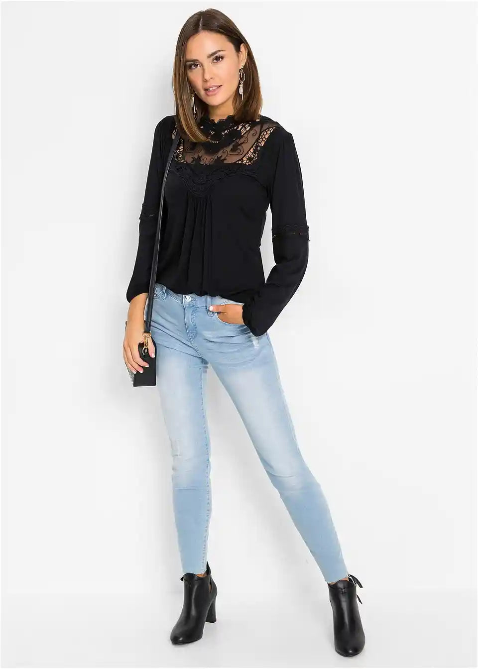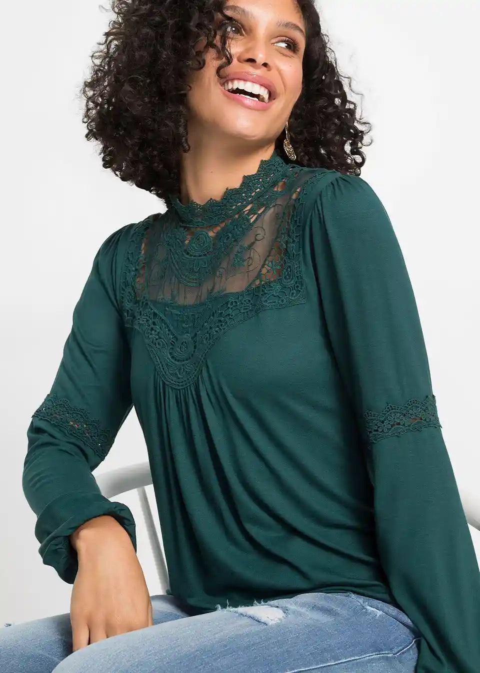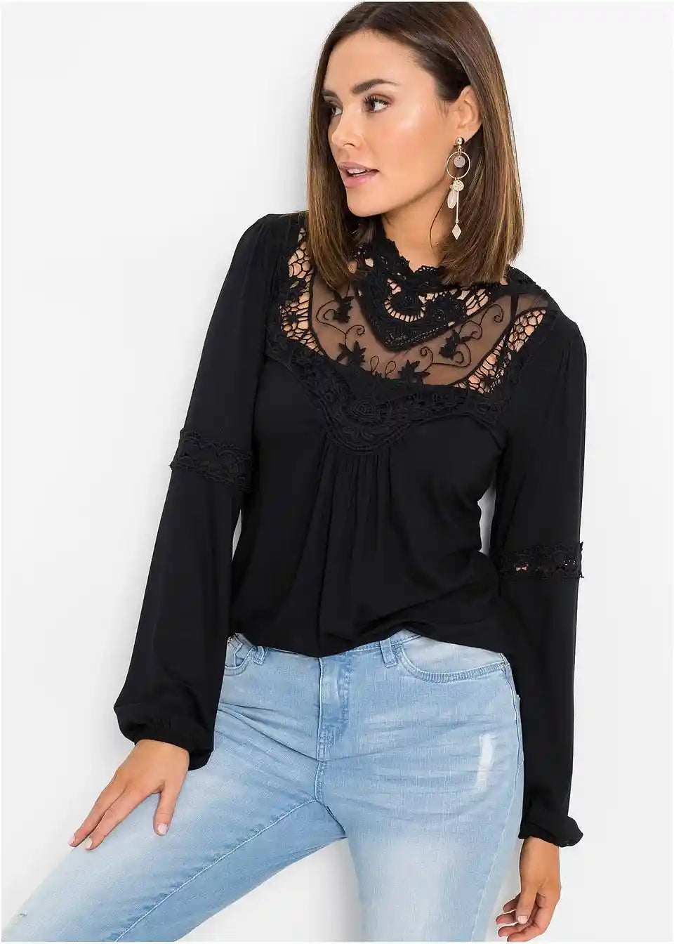Ova očaravajuća majica s čipkom odgovara boho stilu. U središtu pozornosti je profinjena čipkasta aplikacija na izrezu. Visoki ovratnik krasi bogatu aplikaciju. Mali umetci od kukičanja na rukavima zaokružuju model marke BODYFLIRT. Majica s čipkom koja lijepo naglašava figuru izgleda jednako šarmantno uz poderane traperice s podvijenim nogavicama i espadrile kao i u kombinaciji s raznobojnom suknjom maksi dužine s paisley dizajnom.