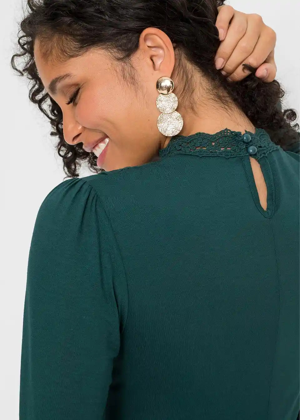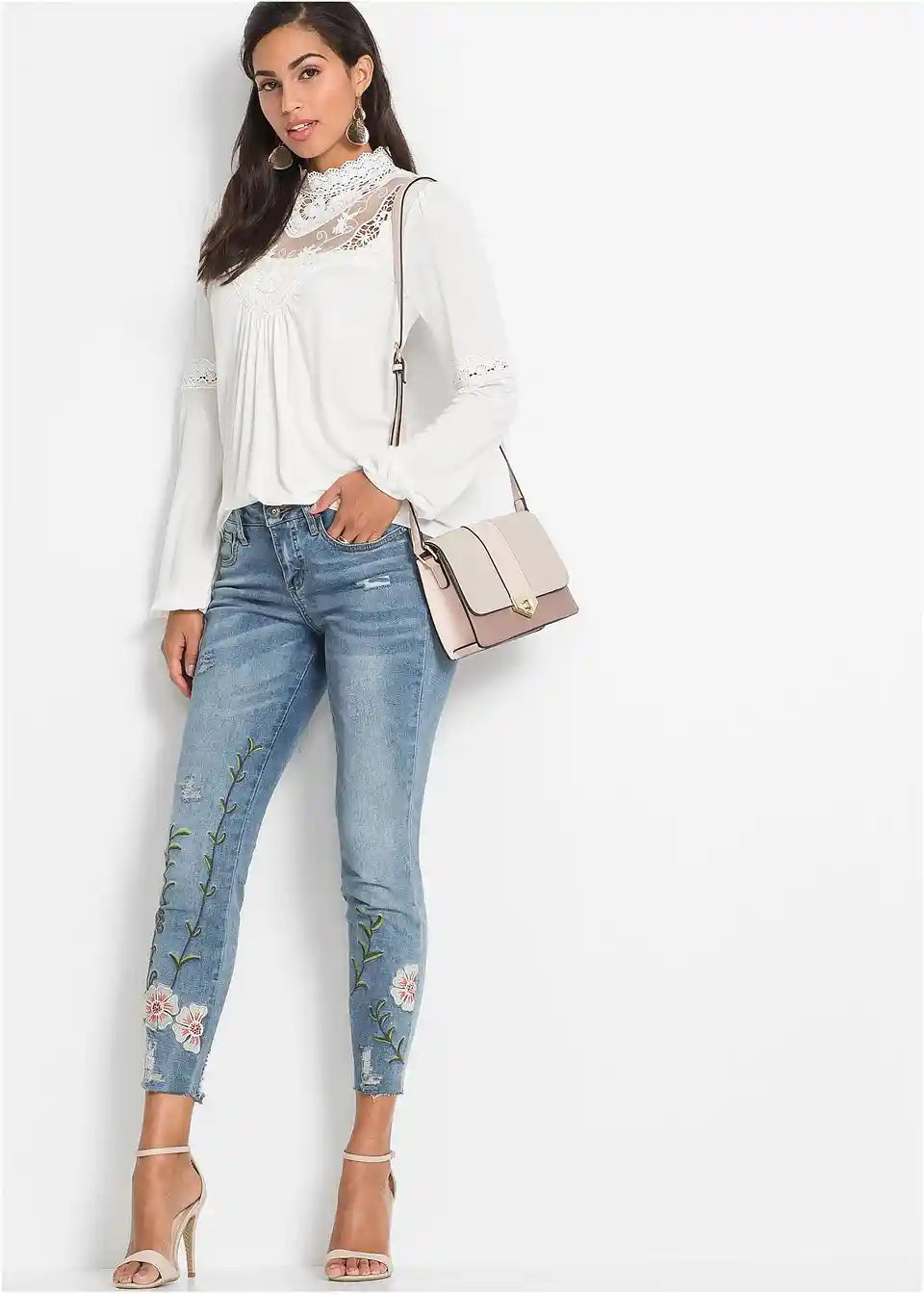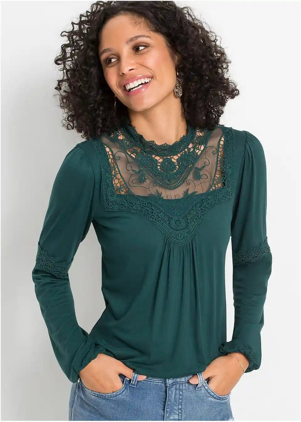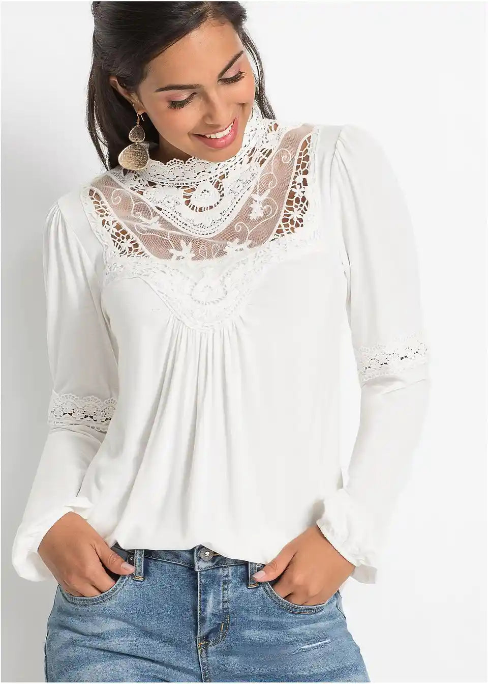Ova očaravajuća majica s čipkom odgovara boho stilu. U središtu pozornosti je profinjena čipkasta aplikacija na izrezu. Visoki ovratnik krasi bogatu aplikaciju. Mali umetci od kukičanja na rukavima zaokružuju model marke BODYFLIRT. Majica s čipkom koja lijepo naglašava figuru izgleda jednako šarmantno uz poderane traperice s podvijenim nogavicama i espadrile kao i u kombinaciji s raznobojnom suknjom maksi dužine s paisley dizajnom.