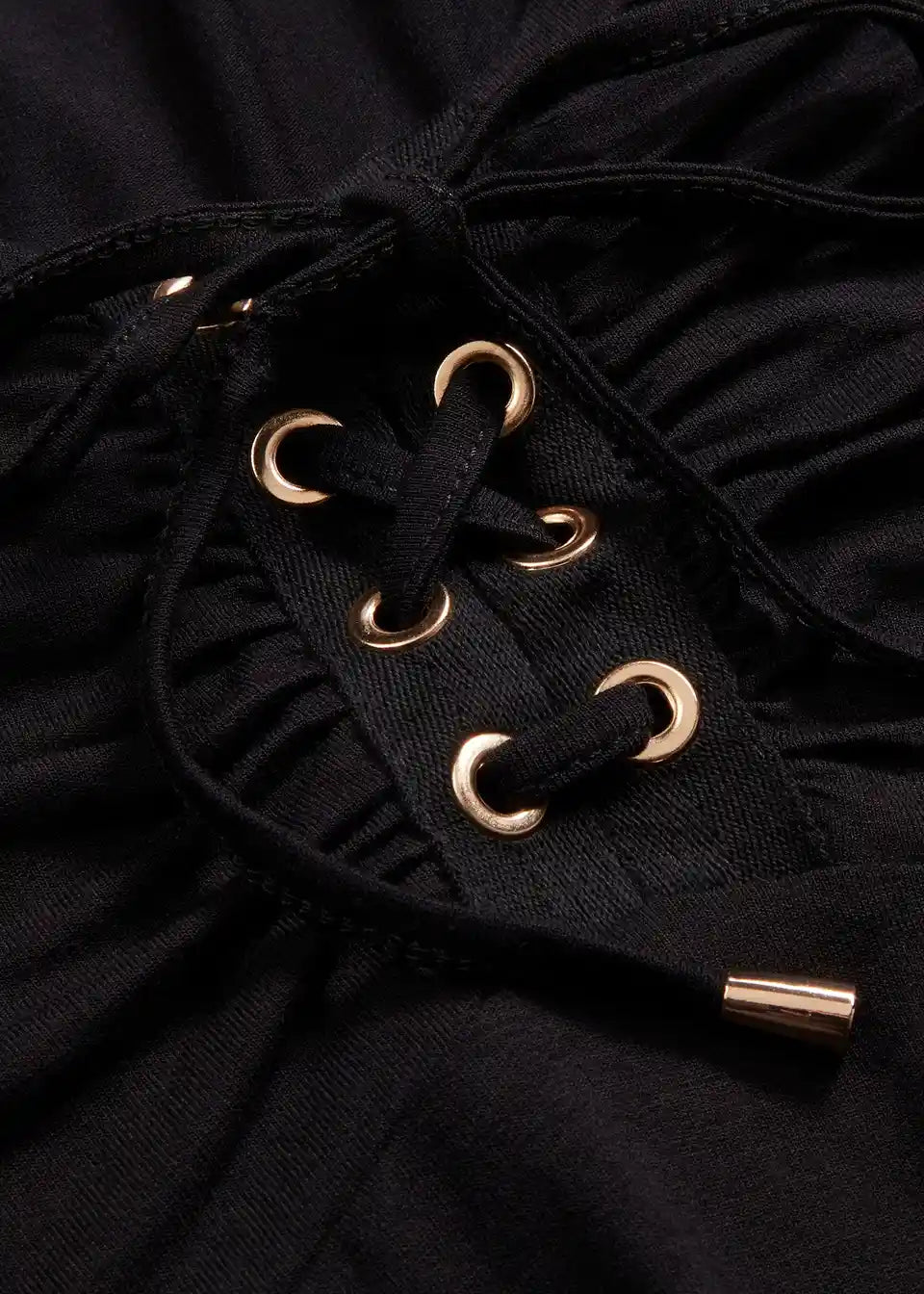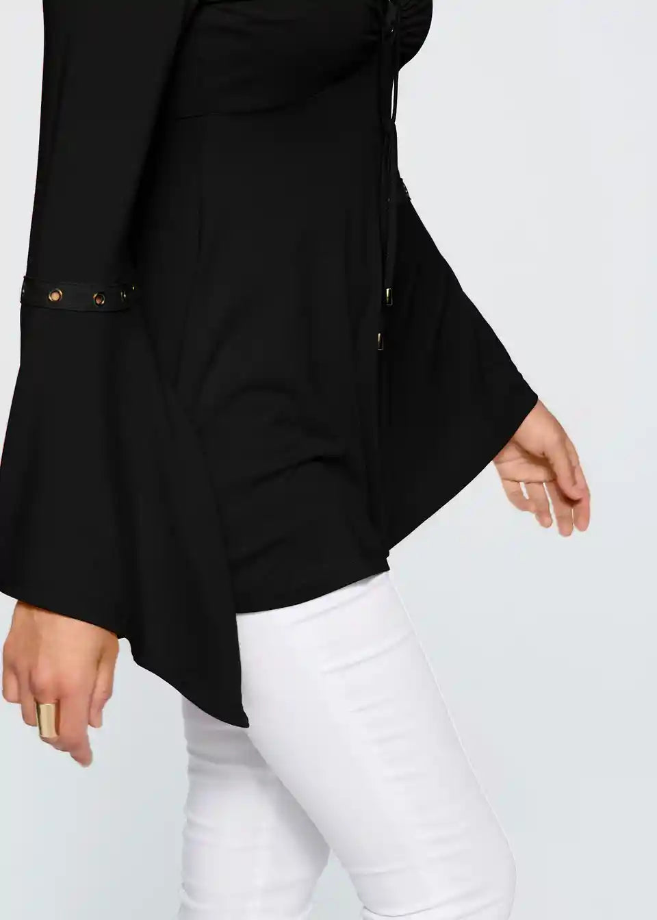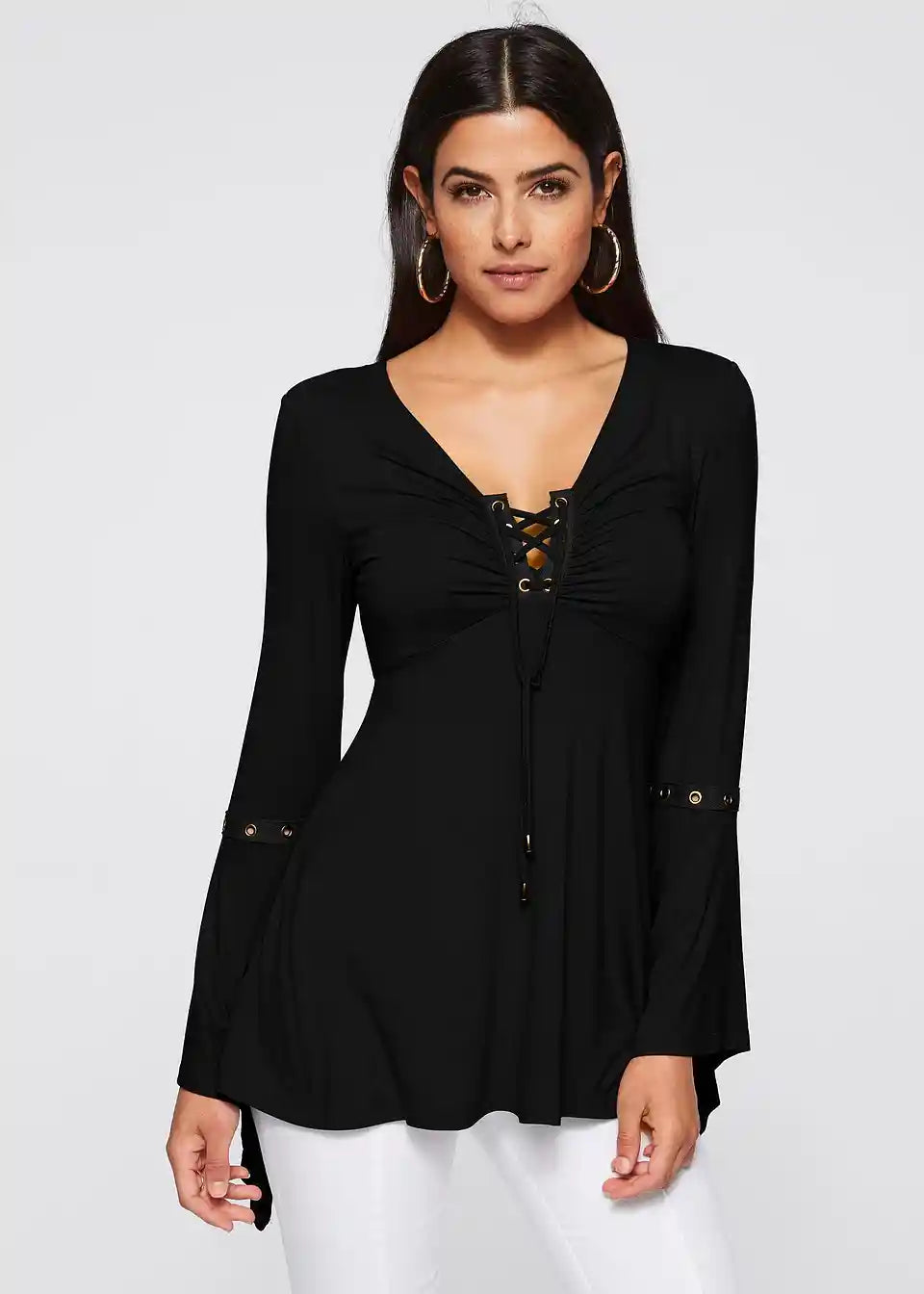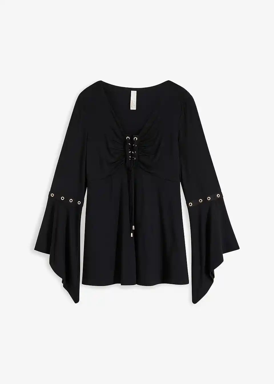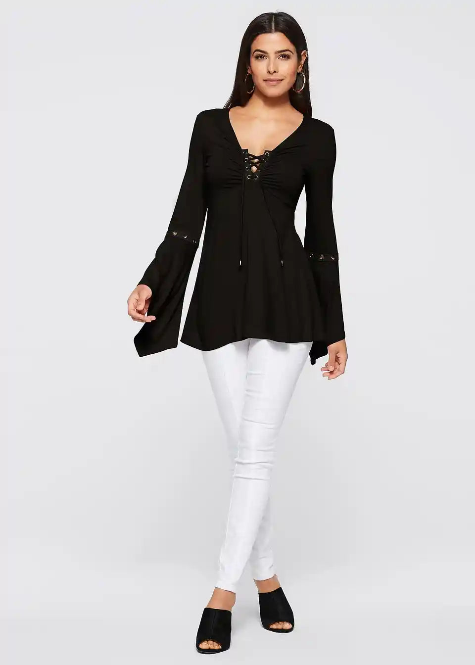 Ovaj profinjeni top s očkama i vezanjem iz kolekcije BODYFLIRT laska figuri. Elegantni model očarava spektakularnim krojem i zavodljivim detaljima: lagano je naboran u području grudi i završetak V-izreza ima upečatljivo vezanje. Dugi trumpet rukavi sa zakrivljenim rubom oduševljavaju očkama visine lakta.