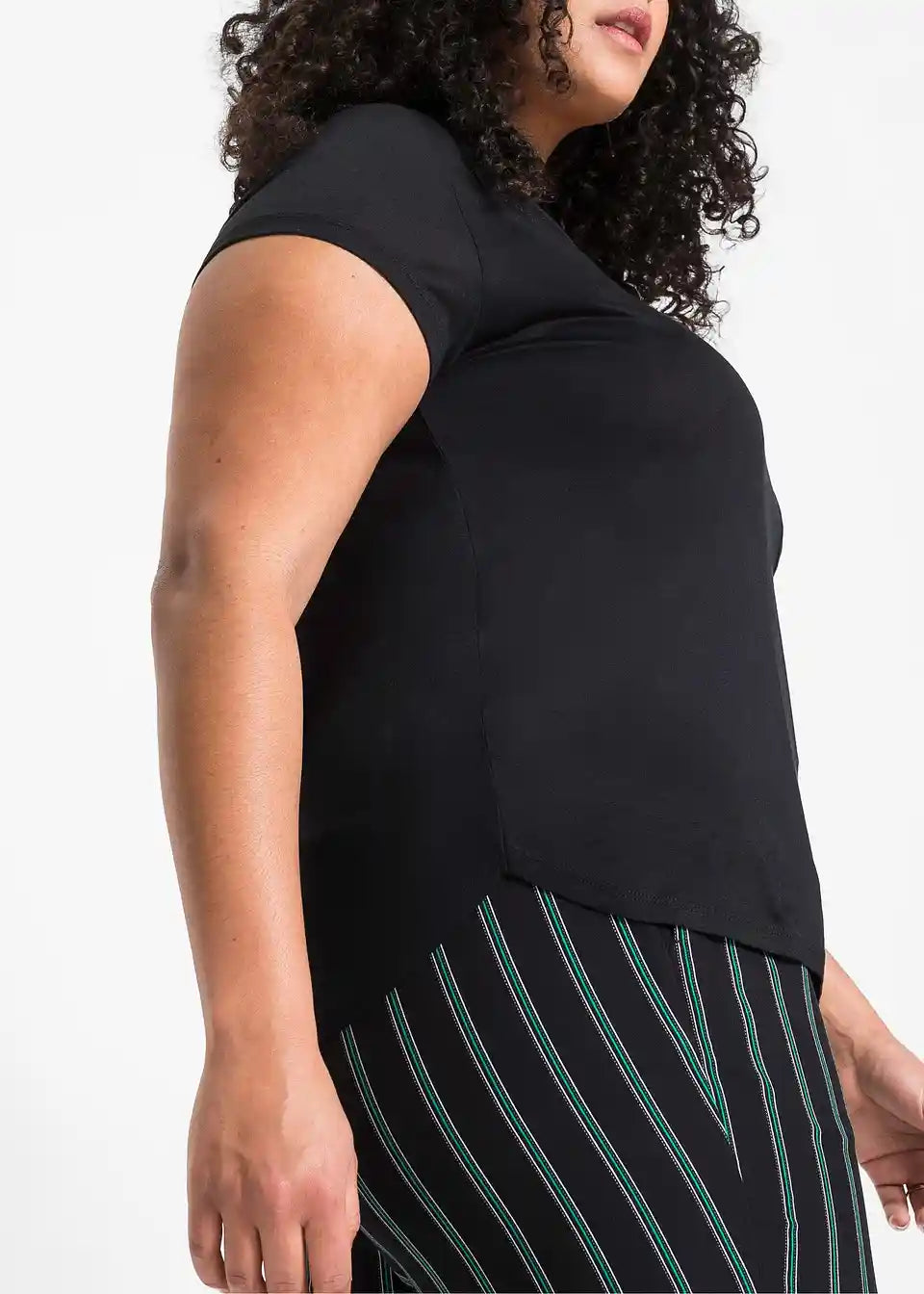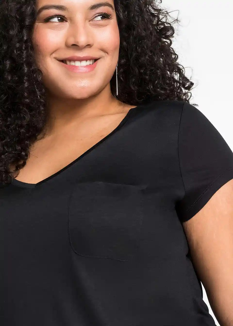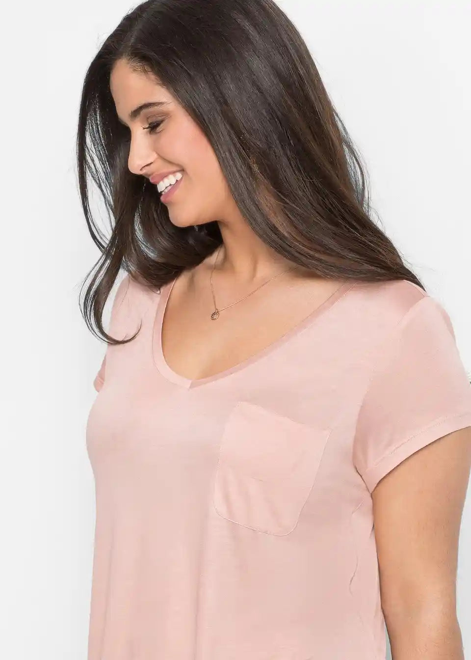 Prekrasna majica s lagano sjajnim materijalom, diskretnim V-izrezom, zaobljenim rubom i malim džepom na prsima. Duljina u veličini 36/38 otprilike 64 cm.
